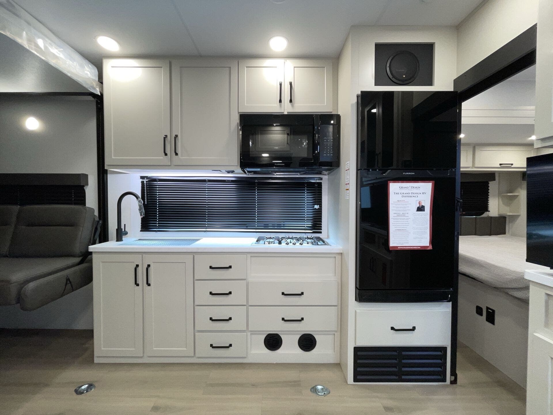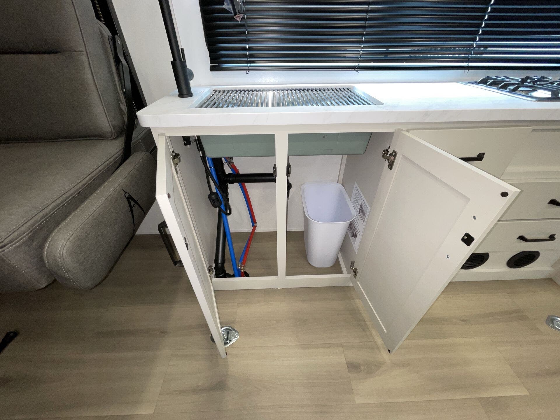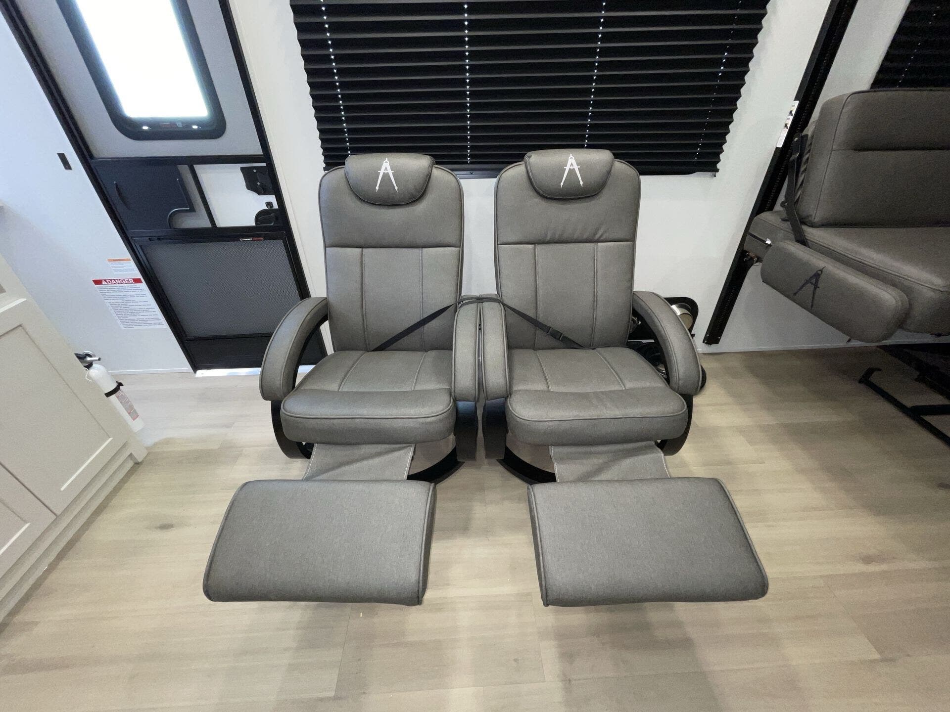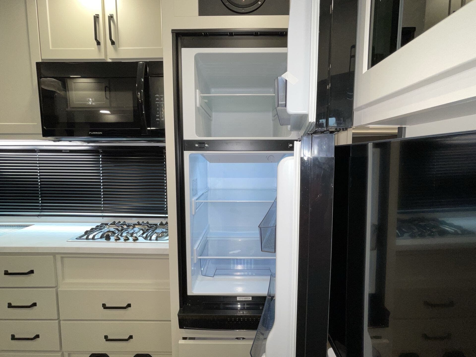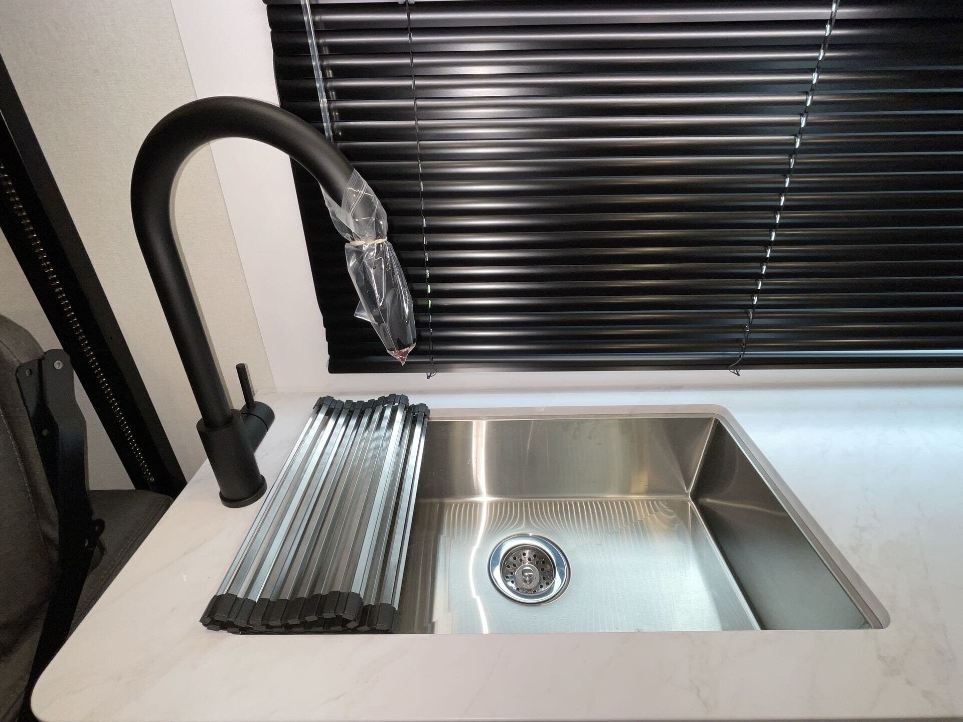 Inside, the smart floorplan combines comfort and flexibility. The garage area easily converts into a living and sleeping space with HappiJac sofas, while the main living area features comfortable seating and large windows that bring in natural light. The kitchen is fully equipped with modern appliances and ample storage, making it easy to cook wherever your travels take you.