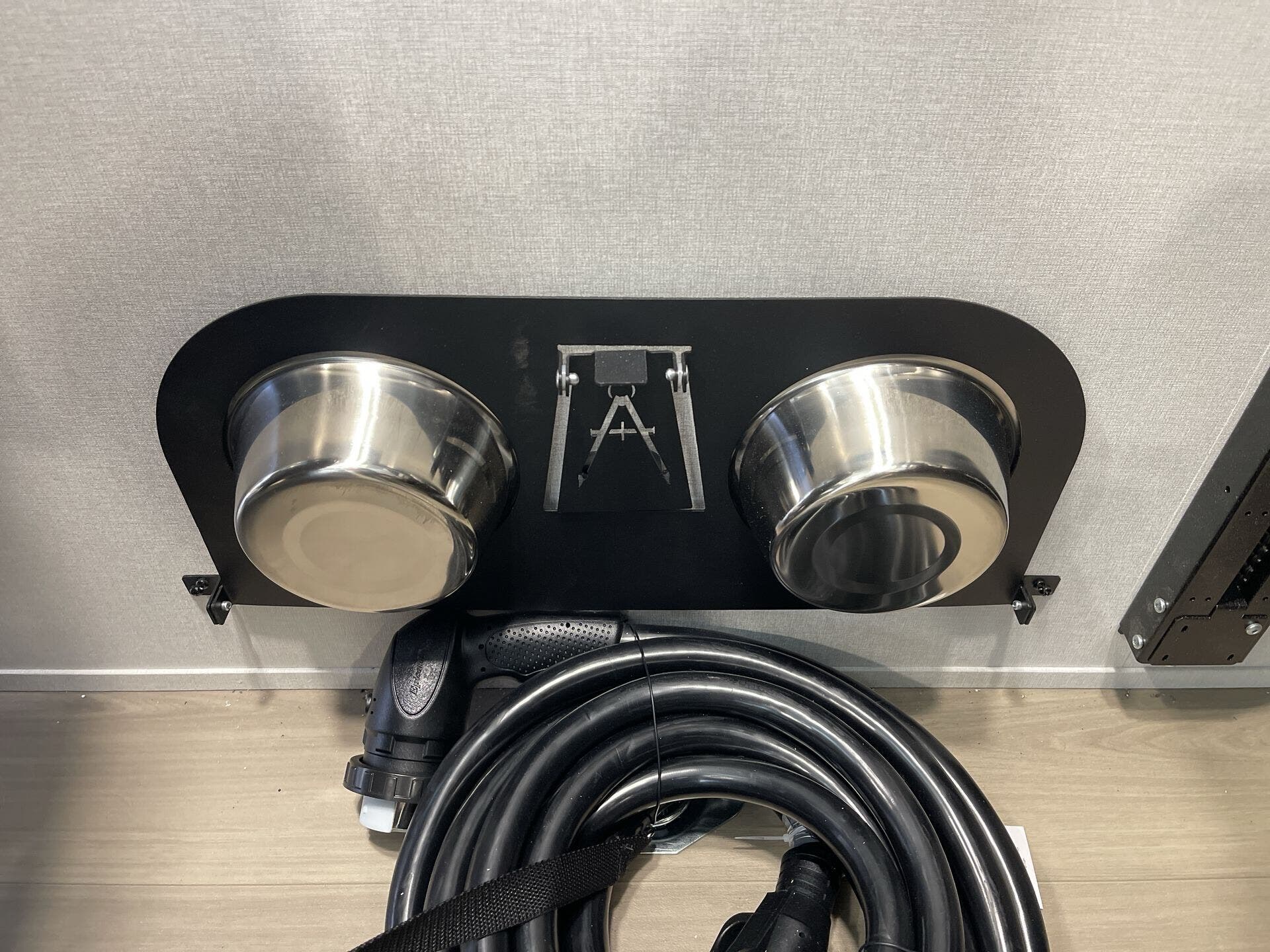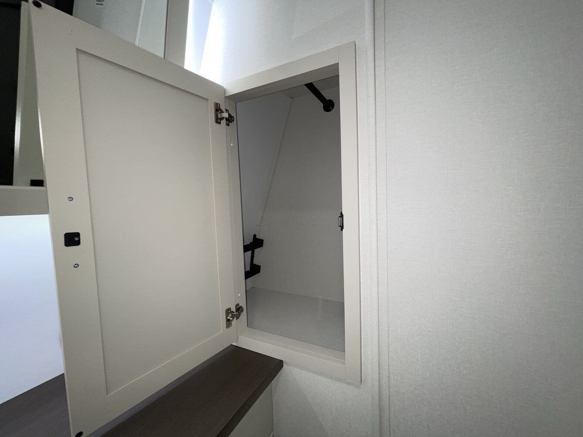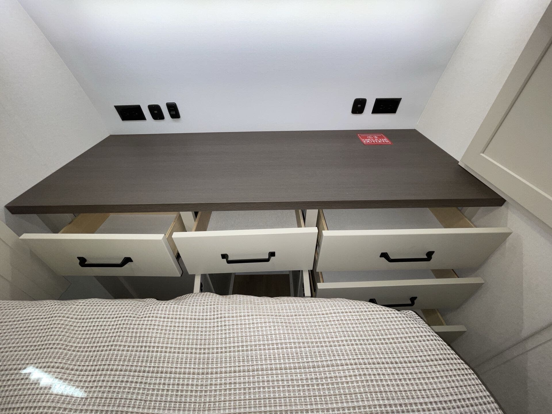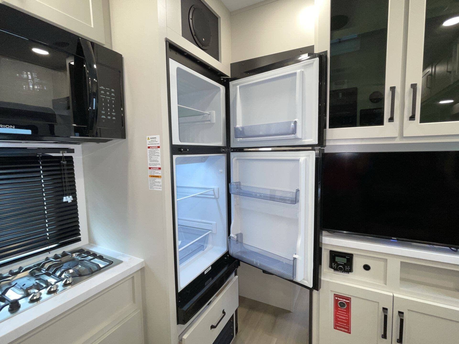 Inside, the smart floorplan combines comfort and flexibility. The garage area easily converts into a living and sleeping space with HappiJac sofas, while the main living area features comfortable seating and large windows that bring in natural light. The kitchen is fully equipped with modern appliances and ample storage, making it easy to cook wherever your travels take you.