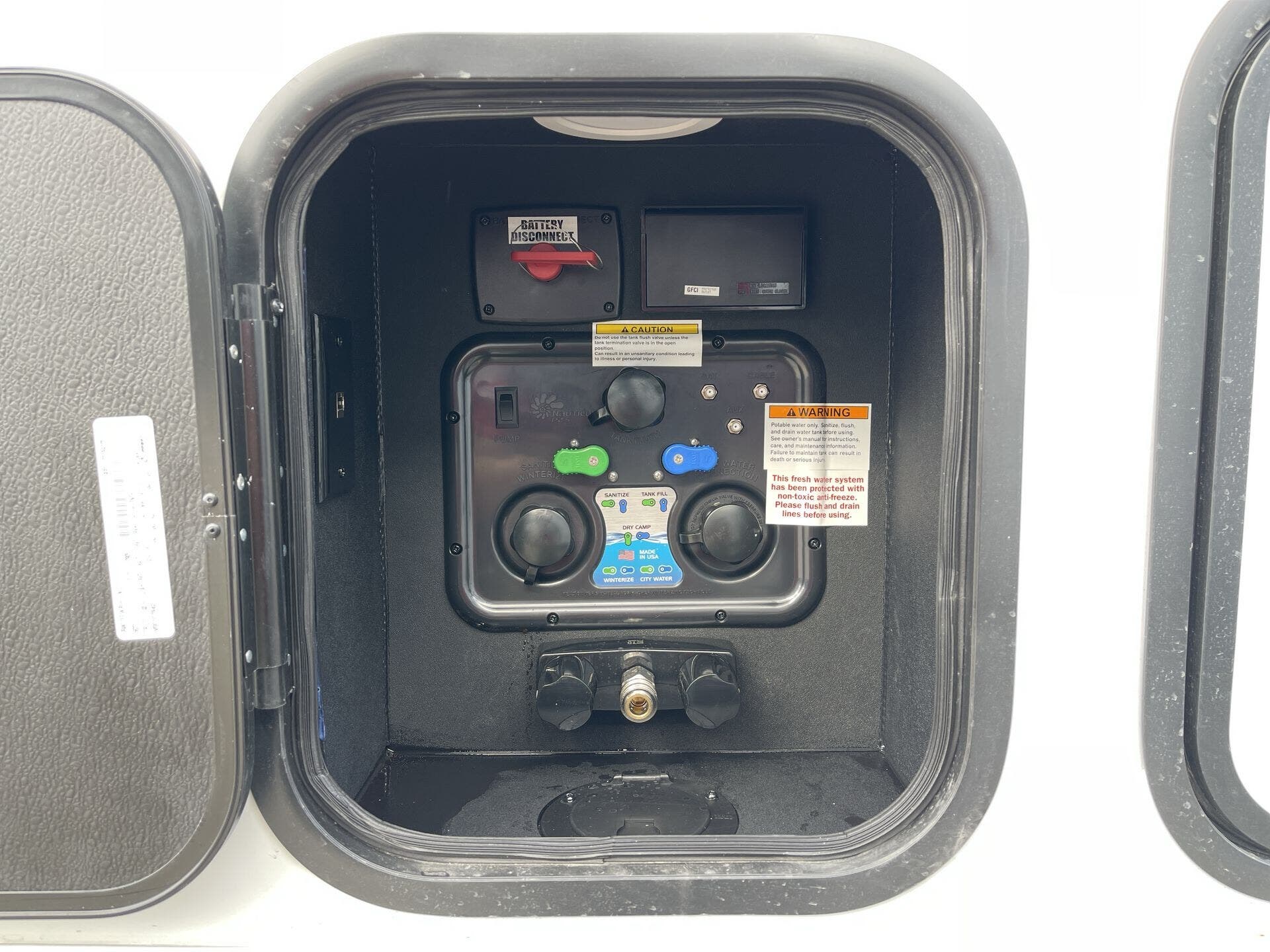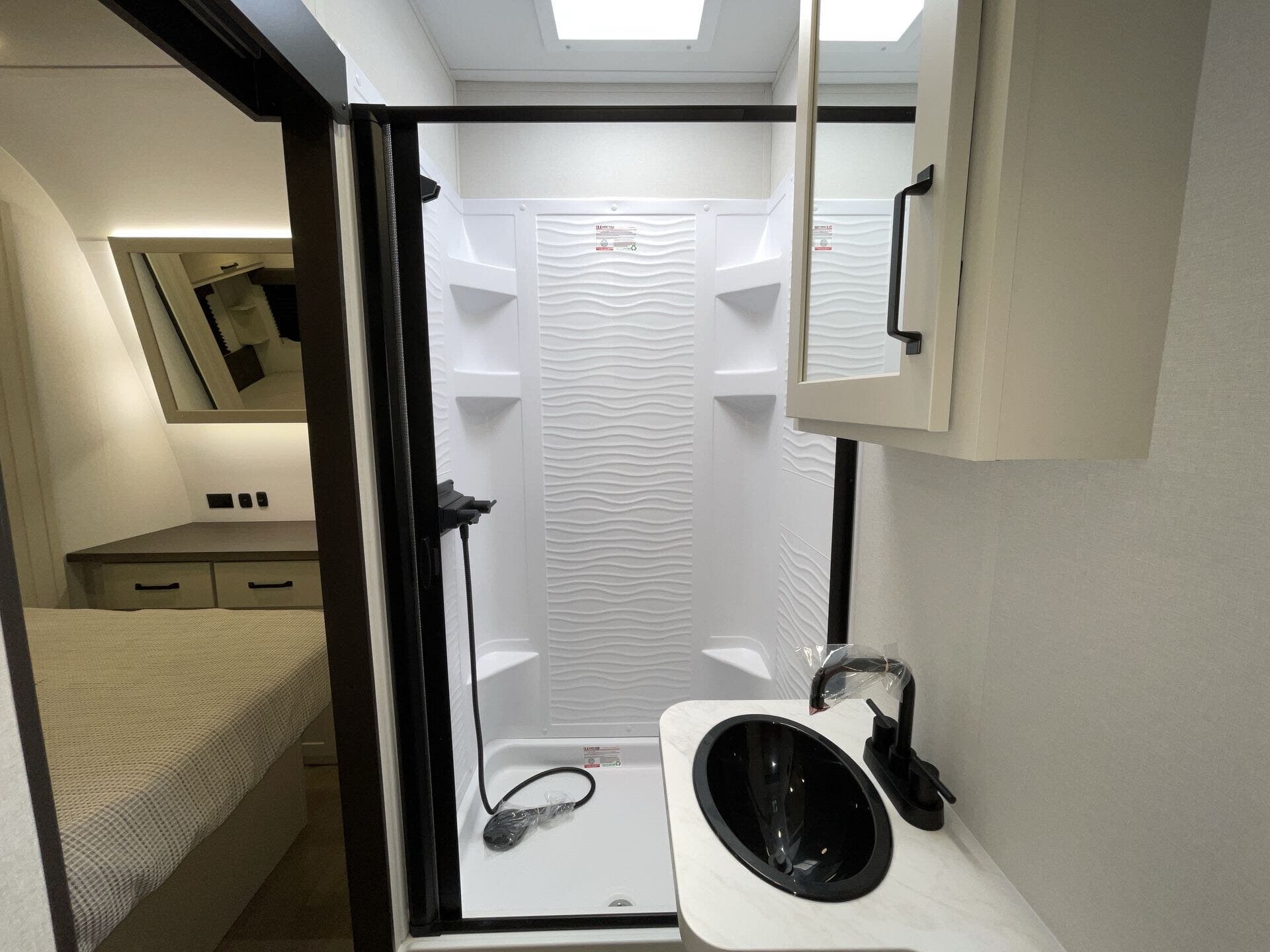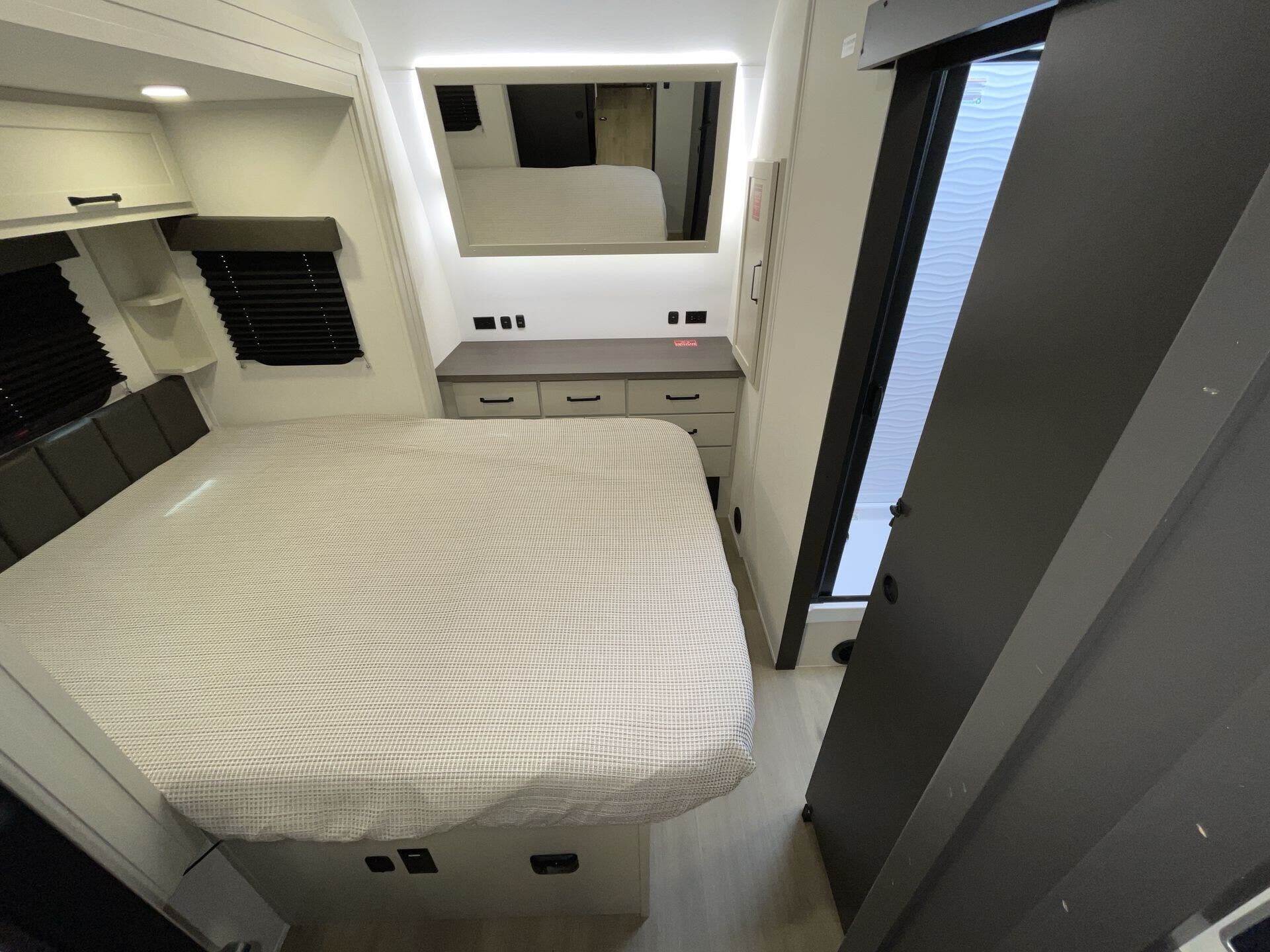 Up front, the private bedroom offers a walk-around queen bed and storage, while the bathroom includes a spacious walk-in shower with skylight for added comfort. Built for off-grid and all-season use, the 21G features a 30-gallon fuel station, solar prep, heated underbelly, and high-capacity tanks—giving you the freedom to camp longer and go further.