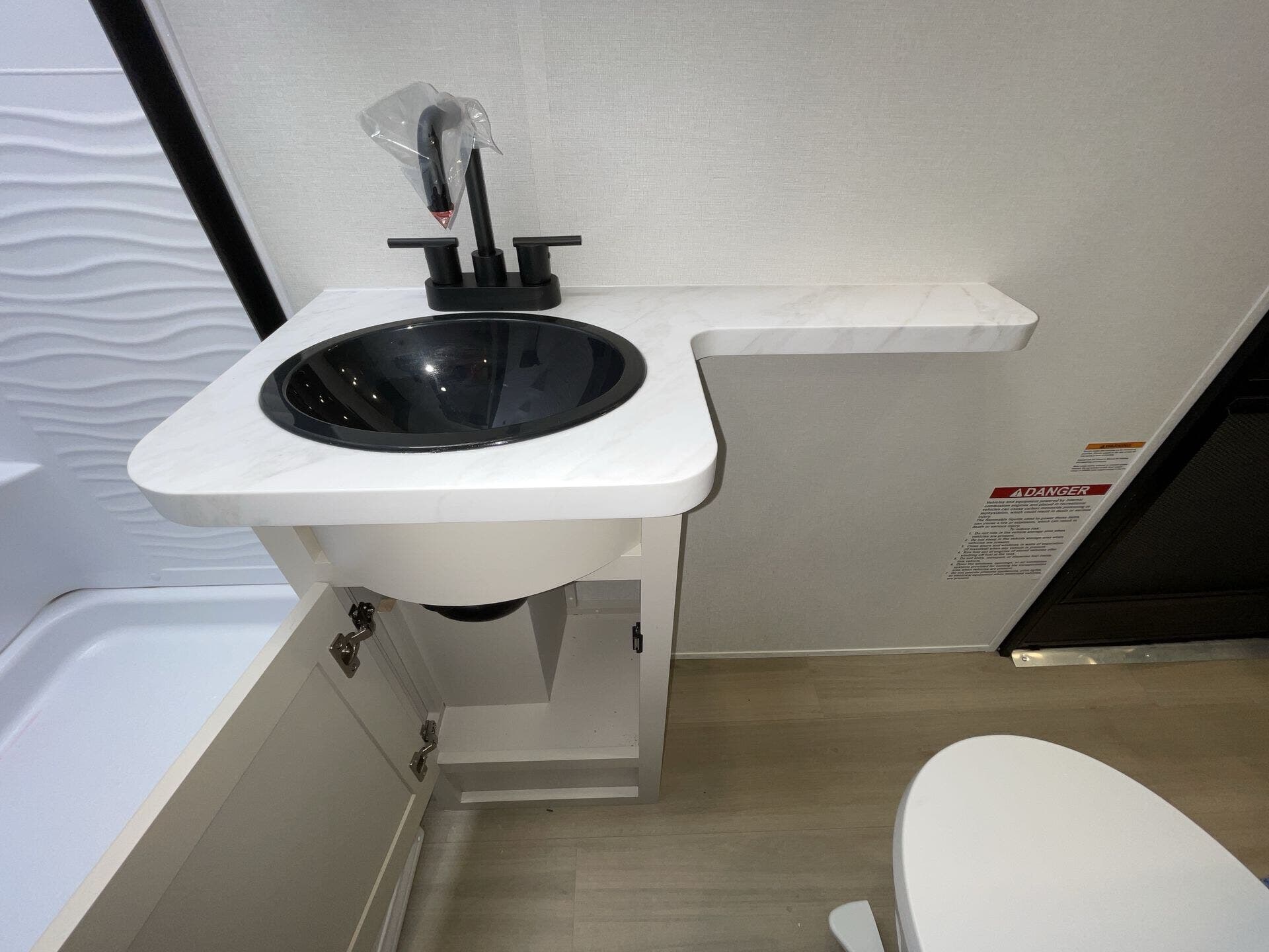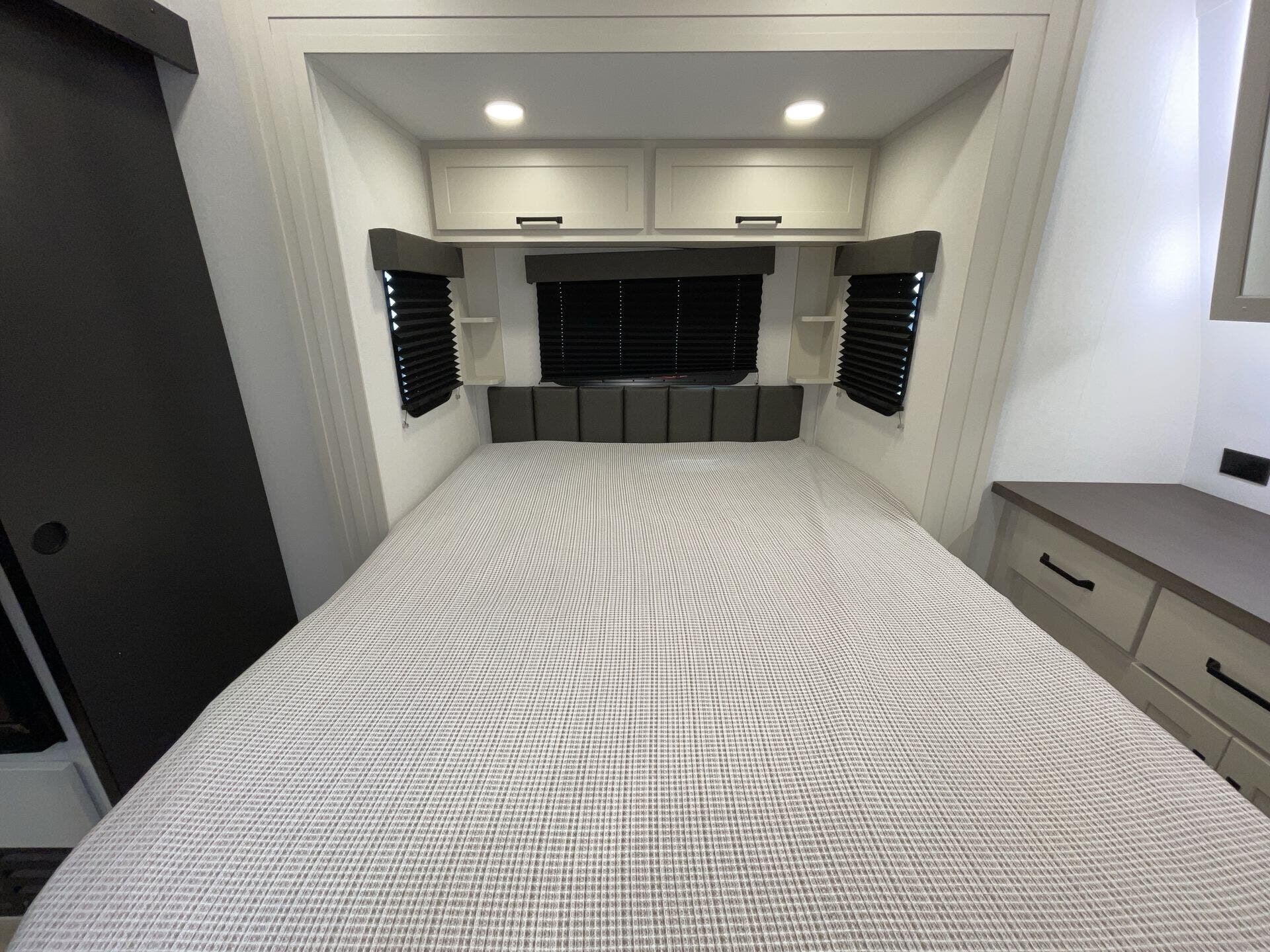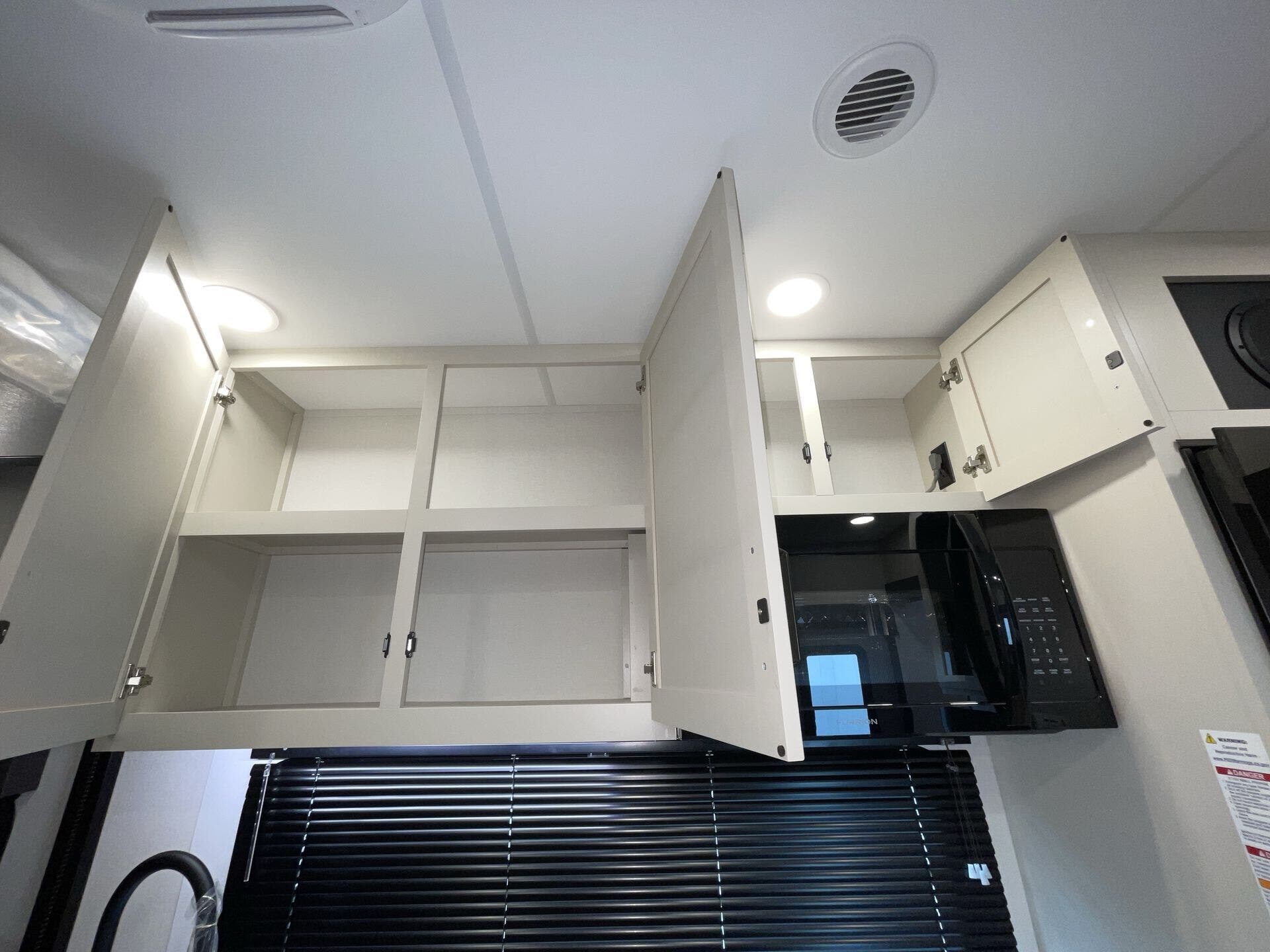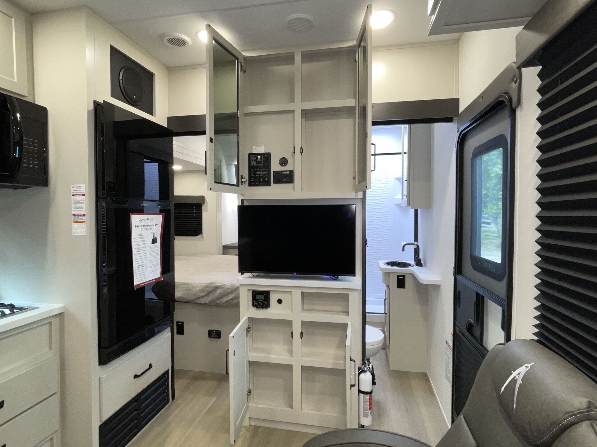 Up front, the private bedroom offers a walk-around queen bed and storage, while the bathroom includes a spacious walk-in shower with skylight for added comfort. Built for off-grid and all-season use, the 21G features a 30-gallon fuel station, solar prep, heated underbelly, and high-capacity tanks—giving you the freedom to camp longer and go further.