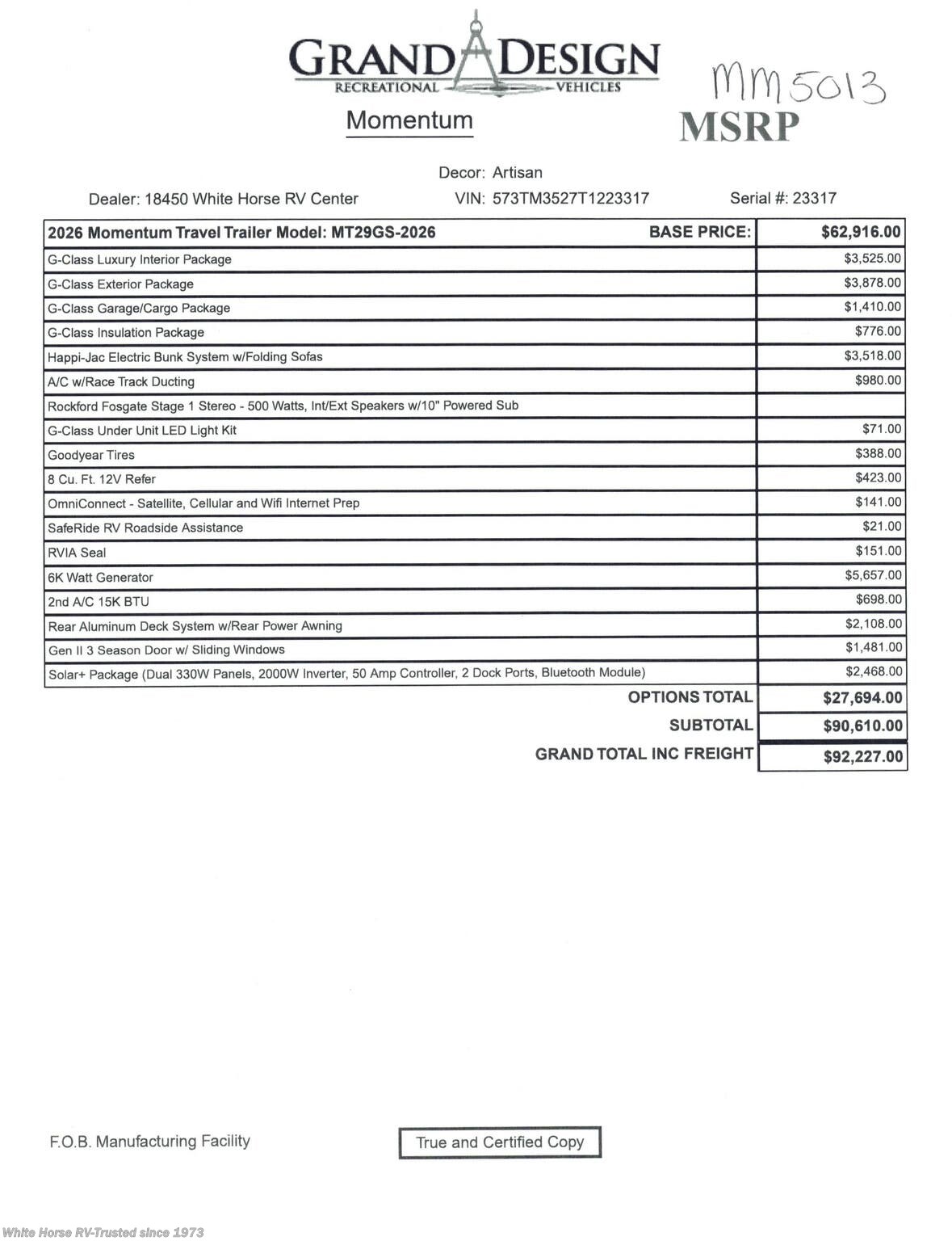 Request More Info on this 2026 Grand Design Momentum G-Class 29GS Offered for sale by White Horse RV Center