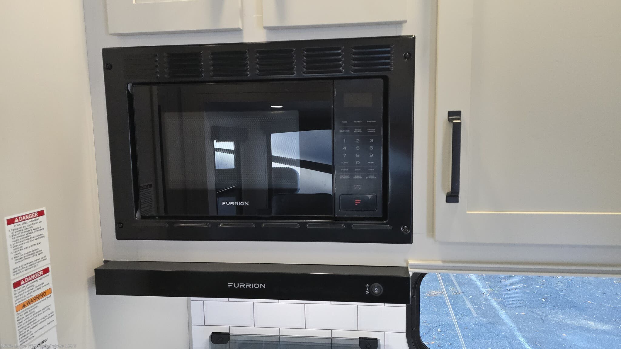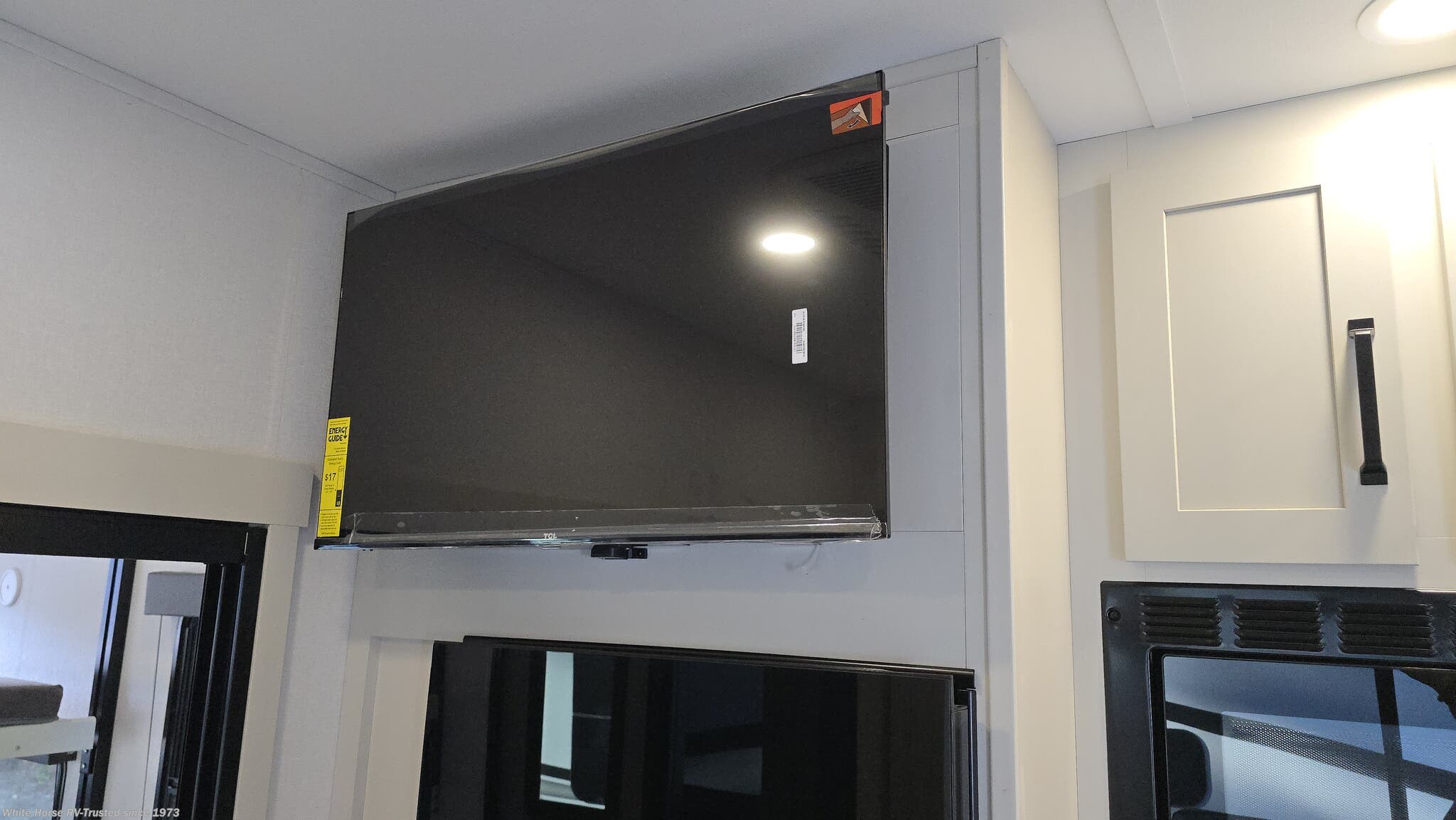 Well-Equipped Kitchen: Flip-up countertop extension, microwave, 8 cu. ft. refrigerator, and TV with overhead storage
