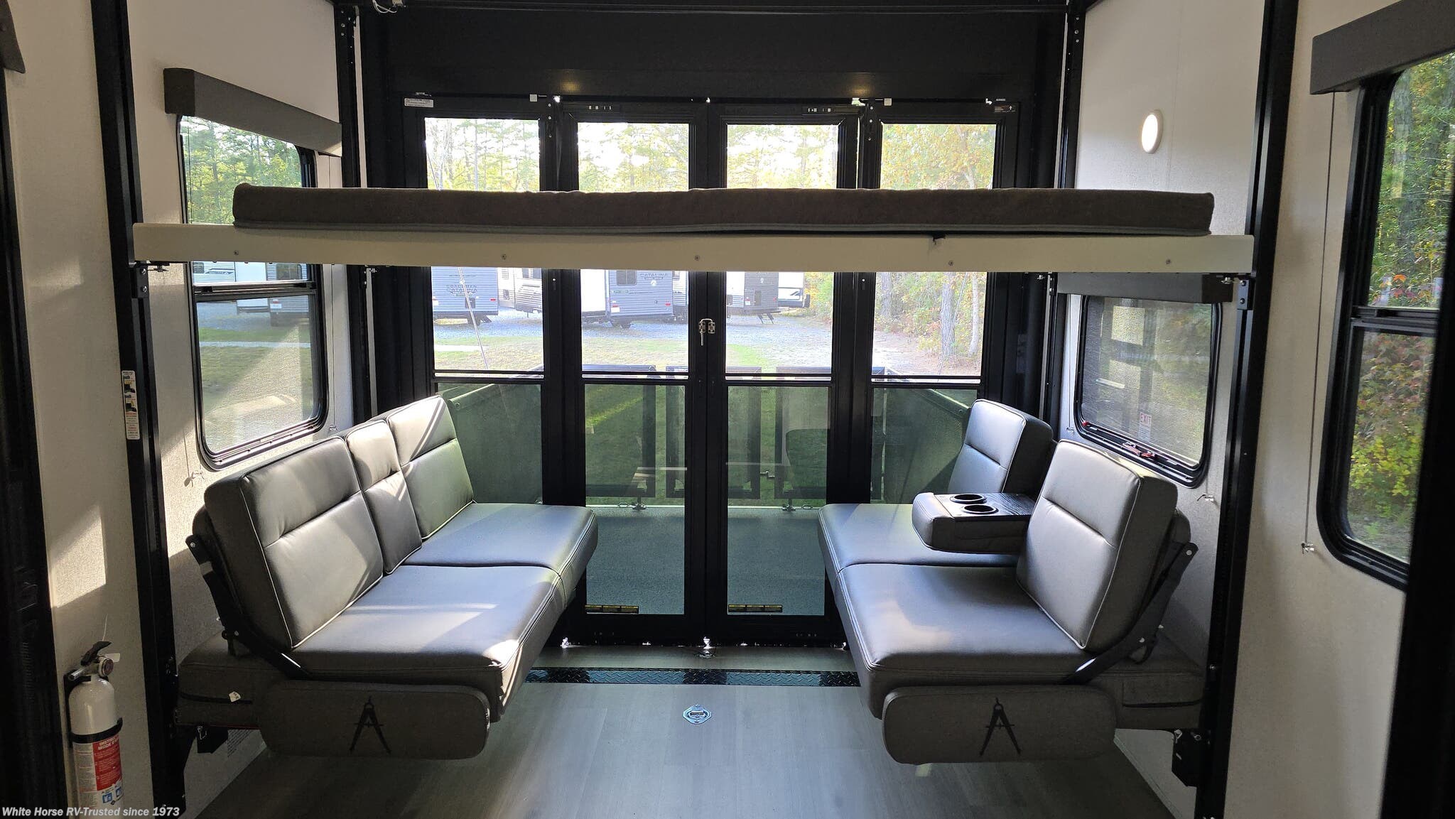 11' Separate Garage: Perfect for hauling ATVs, motorcycles, or gear, with Happi-Jac rollover sofas and optional table/top bed system for added sleeping or dining space