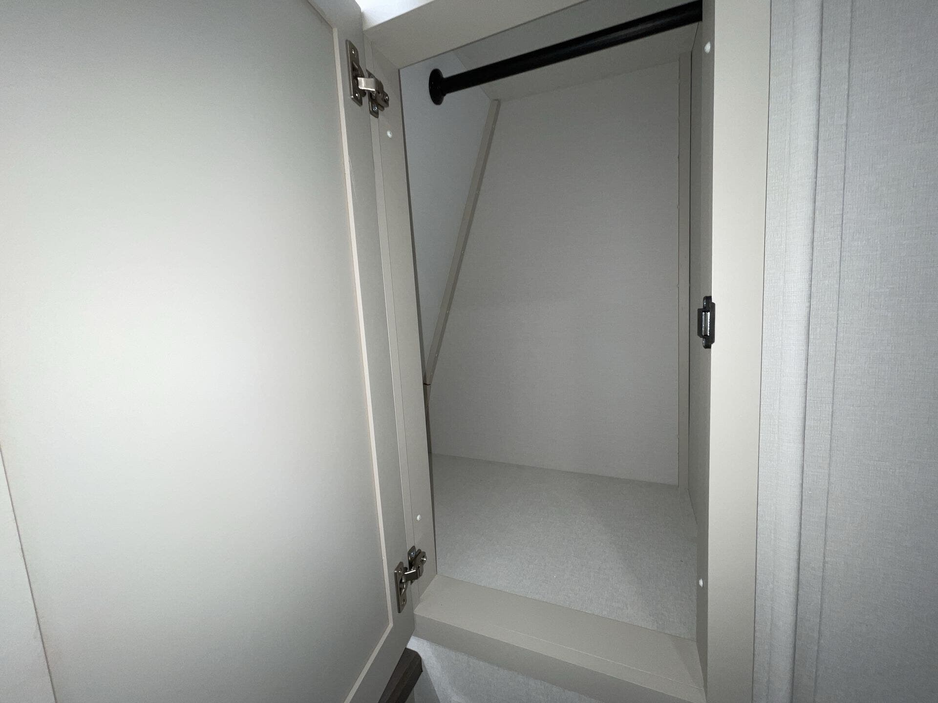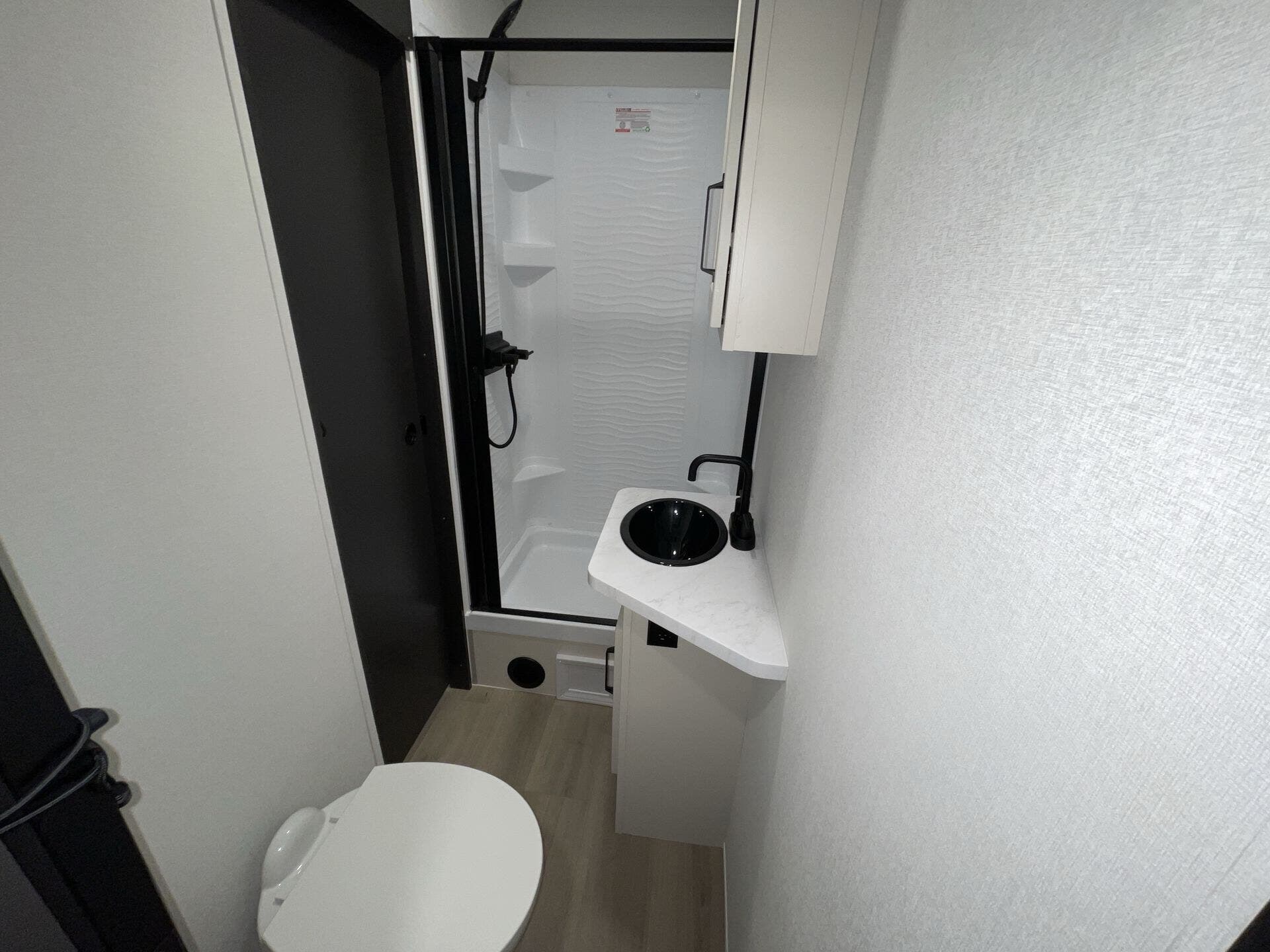 - Queen bed with dedicated sleeping area and a practical shower in the bathroom