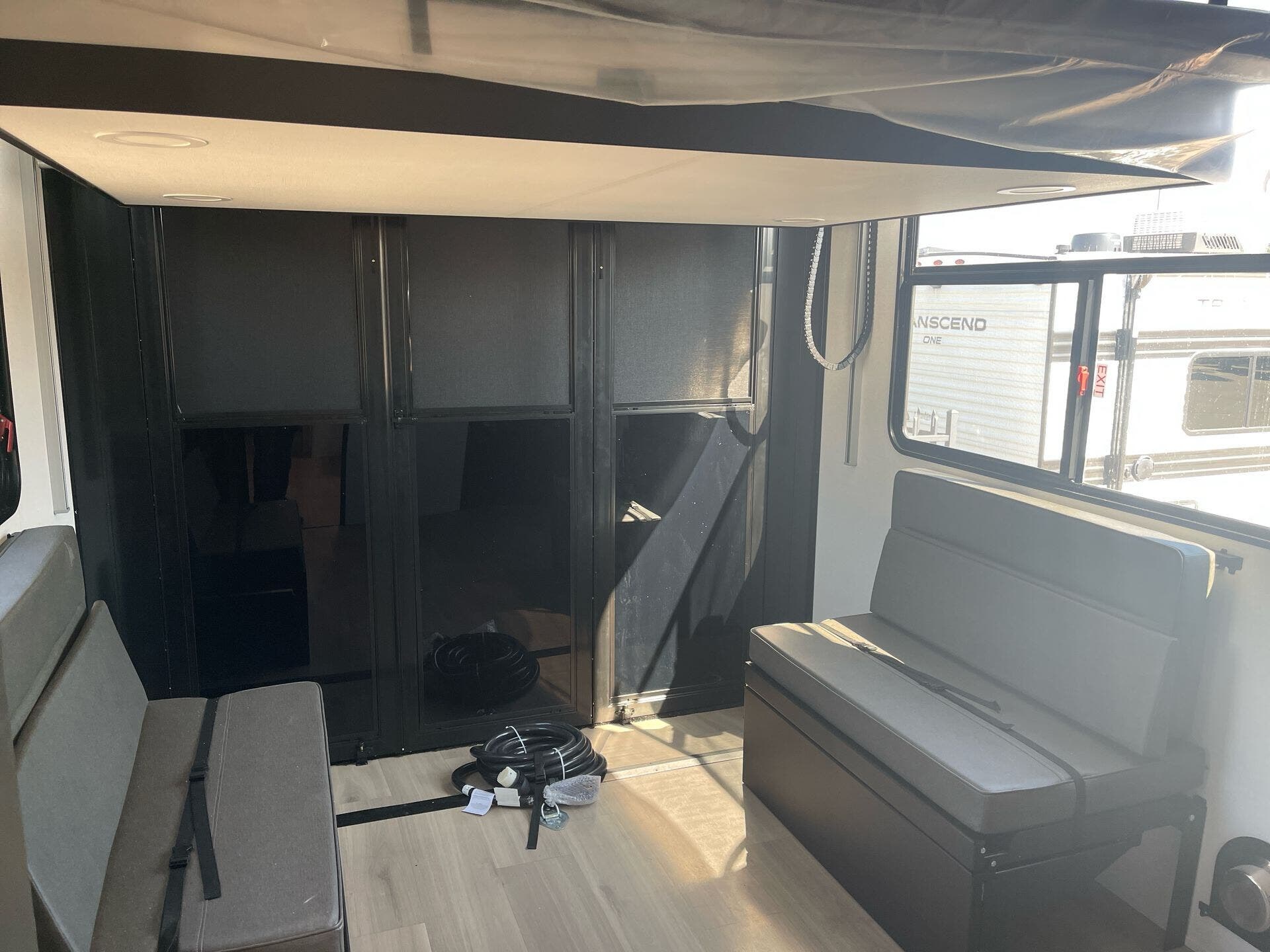 The interior features a bath and a half, loft sleeping, and a living room with a fireplace and theater seating slide—all bathed in natural light via panoramic windows and brightened by USB-charged residential cabinetry.