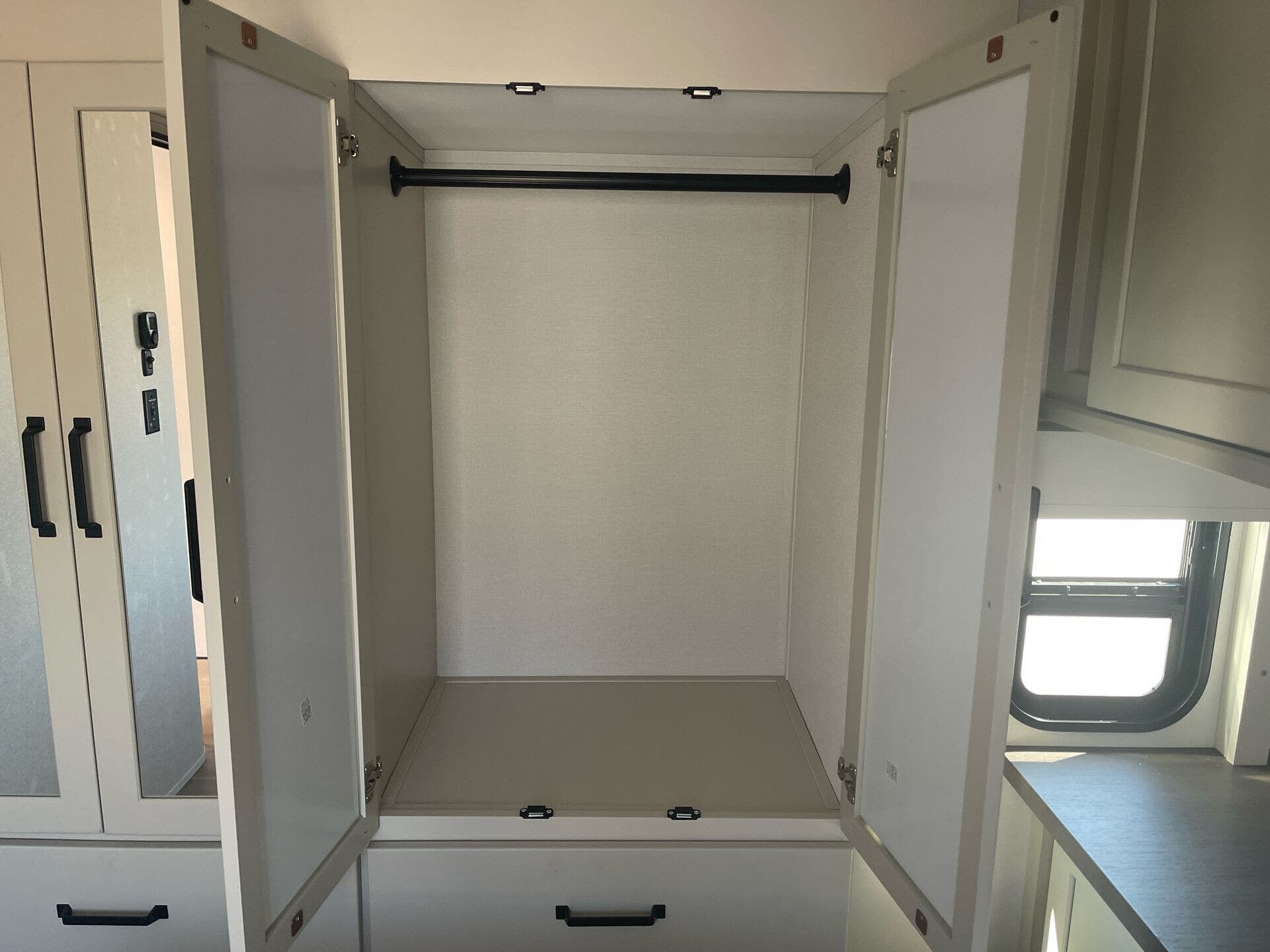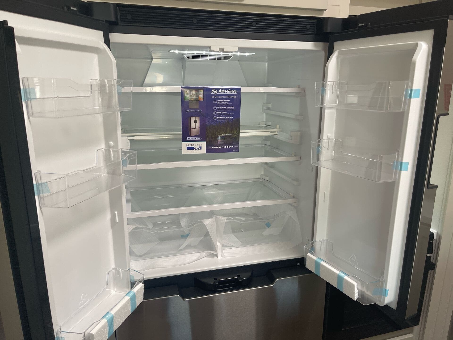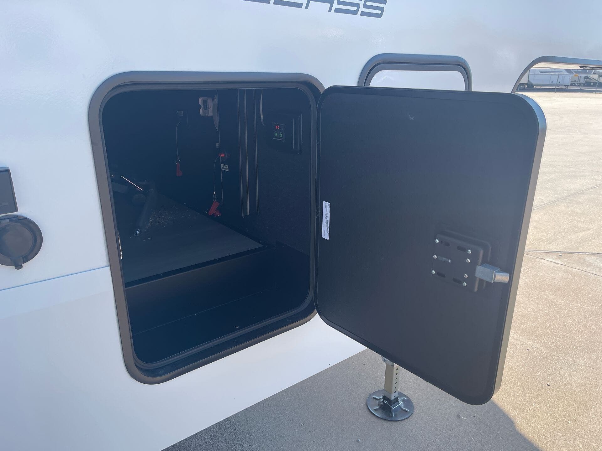 Utility isn’t overlooked: you’ll find a full kitchen, dual-entry doors, large holding tanks (98 gal fresh, 52 gal gray, 104 gal black), 30-gal fuel tank, and solar prep supporting extended off-grid living.