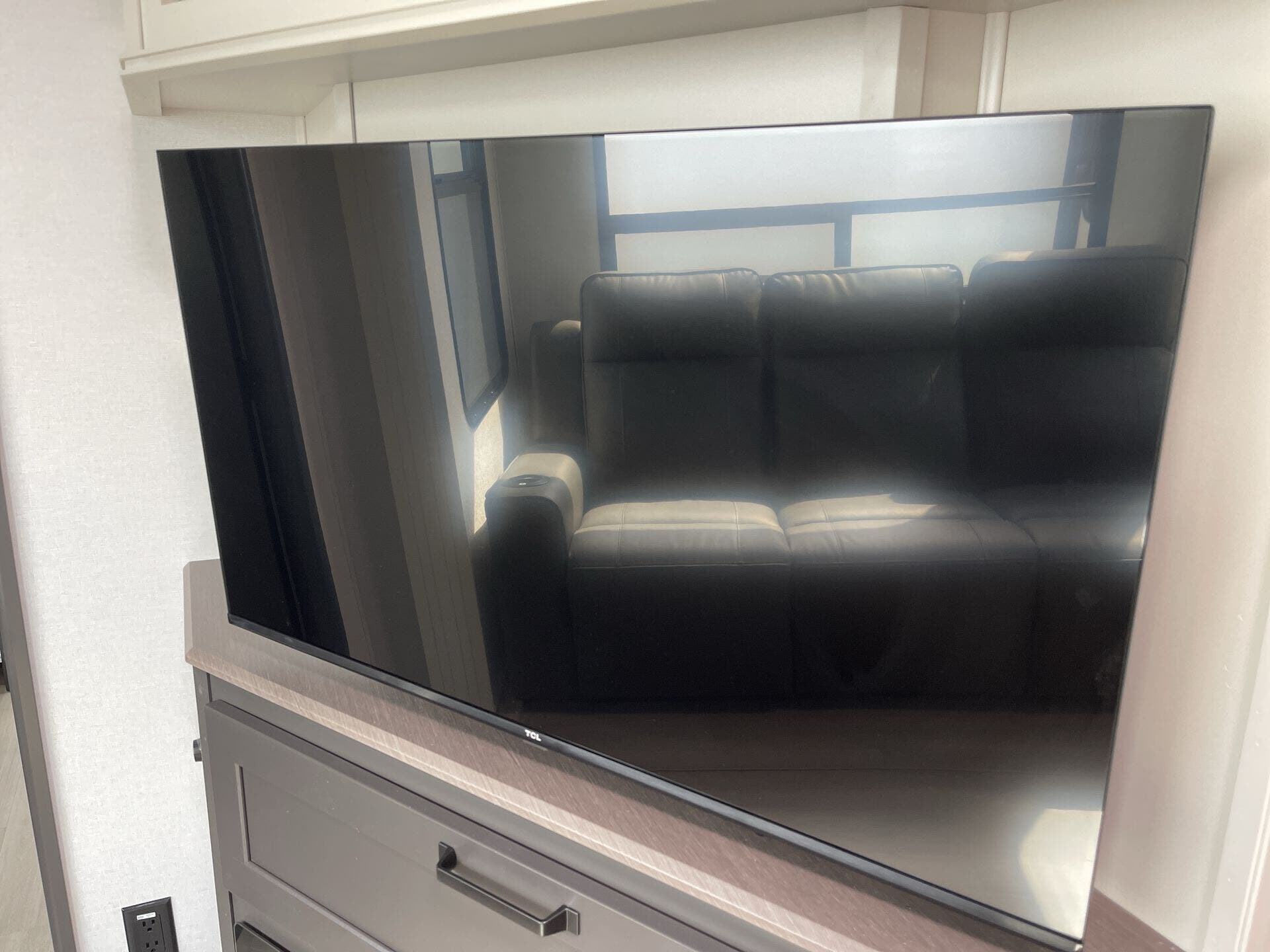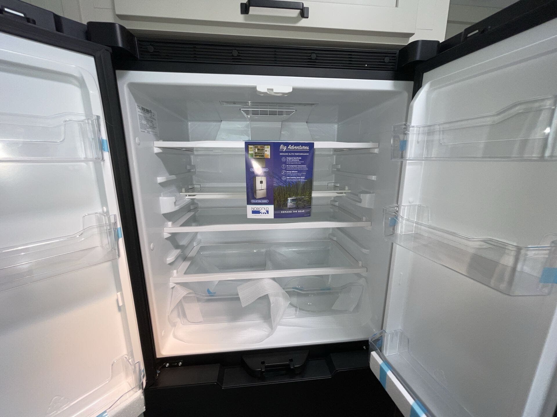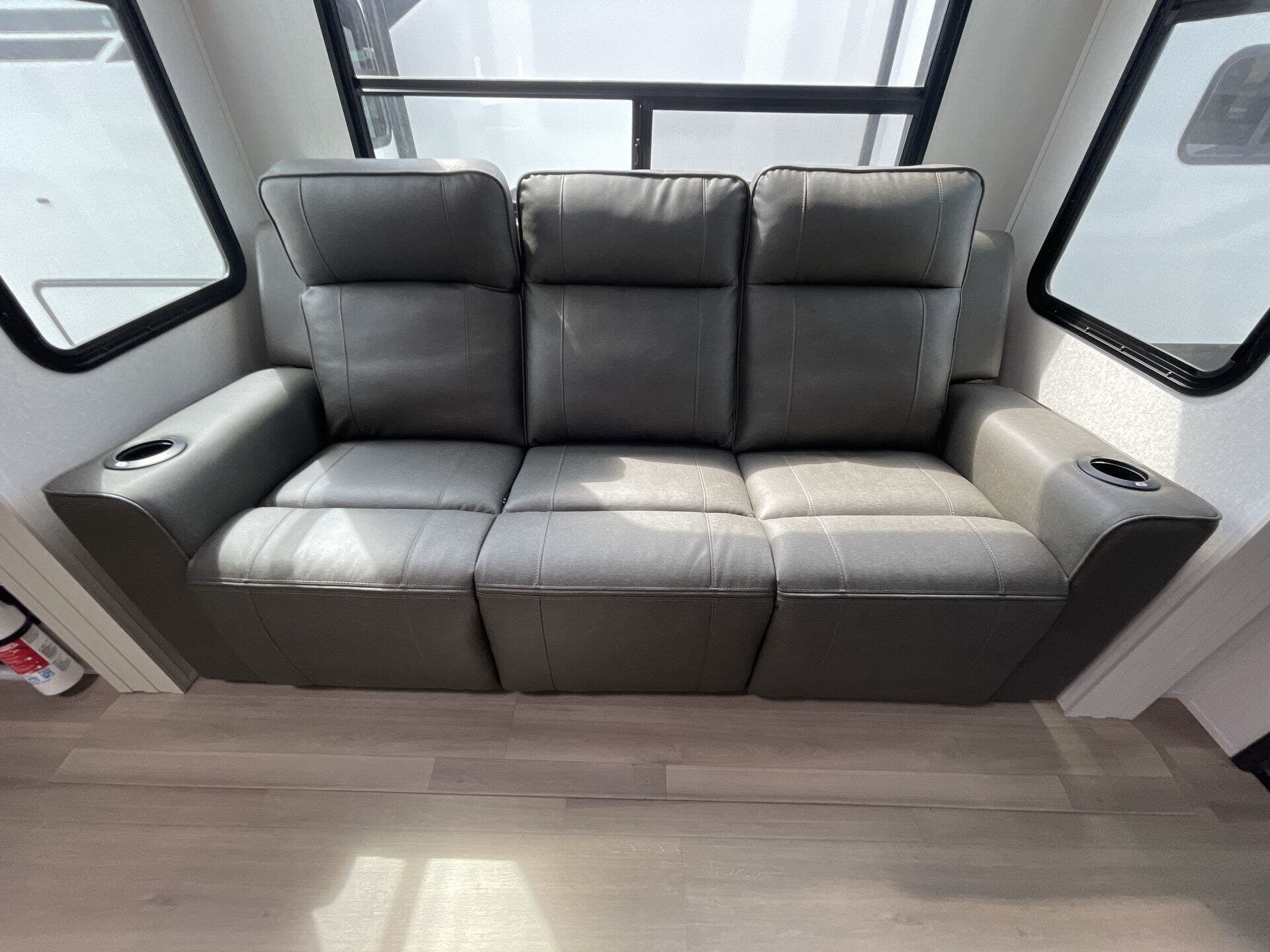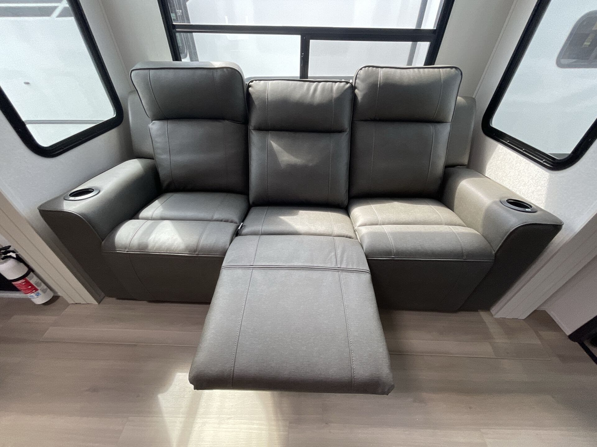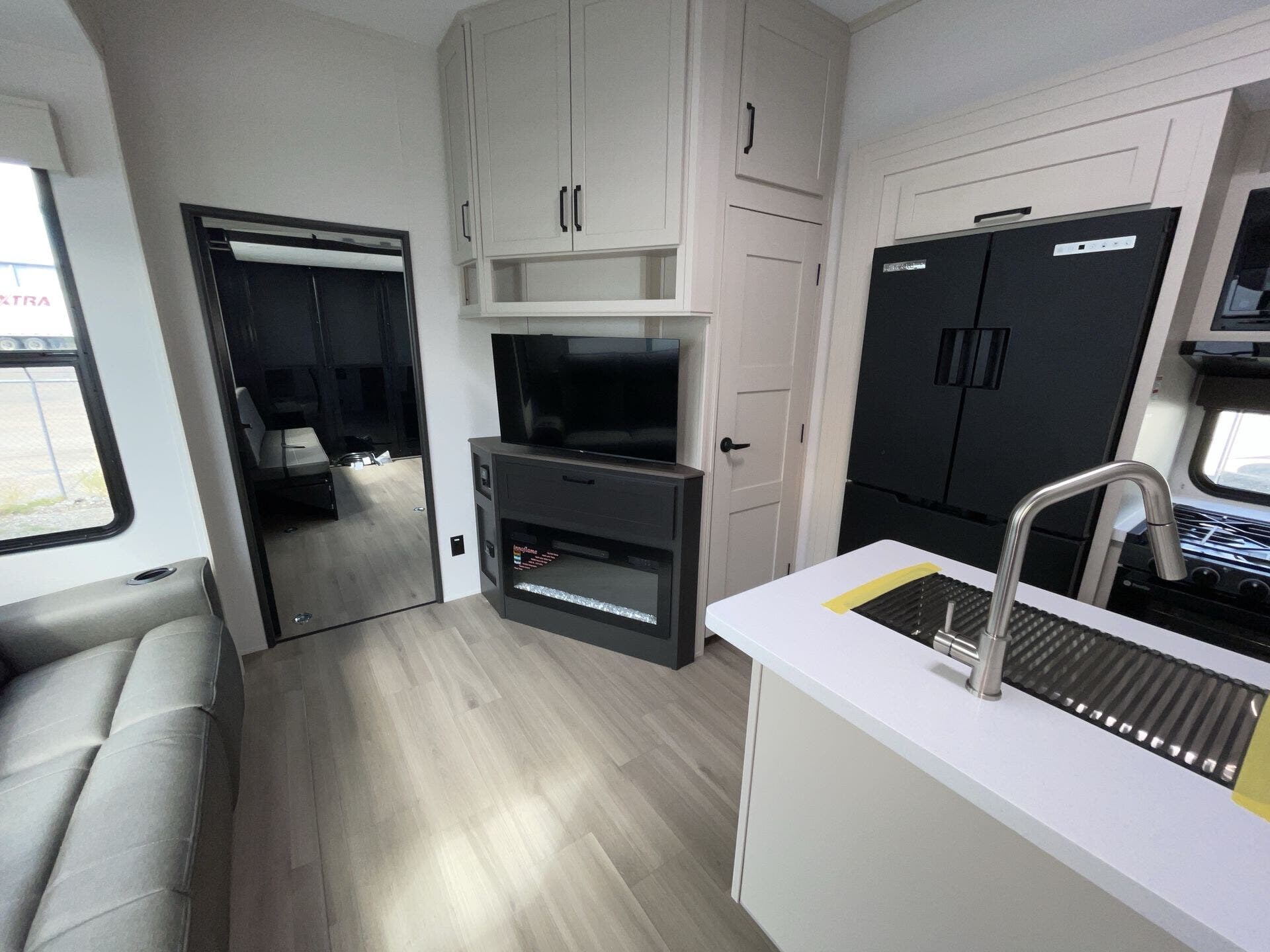 Inside, the Momentum G-Class 350G feels like a high-end retreat. The rear garage doubles as a versatile living space, complete with Happi-Jac rollover sofas, a half bath, and a rear patio system option for outdoor entertaining. In the main living area, you’ll find theater seating, a large LED TV, and a cozy fireplace that make downtime just as enjoyable as the adventure. The gourmet kitchen features solid surface countertops, stainless steel appliances, a residential-size refrigerator, and ample storage, making meal prep simple and enjoyable.