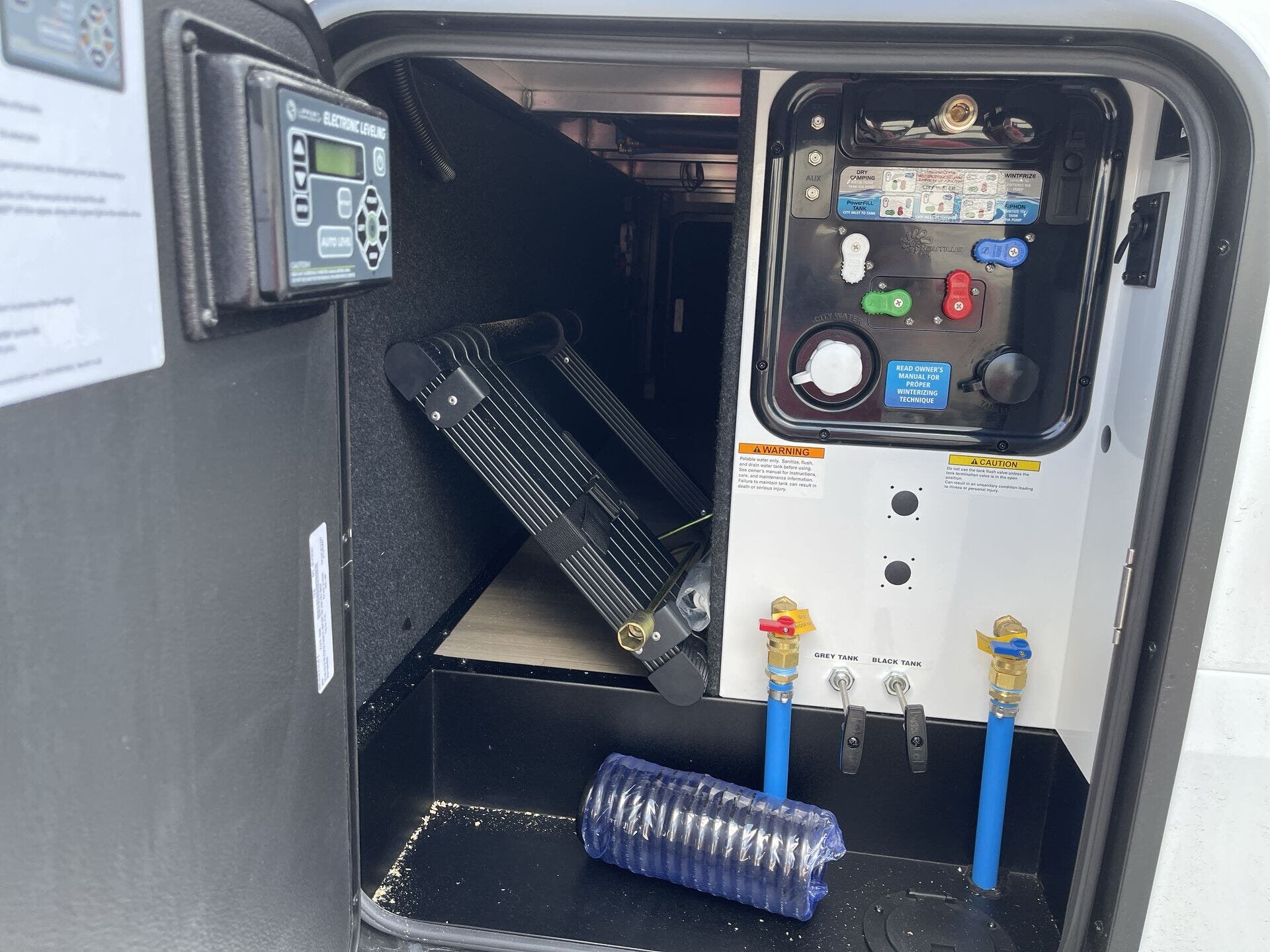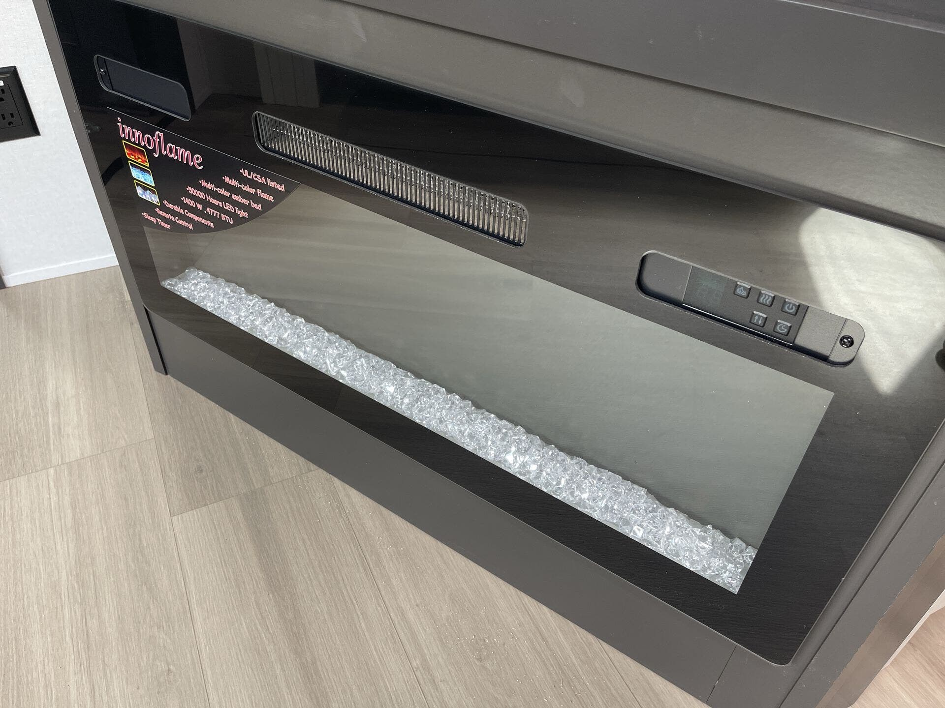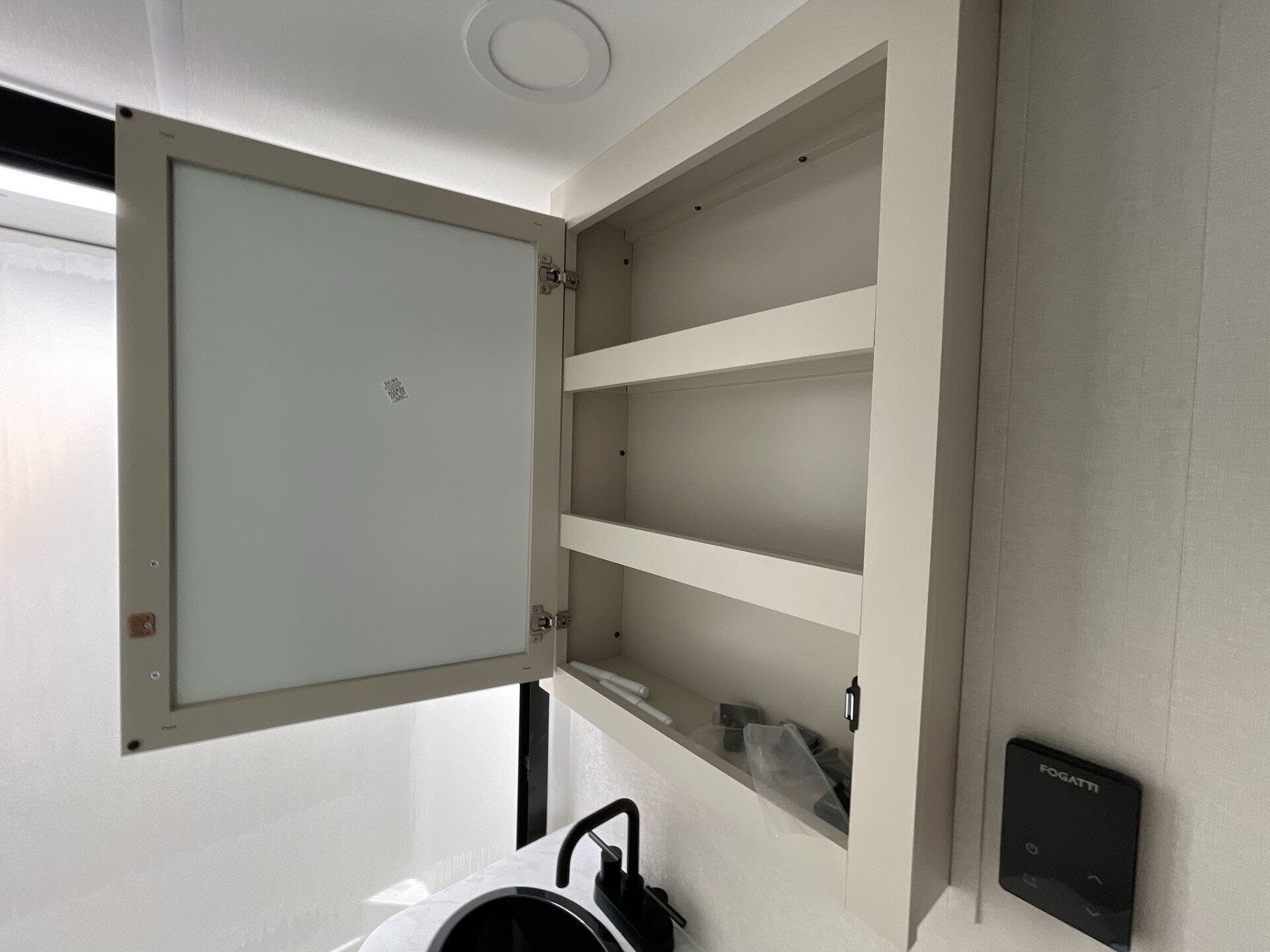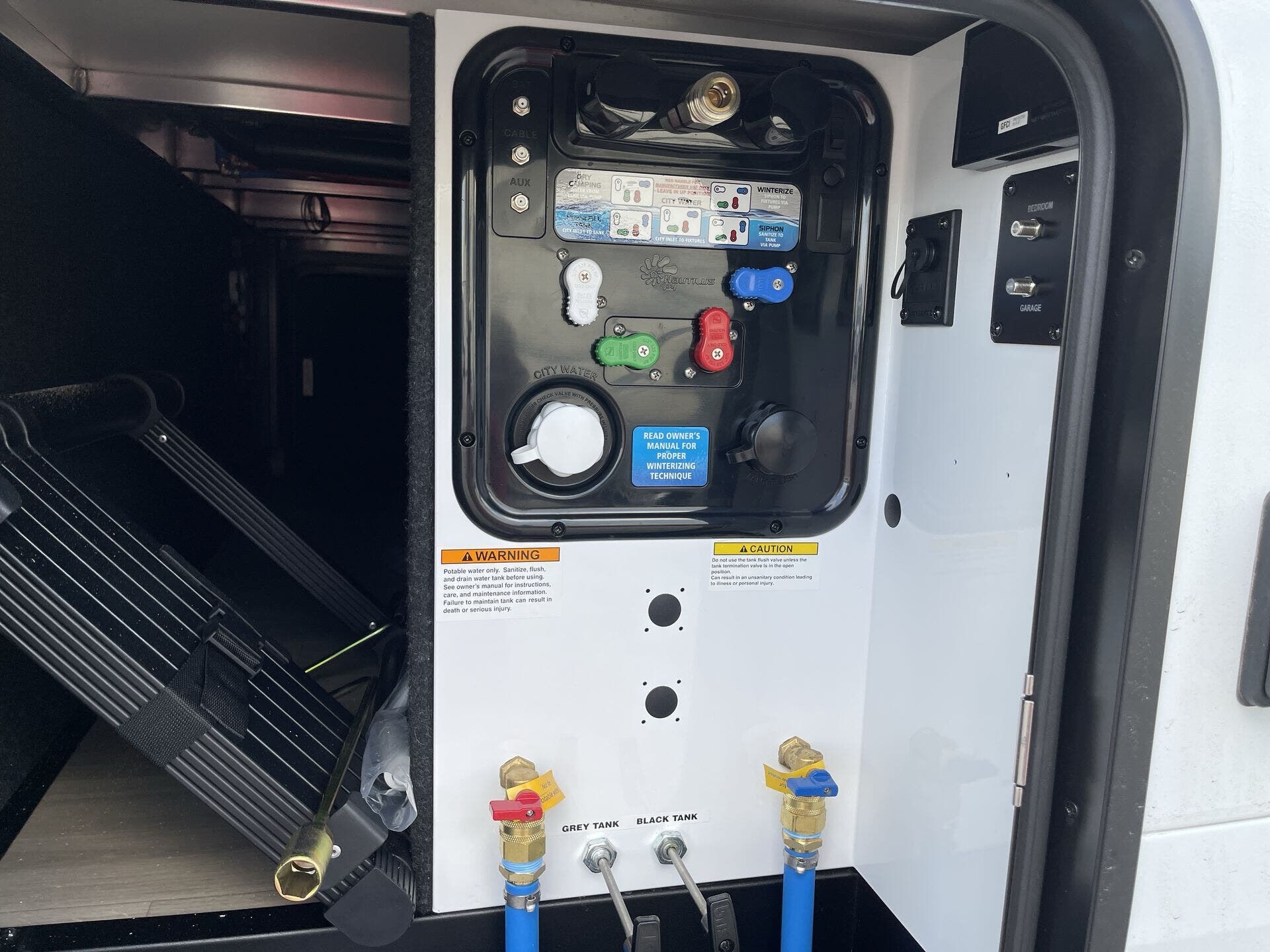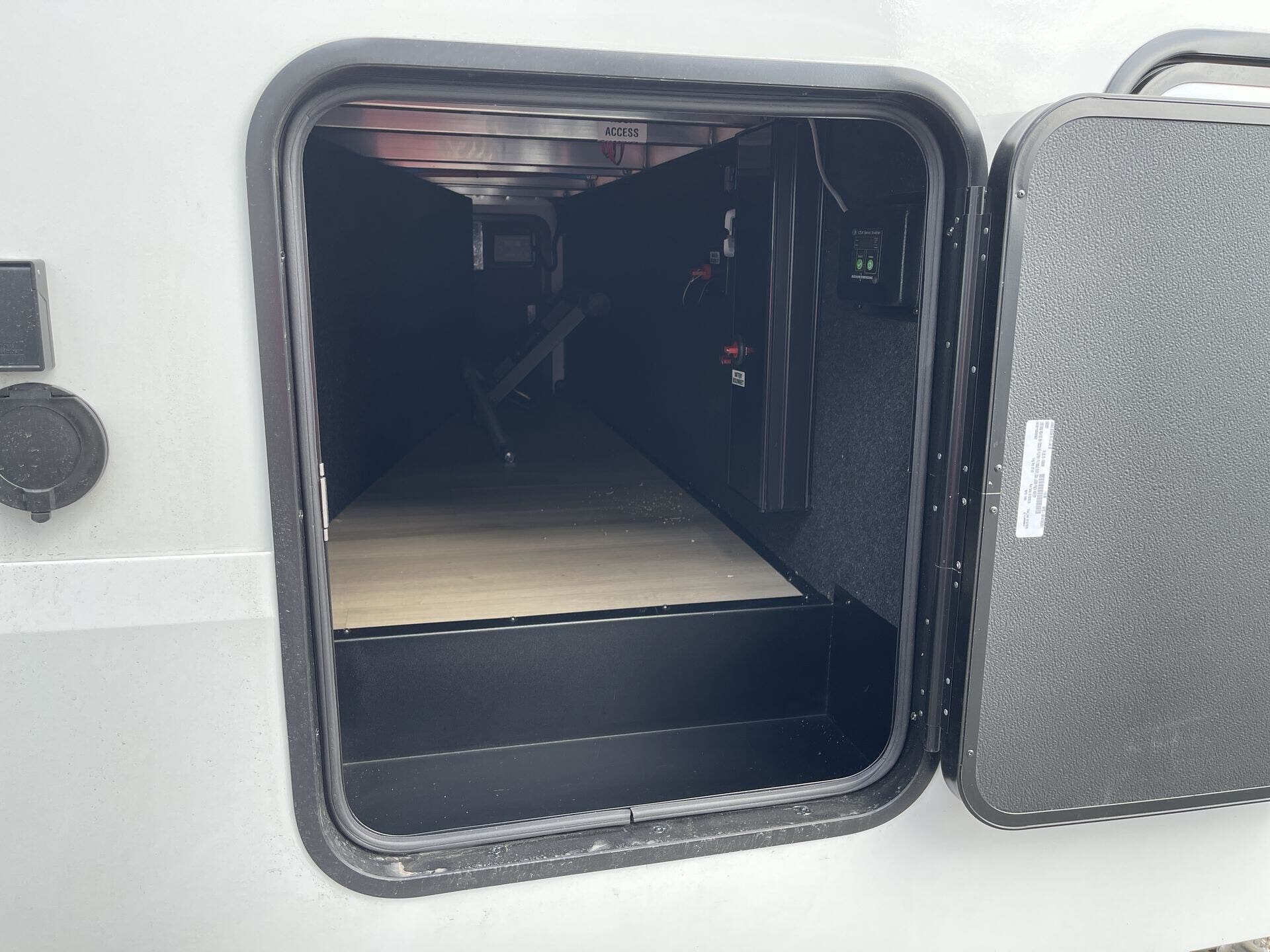 Inside, the Momentum G-Class 350G feels like a high-end retreat. The rear garage doubles as a versatile living space, complete with Happi-Jac rollover sofas, a half bath, and a rear patio system option for outdoor entertaining. In the main living area, you’ll find theater seating, a large LED TV, and a cozy fireplace that make downtime just as enjoyable as the adventure. The gourmet kitchen features solid surface countertops, stainless steel appliances, a residential-size refrigerator, and ample storage, making meal prep simple and enjoyable.