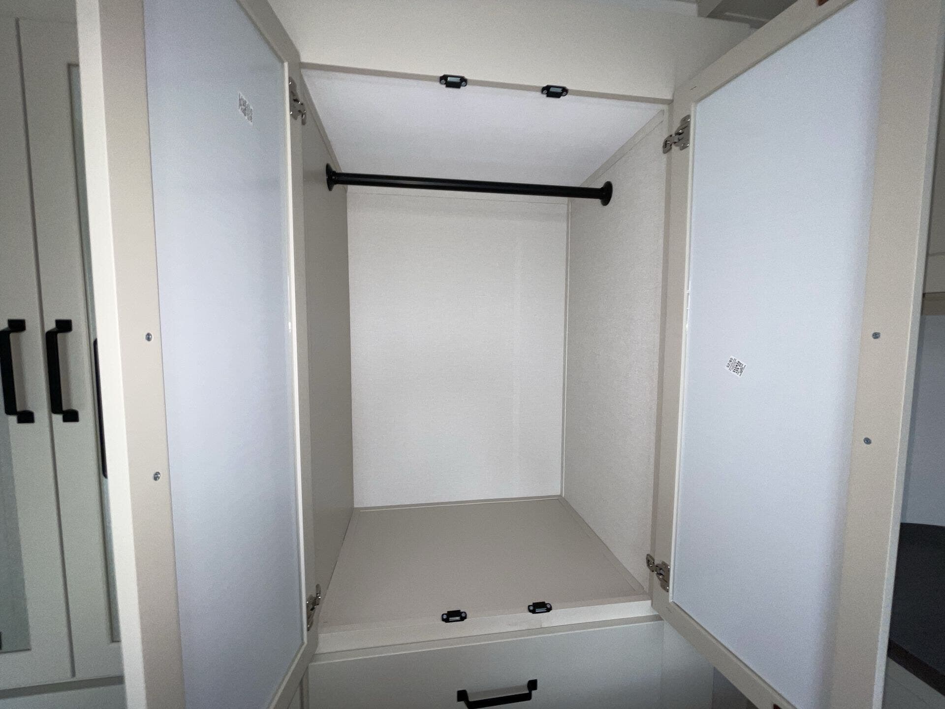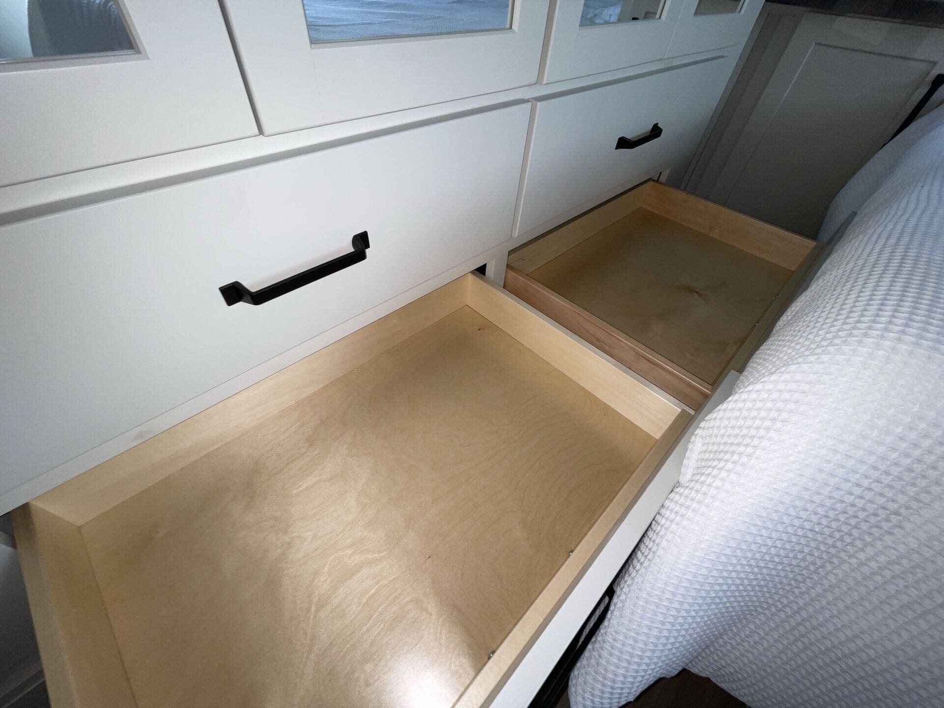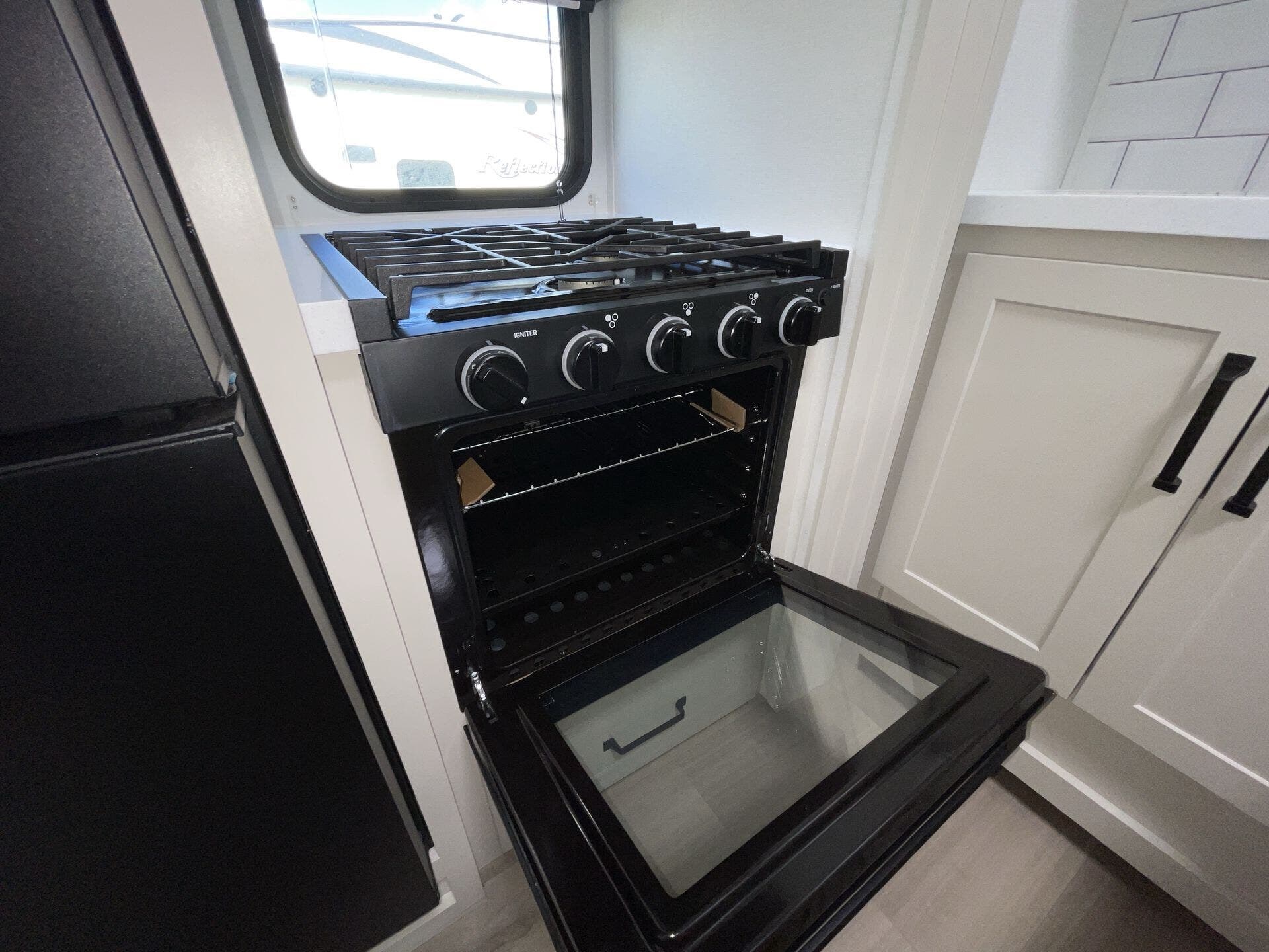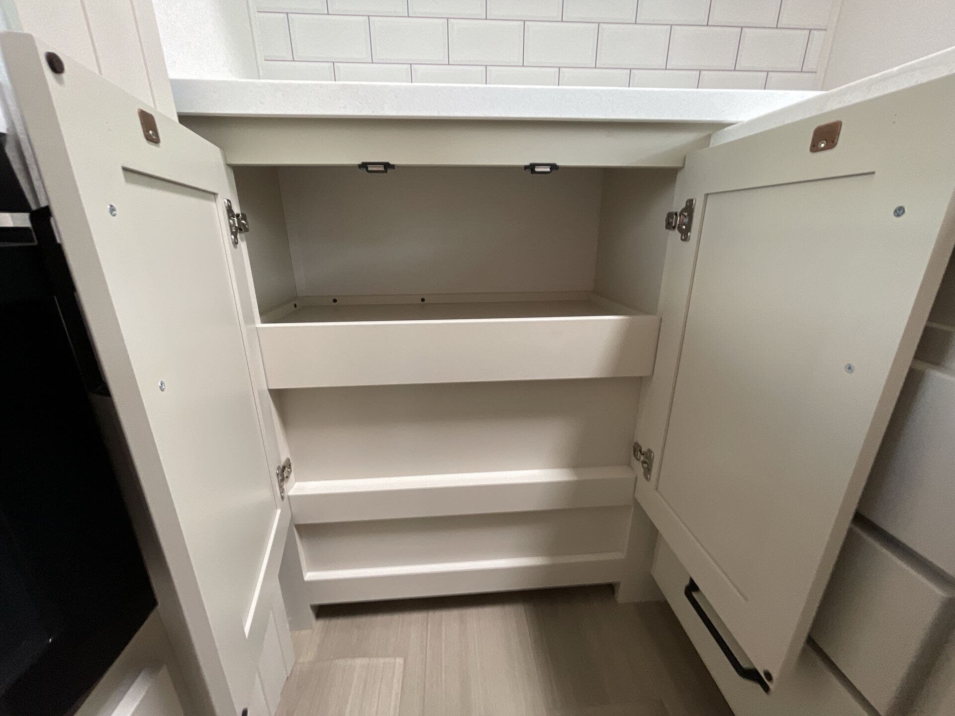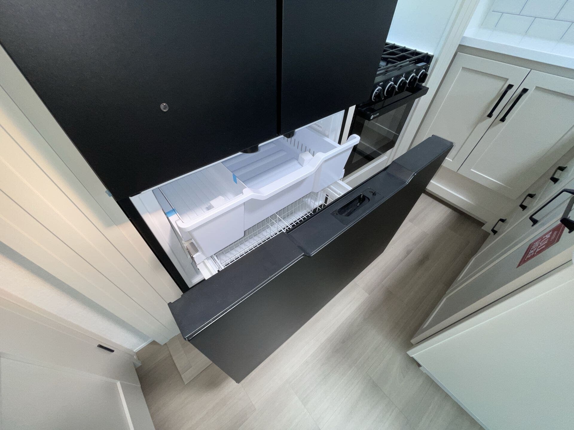 Inside, the Momentum G-Class 350G feels like a high-end retreat. The rear garage doubles as a versatile living space, complete with Happi-Jac rollover sofas, a half bath, and a rear patio system option for outdoor entertaining. In the main living area, you’ll find theater seating, a large LED TV, and a cozy fireplace that make downtime just as enjoyable as the adventure. The gourmet kitchen features solid surface countertops, stainless steel appliances, a residential-size refrigerator, and ample storage, making meal prep simple and enjoyable.