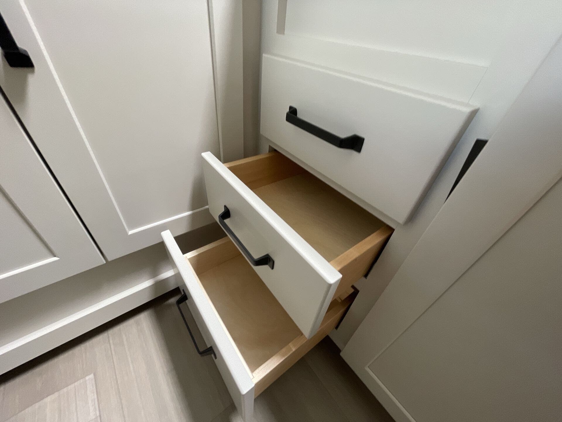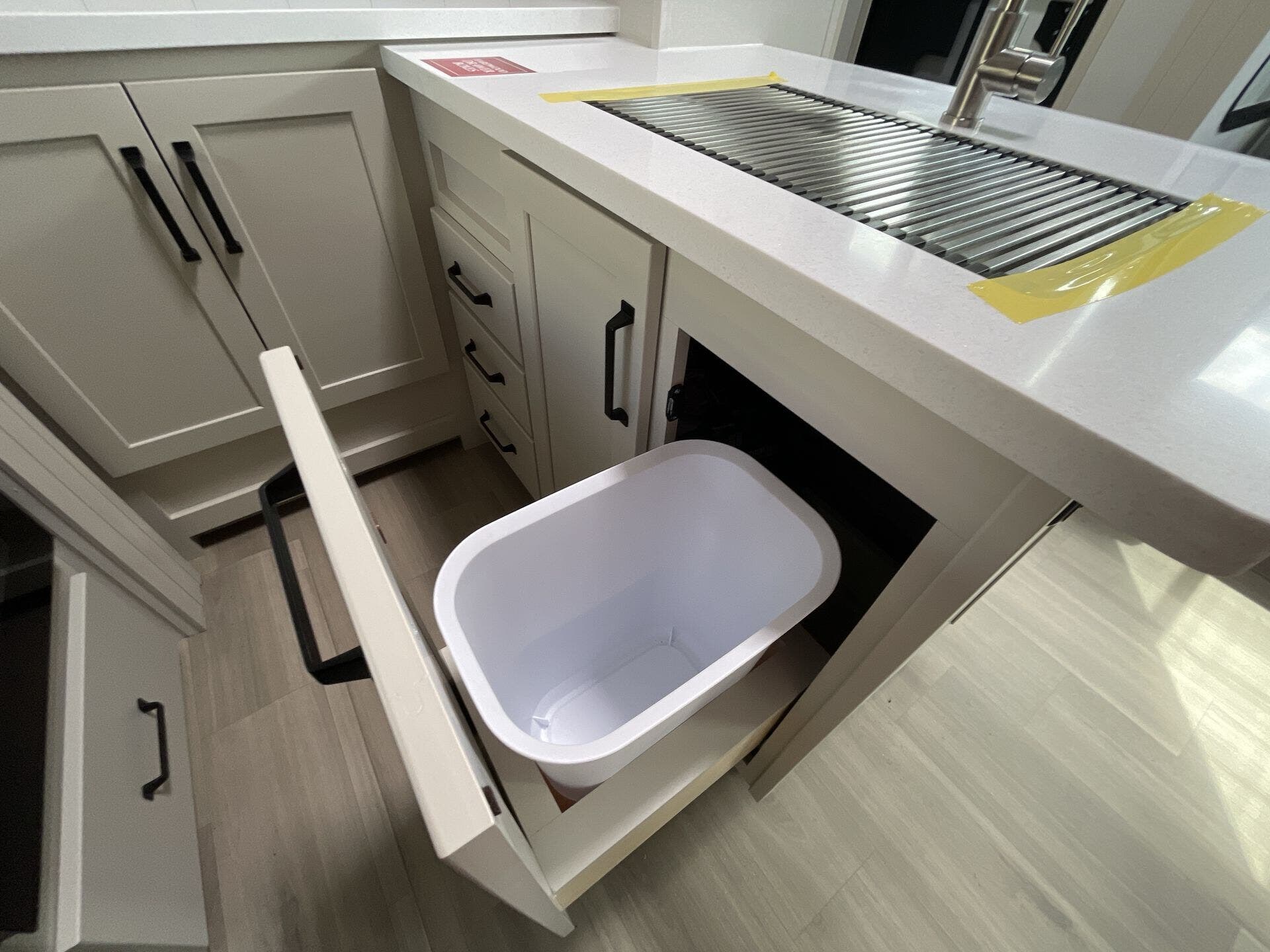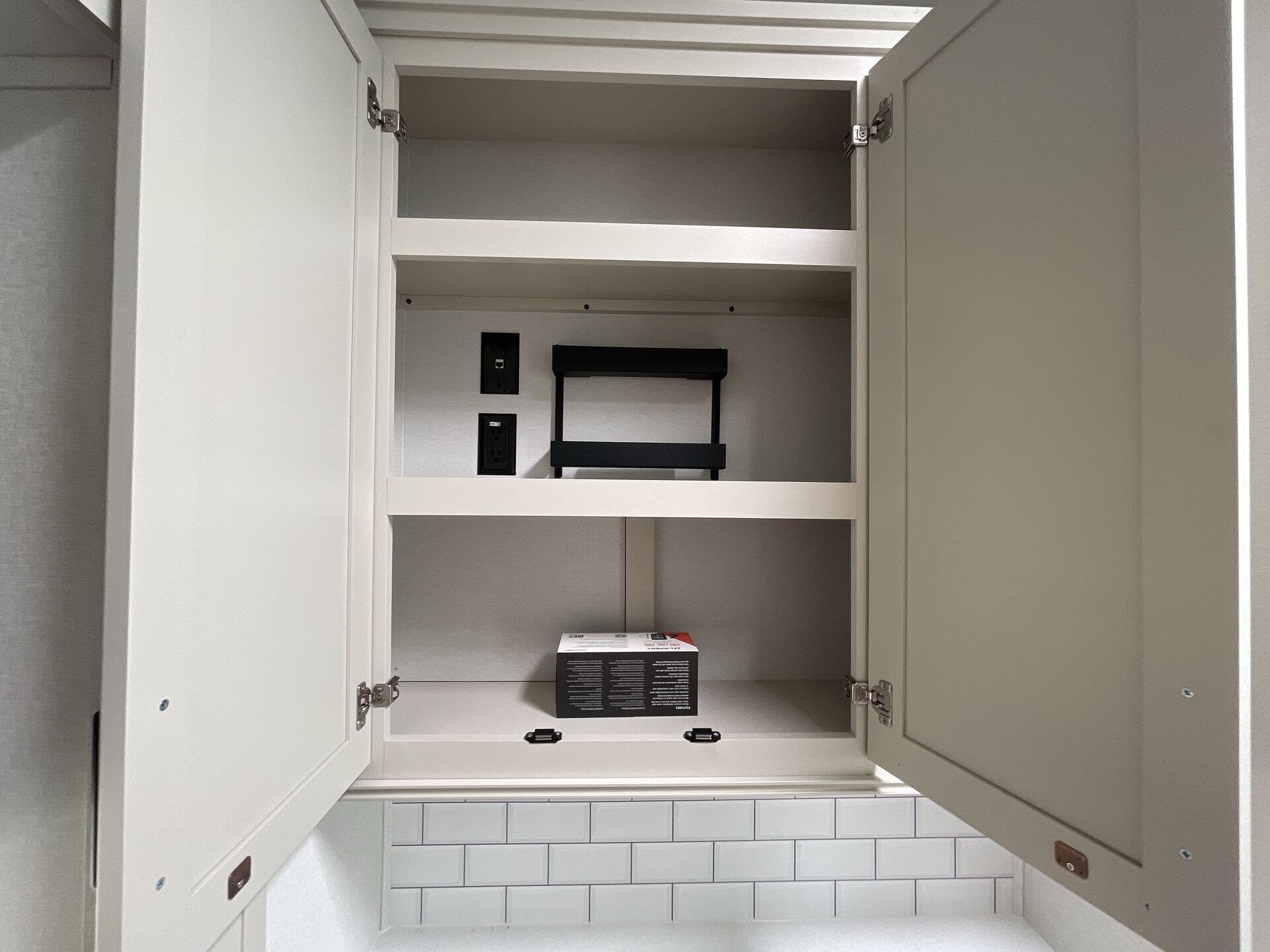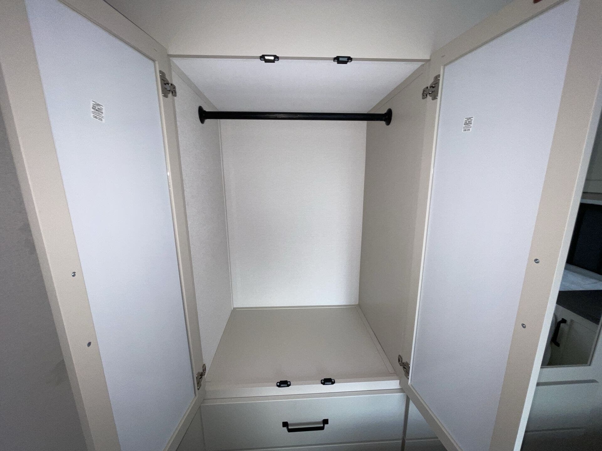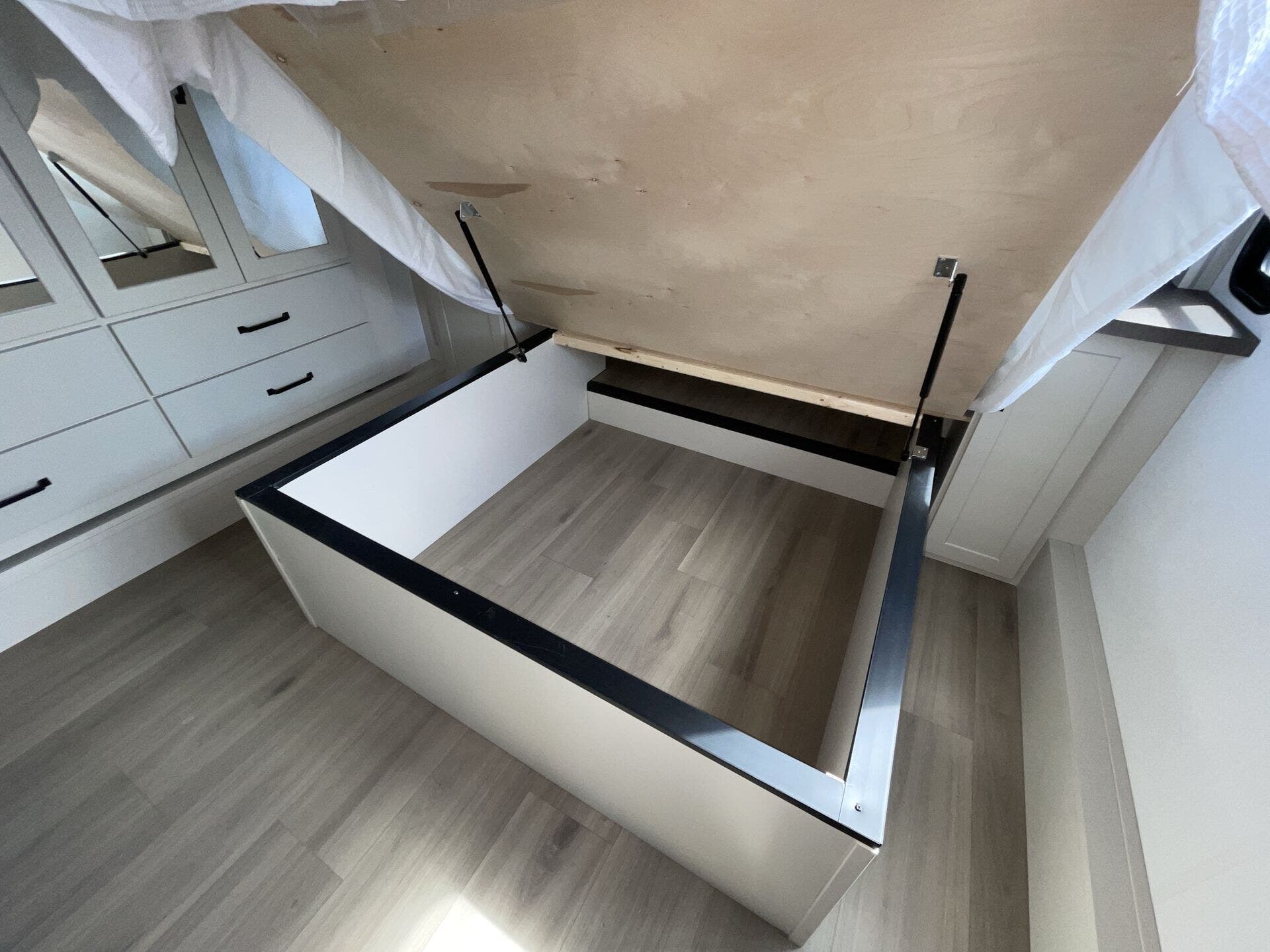 Inside, the Momentum G-Class 350G feels like a high-end retreat. The rear garage doubles as a versatile living space, complete with Happi-Jac rollover sofas, a half bath, and a rear patio system option for outdoor entertaining. In the main living area, you’ll find theater seating, a large LED TV, and a cozy fireplace that make downtime just as enjoyable as the adventure. The gourmet kitchen features solid surface countertops, stainless steel appliances, a residential-size refrigerator, and ample storage, making meal prep simple and enjoyable.