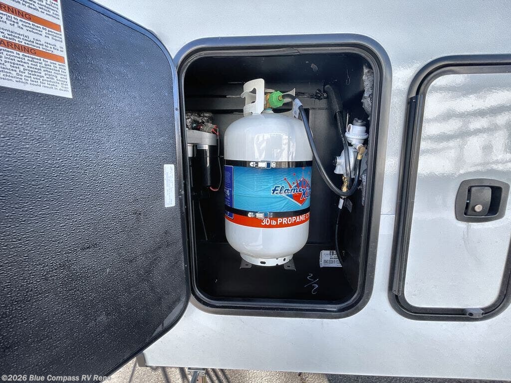 A 15' separate garage in this toy hauler offers plenty of space for your off-road toys! You will appreciate the convenience of having a full bathroom with a walk-in shower and there is washer and dryer prep so you can accommodate these appliances. You will also appreciate the two entry doors, and flip-up pet dish. The rear ramp door can even be converted into a patio, plus there are exterior speakers to keep the party going. Everyone will love hanging out in the separate living area with a fireplace at the entertainment center, theater seating, and a sectional sofa. The fully equipped kitchen has everything you need to prepare delicious home cooked meals. The front private bedroom offers an escape to rest and relax on a queen bed for the next ride!