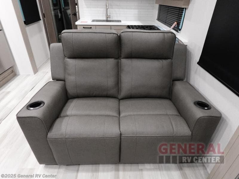 A 14' separate garage in this toy hauler offers plenty of space for your off-road toys! You will appreciate the convenience of having a full bathroom with a walk-in shower and you can even add an optional half bath to the garage area. You will also appreciate the two entry doors, and flip-up pet dish. The rear ramp door can even be converted into a patio, plus there are exterior speakers to keep the party going. Everyone will love hanging out in the separate living area with a fireplace at the entertainment center, two theater seating slides, and a third theater seating. The fully equipped kitchen has everything you need to prepare delicious home cooked meals. The front private bedroom offers an escape to rest and relax on a queen bed for the next ride!