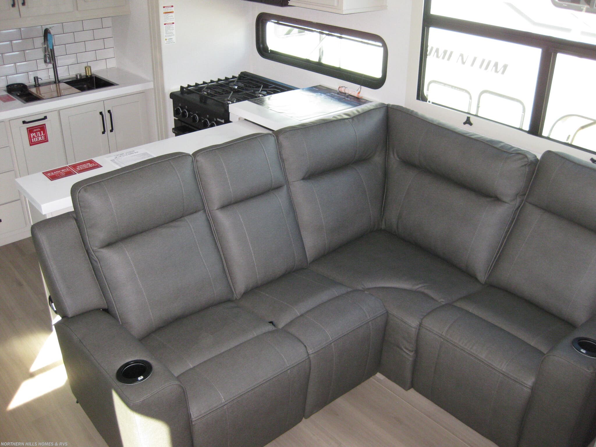 - Living space: Bench seating and expansive living area enabled by three slideouts