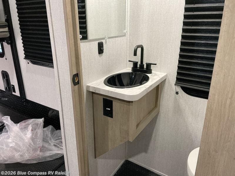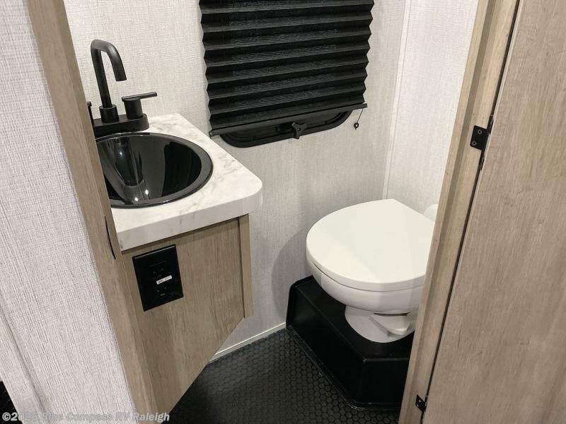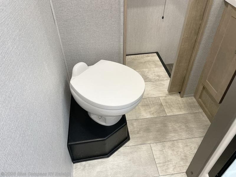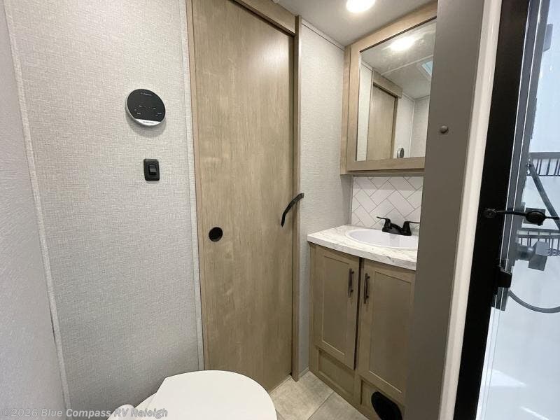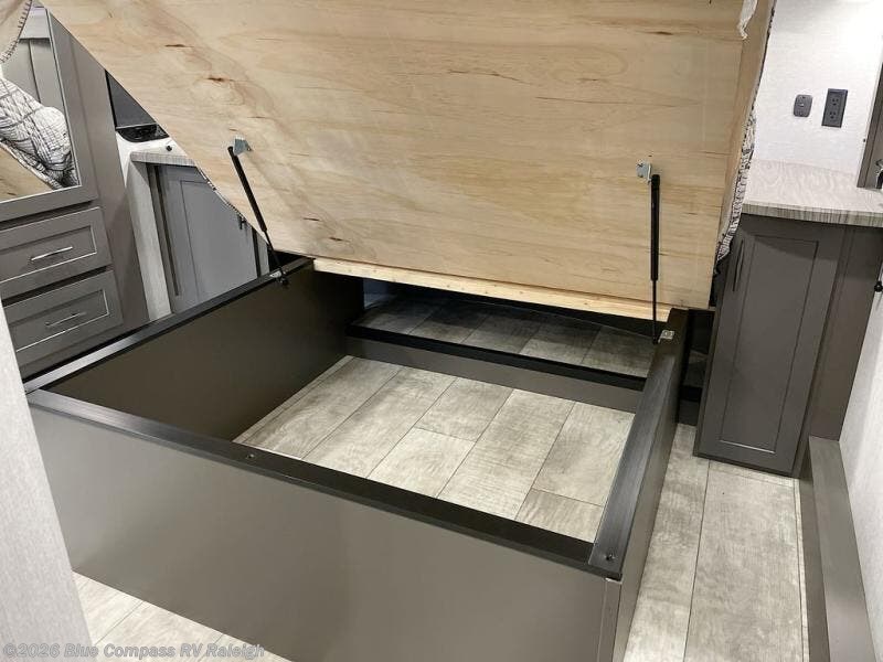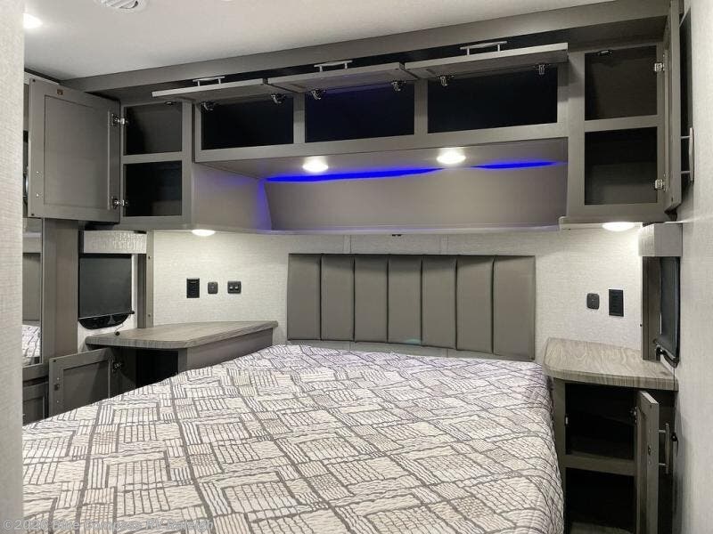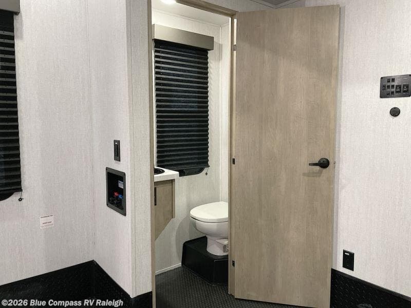 You want a toy hauler to carry your toys to the trails, and include many at-home comforts, and that's just what this unit delivers. A 14' separate garage includes an adjustable tie-down system, an optional Lifesuite System for more sleeping space, an optional half bath, plus washer and dryer prep. There is an overhead loft bed and an L-shaped sofa with recline in the main living area that offers sleeping space as well. Everyone can watch a movie on the LED TV with a fireplace below while sitting on the sofa, in the theatre seats, or while at the free standing dinette with four chairs. The chef will have upgraded appliances to make meals for everyone, an L-shaped countertop with a kitchen sink, and a USB charging outlet. You will love the shower with seat in the full bathroom with two space savings sliding doors that lead into the hallway, and into the front bedroom where you will have a walk-around queen bed, a slide out wardrobe and more USB charging outlets.