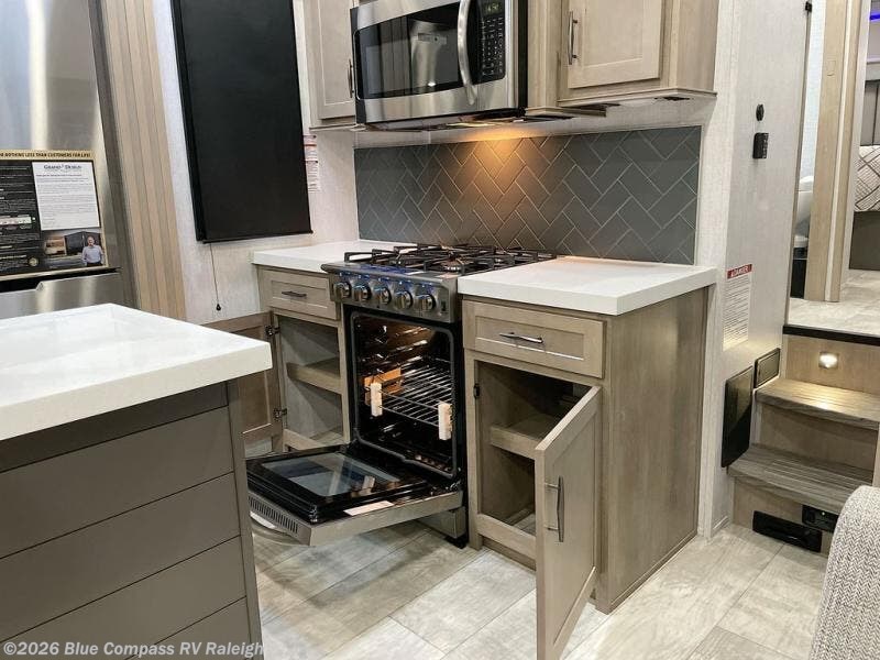 With any Momentum M-Class toy hauler by Grand Design, you will enjoy luxury at every turn! They have been constructed to a superior standard with a thermal roof design, triple insulated main floor and garage floor, and a Rail-Tite underbelly seal that will allow you to camp in all elements. Each model also features an 8' 5" wide body chassis with a wide rail design, no wheel wheels, and a dovetail entry for easier loading. The Stealth A/C system provides maximum cooling power, and the CRE3000 suspension system means you can enjoy a smooth tow each time. You will love the luxurious interior with a professional grade stainless steel cooktop, interior color changing LED accent lighting, a fiberglass shower with a glass door, and solid surface countertops.