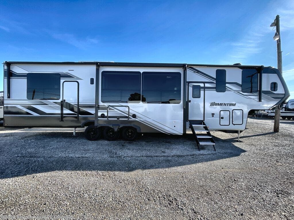With any Momentum M-Class toy hauler by Grand Design, you will enjoy luxury at every turn! They have been constructed to a superior standard with a thermal roof design, triple insulated main floor and garage floor, and a Rail-Tite underbelly seal that will allow you to camp in all elements. Each model also features an 8' 5" wide body chassis with a wide rail design, no wheel wheels, and a dovetail entry for easier loading. The Stealth A/C system provides maximum cooling power, and the CRE3000 suspension system means you can enjoy a smooth tow each time. You will love the luxurious interior with a professional grade stainless steel cooktop, interior color changing LED accent lighting, a fiberglass shower with a glass door, and solid surface countertops.