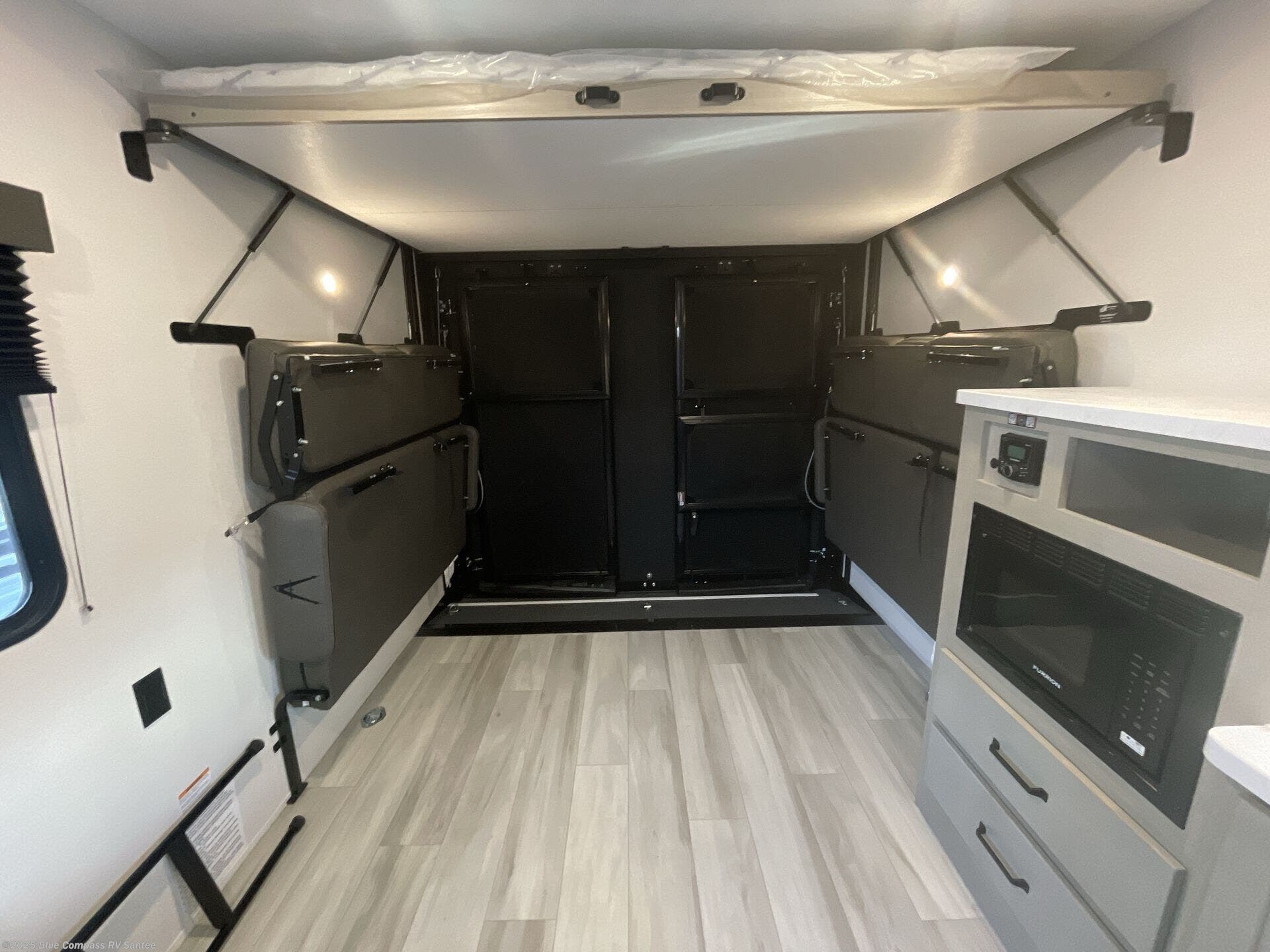 You will love this Momentum MAV toy hauler travel trailer! The front bedroom features a queen bed, and there is plenty of room to walk around. The sliding solid bedroom door helps with space. Overhead storage and a pair of nightstands are convenient storage, plus there is a wardrobe with both drawers and space to hang items. The kitchen offers a microwave, stainless steel sink, and an 8 cu. ft. 12V refrigerator. In the garage, you'll find rollover sofas with a table and a top bed for guests to sleep on. The ramp door/patio will provide additional living space once your toys are unloaded, and the pull down screen will keep bugs out!
