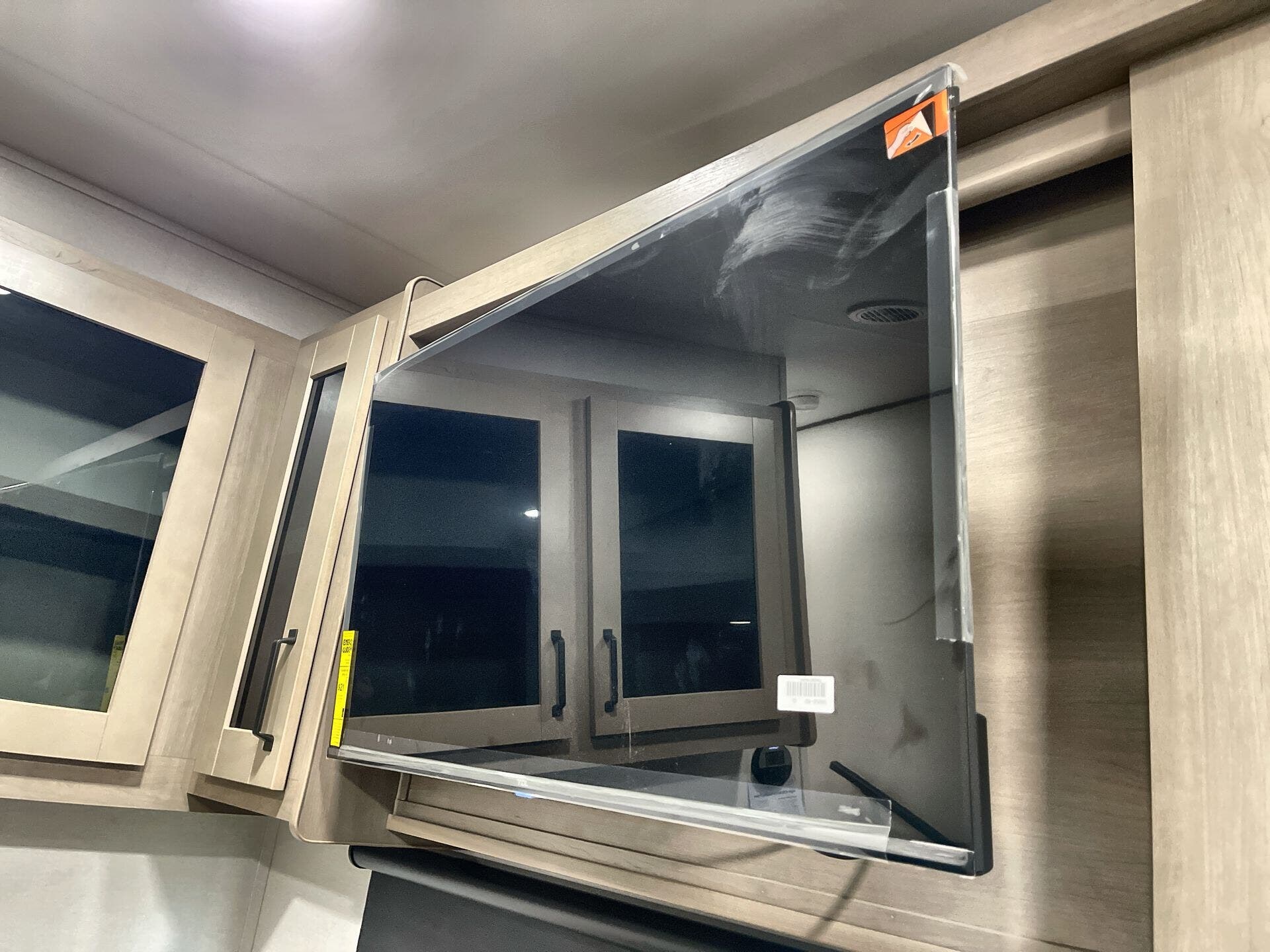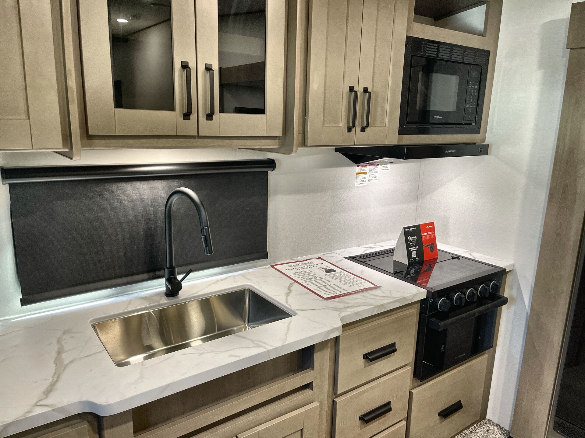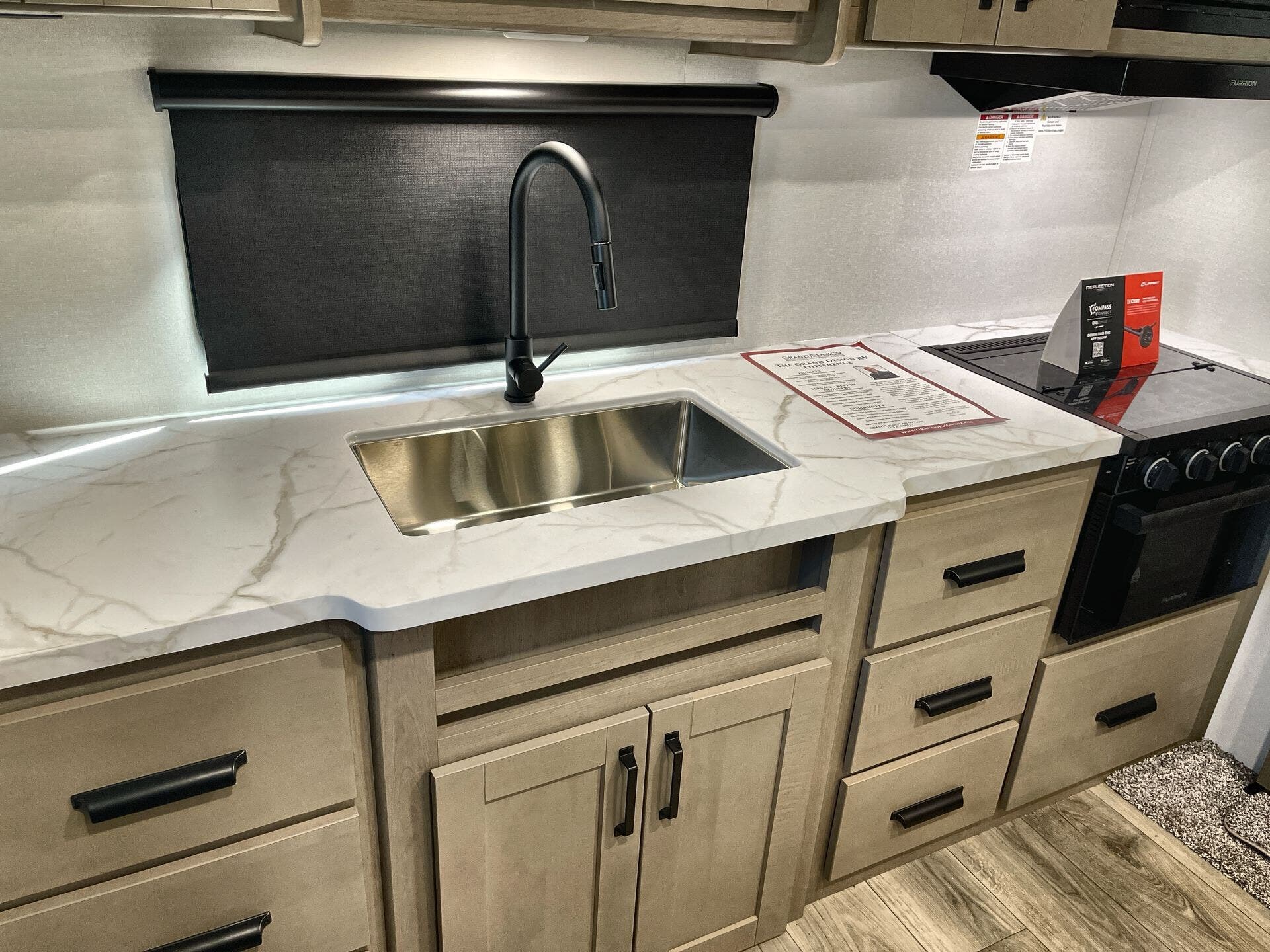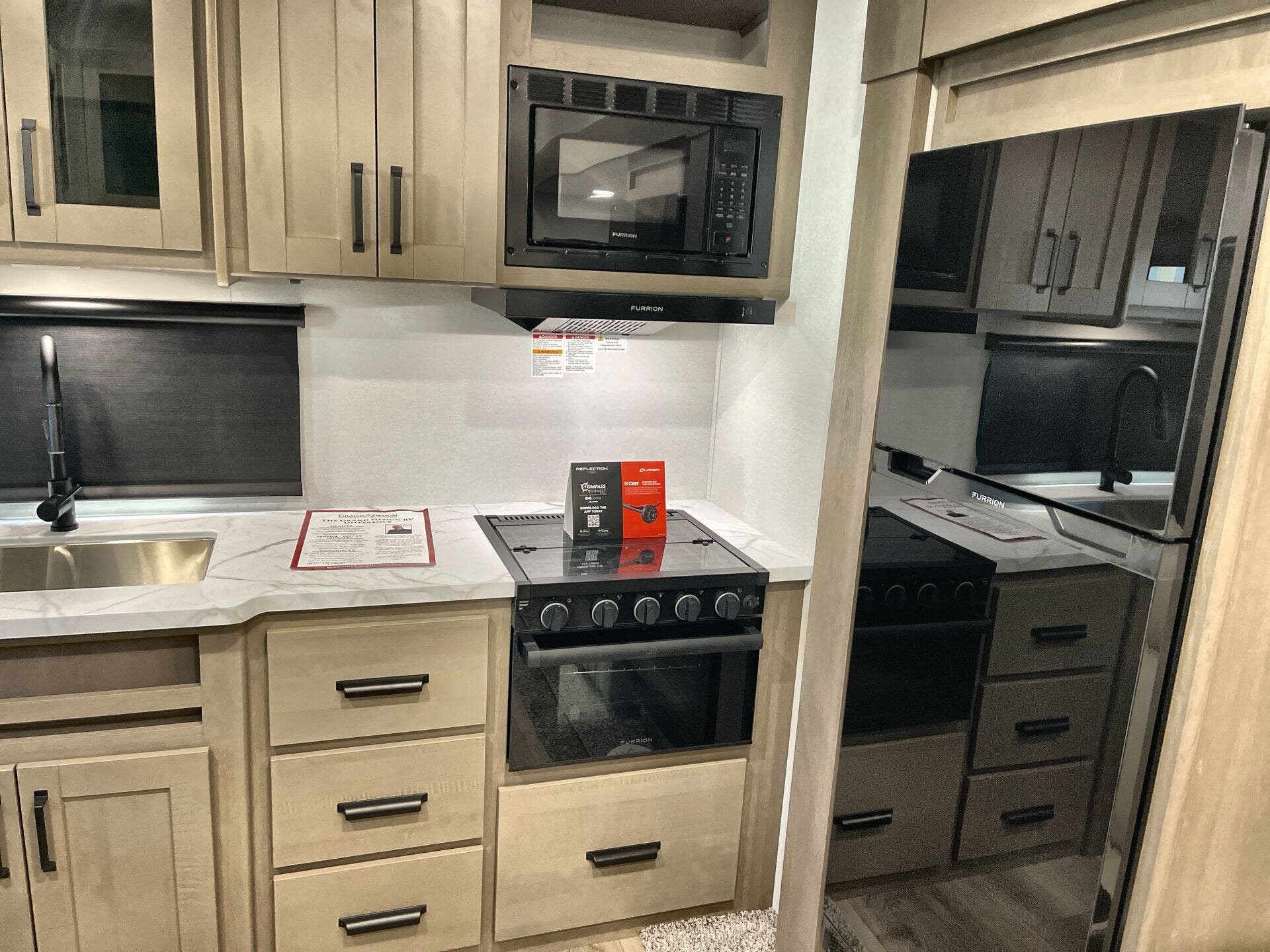 The Reflection 22RK floorplan optimizes usable space, featuring a Rear Kitchen that keeps the living area open and social. A cozy Theater Seating arrangement and a Queen Bed create true home-like comfort, while the U-Shaped Dinette provides versatile dining and workspace. The single slide-out enhances the interior footprint, ensuring generous room for entertaining or unwinding after a day of adventures.