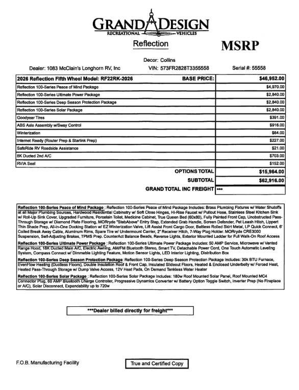 Stock Number: 15789 • Status: New • Year: 2026 • Brand: Grand Design • Model: Reflection • Type: Fifth Wheel • Floorplan: 100 22RK • Sleeps: 4 • Floorplan Type: Front Bedroom / Mid Bath / Mid Living Area / Rear Kitchen / U-Shaped Dinette