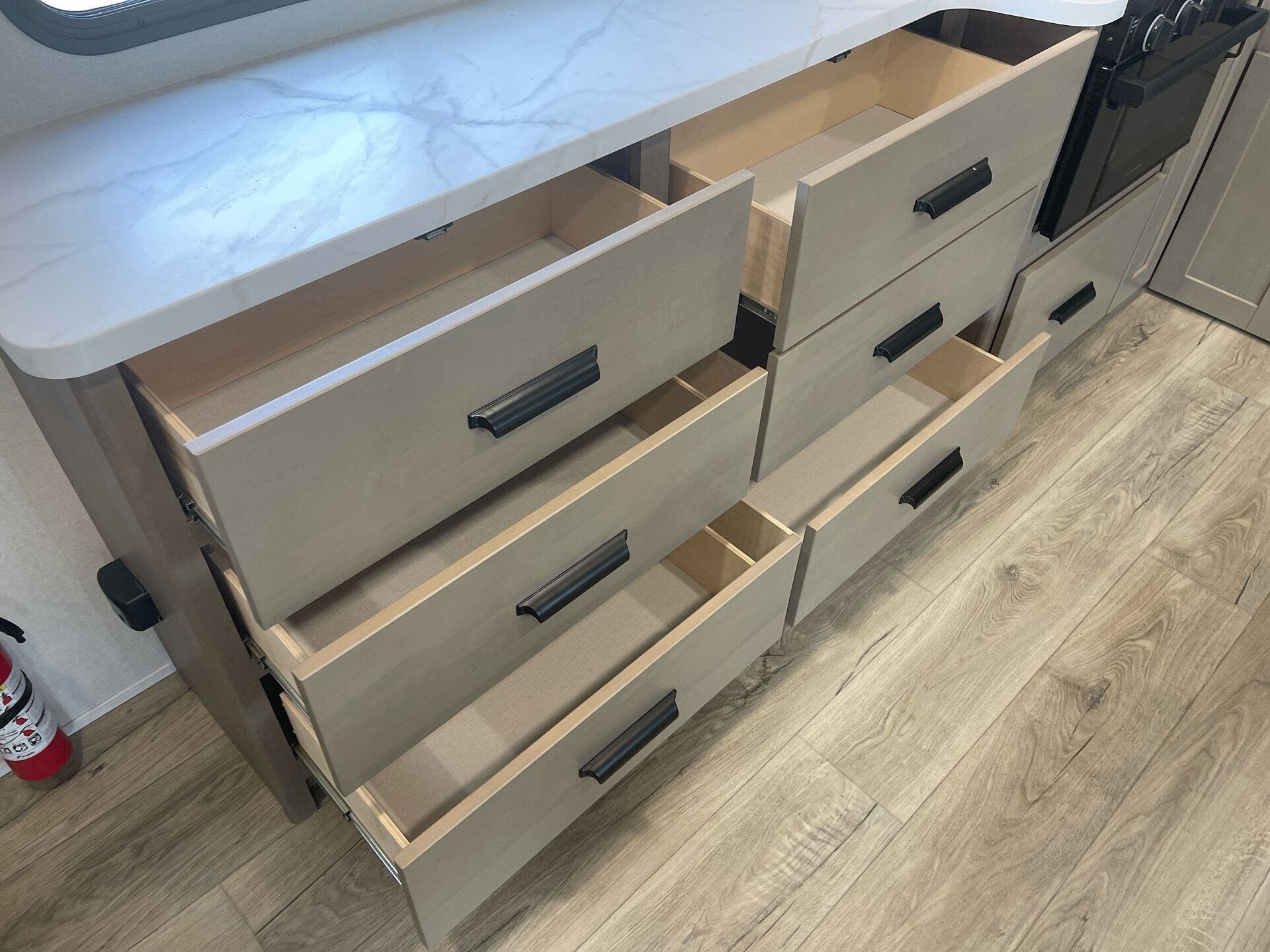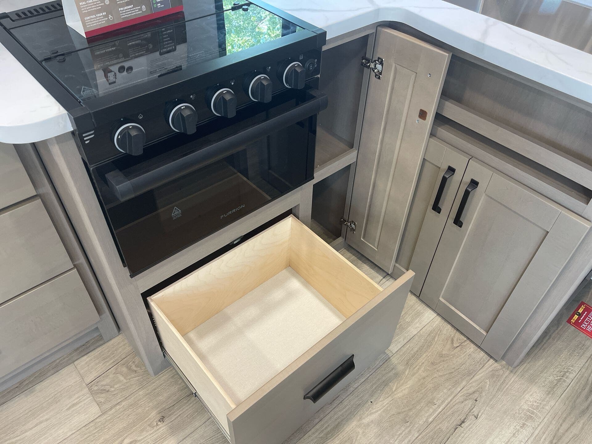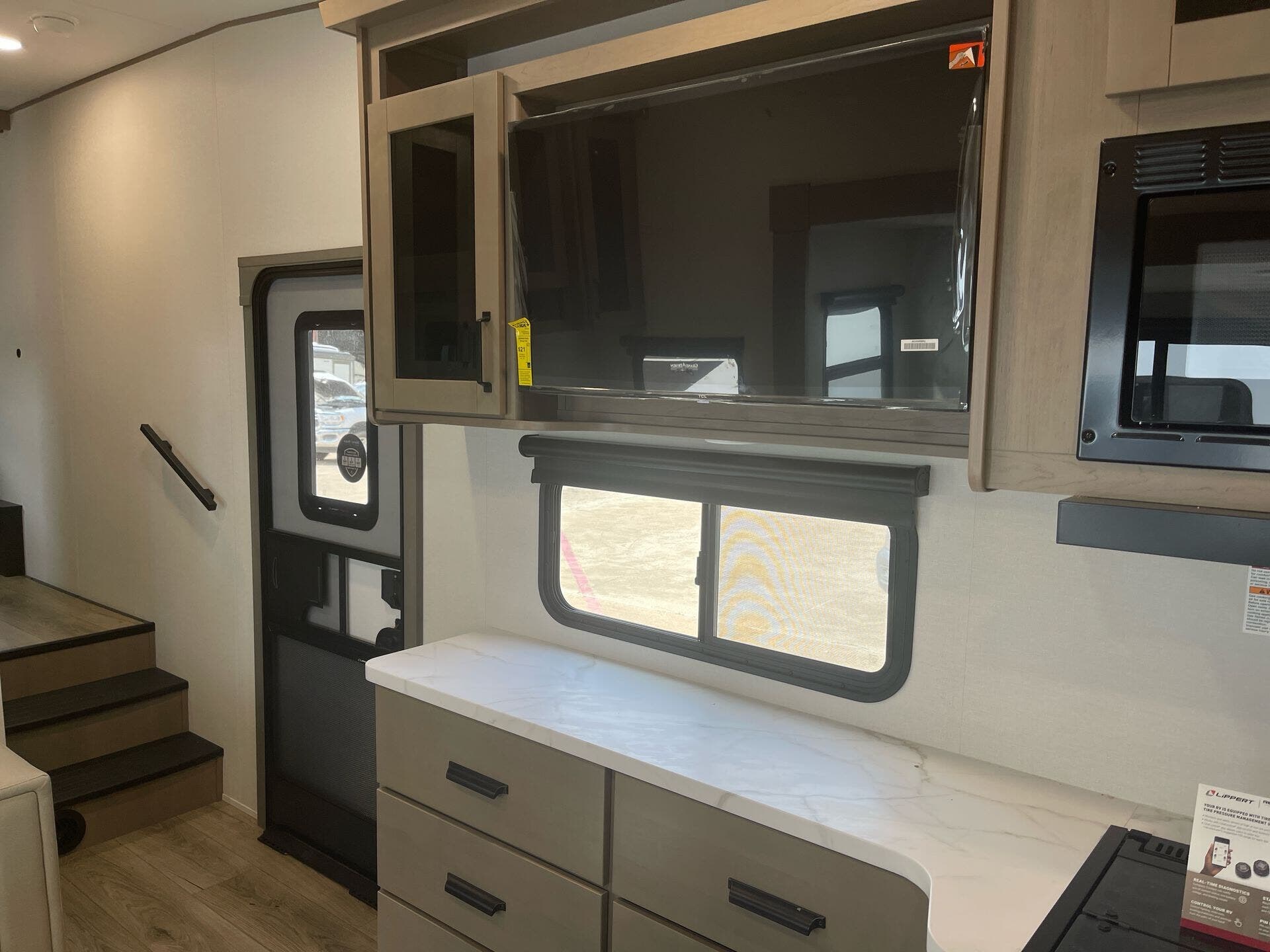 Built for year-round use, it includes a tankless on-demand water heater, a 30,000 BTU furnace, and a 15,000 BTU air conditioner. Exterior features such as a 20′ “one-touch” electric LED awning, safety-glass windows, solid construction including aluminum cage framing, and bundled protection and solar packages elevate durability and off-grid readiness.