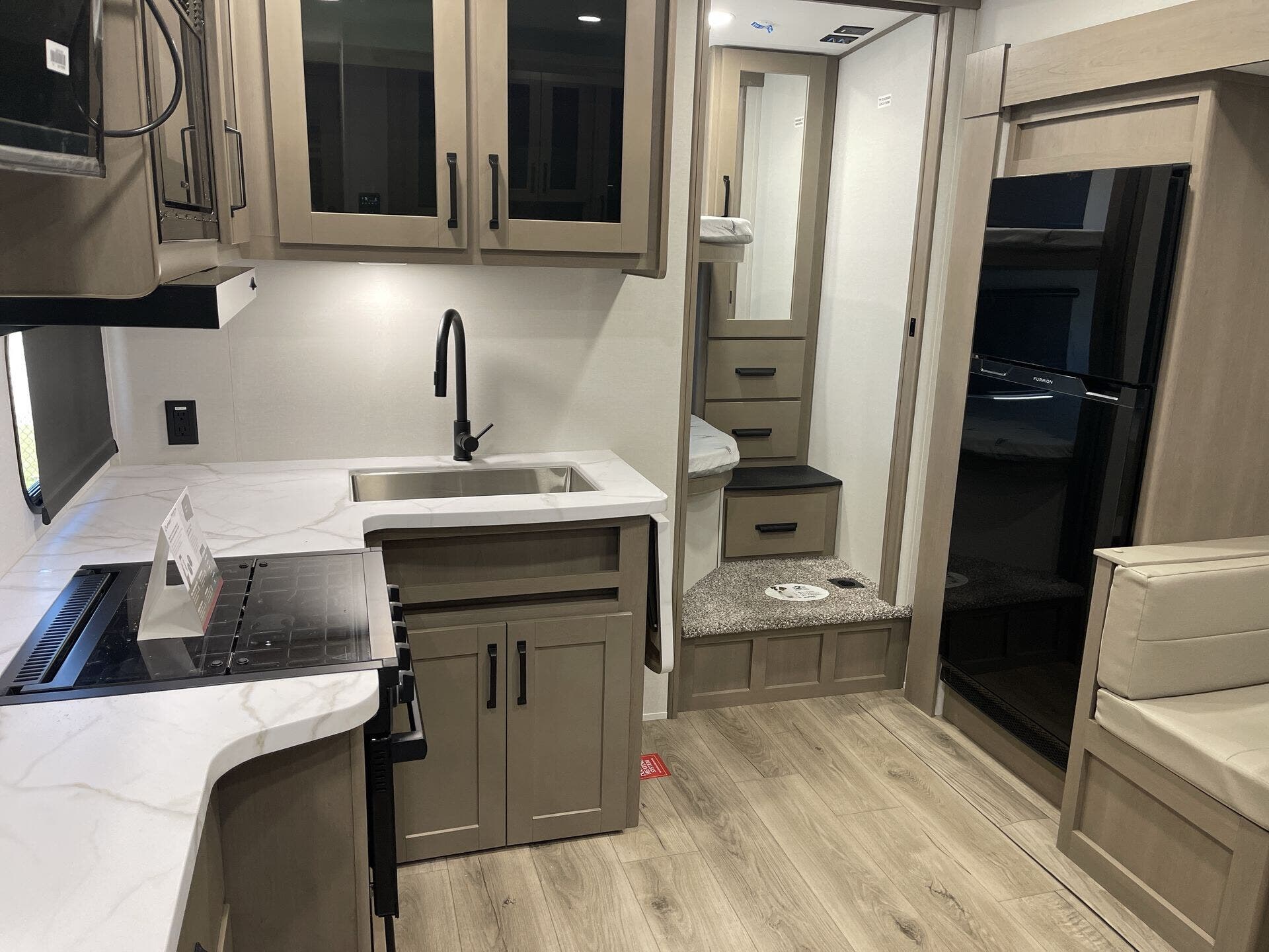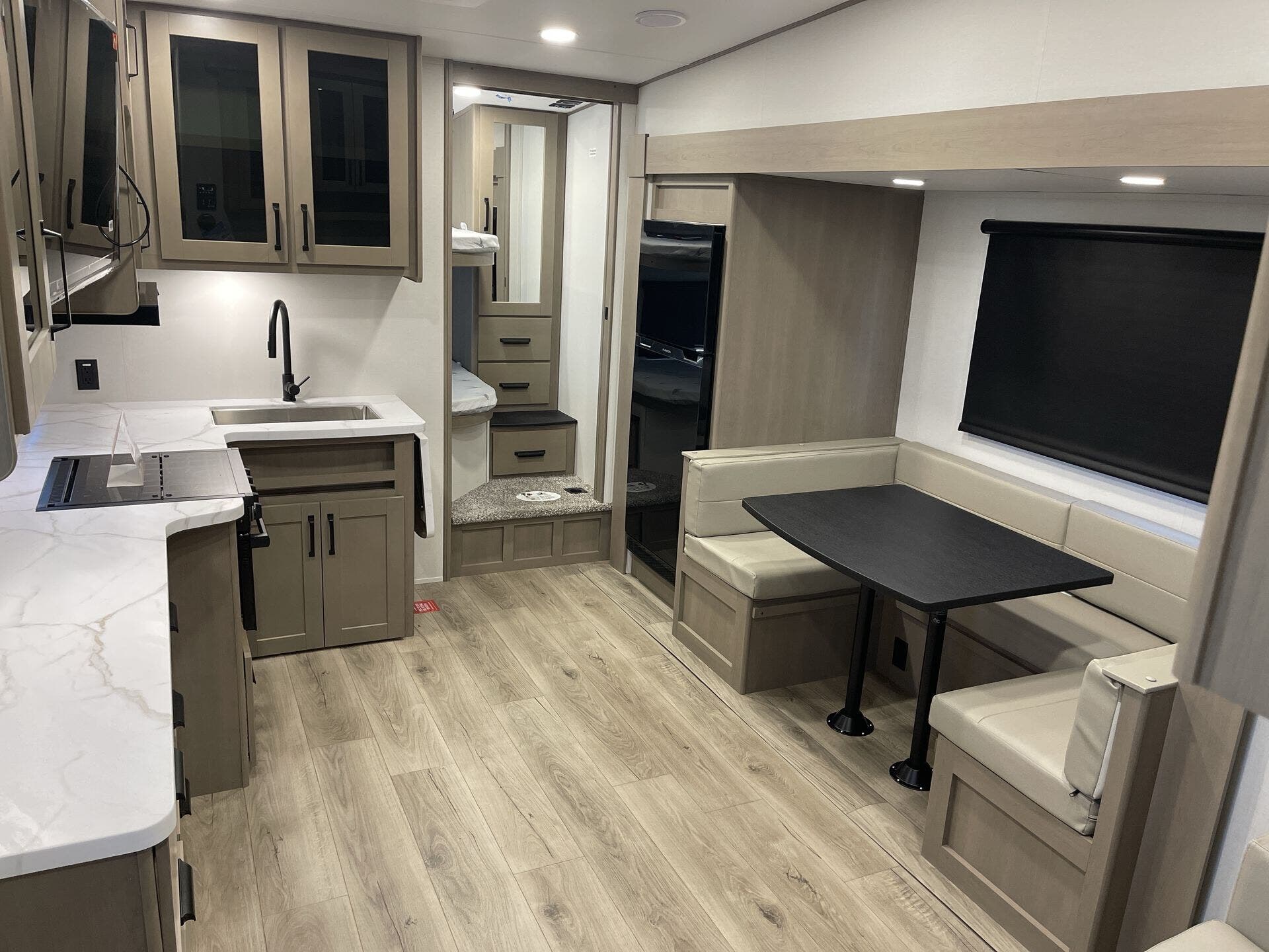 - Bath and sleeping: Front bath, bunk beds, front bedroom, dinette