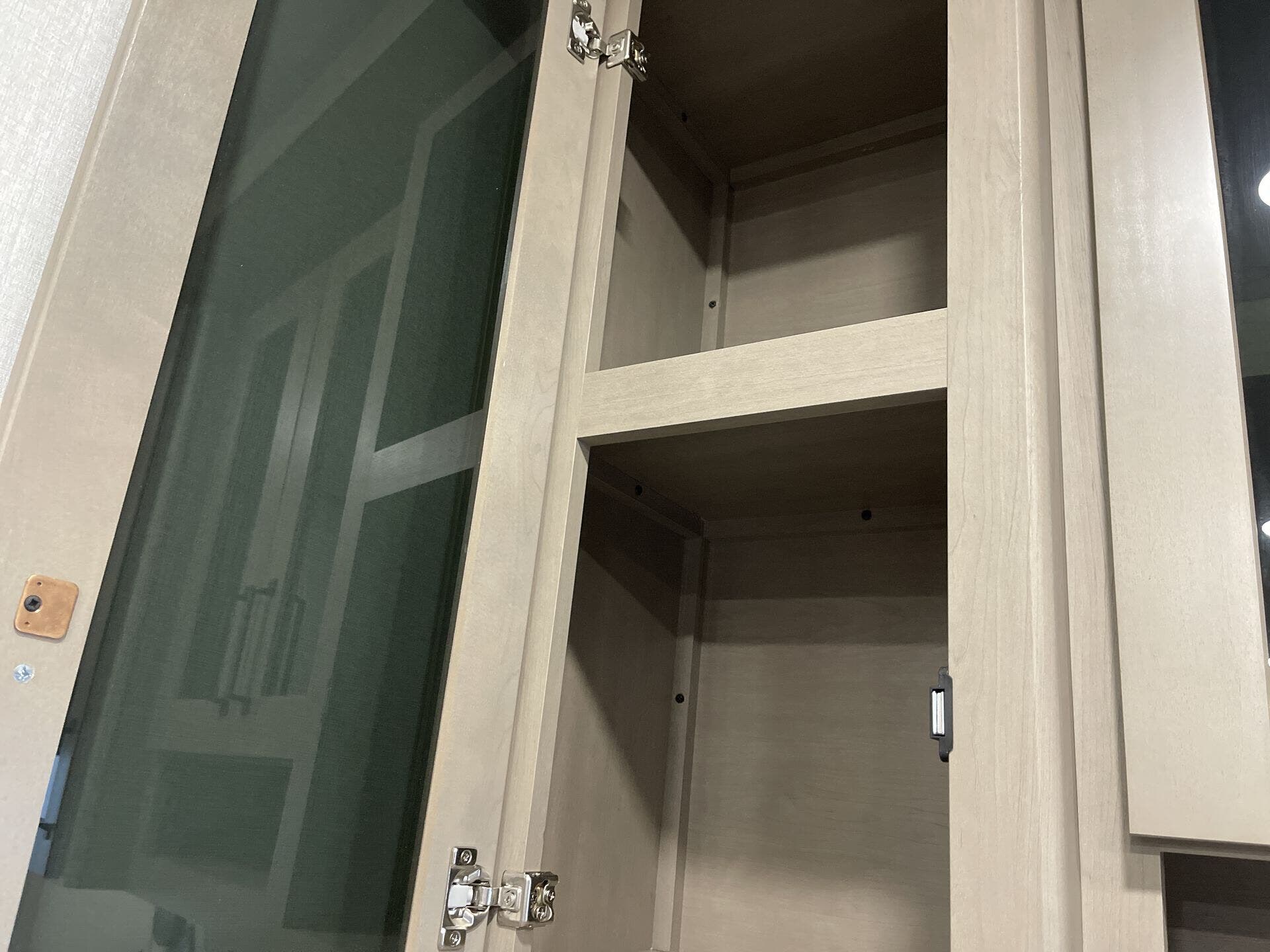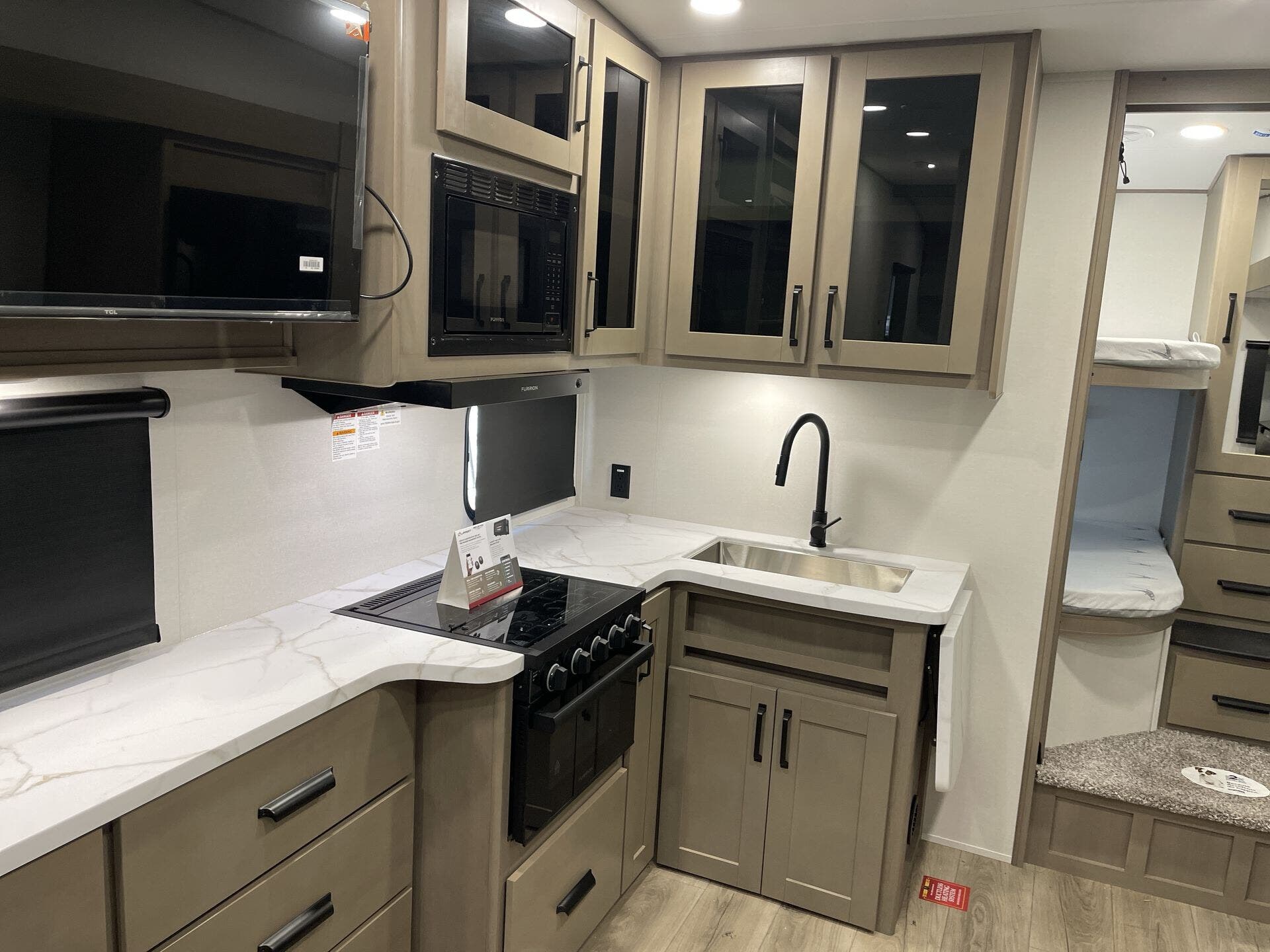 The Reflection’s floor plan blends bunk beds, a front bedroom, and a front bath with a spacious rear living area. A central dinette features a versatile U-shaped setup for family meals or work zones, while overhead cabinetry, a medicine cabinet, and a dedicated TV keep essentials organized and accessible. One well-placed slide-out enhances the living space without compromising overall length, making interior traffic flow effortless and comfortable.