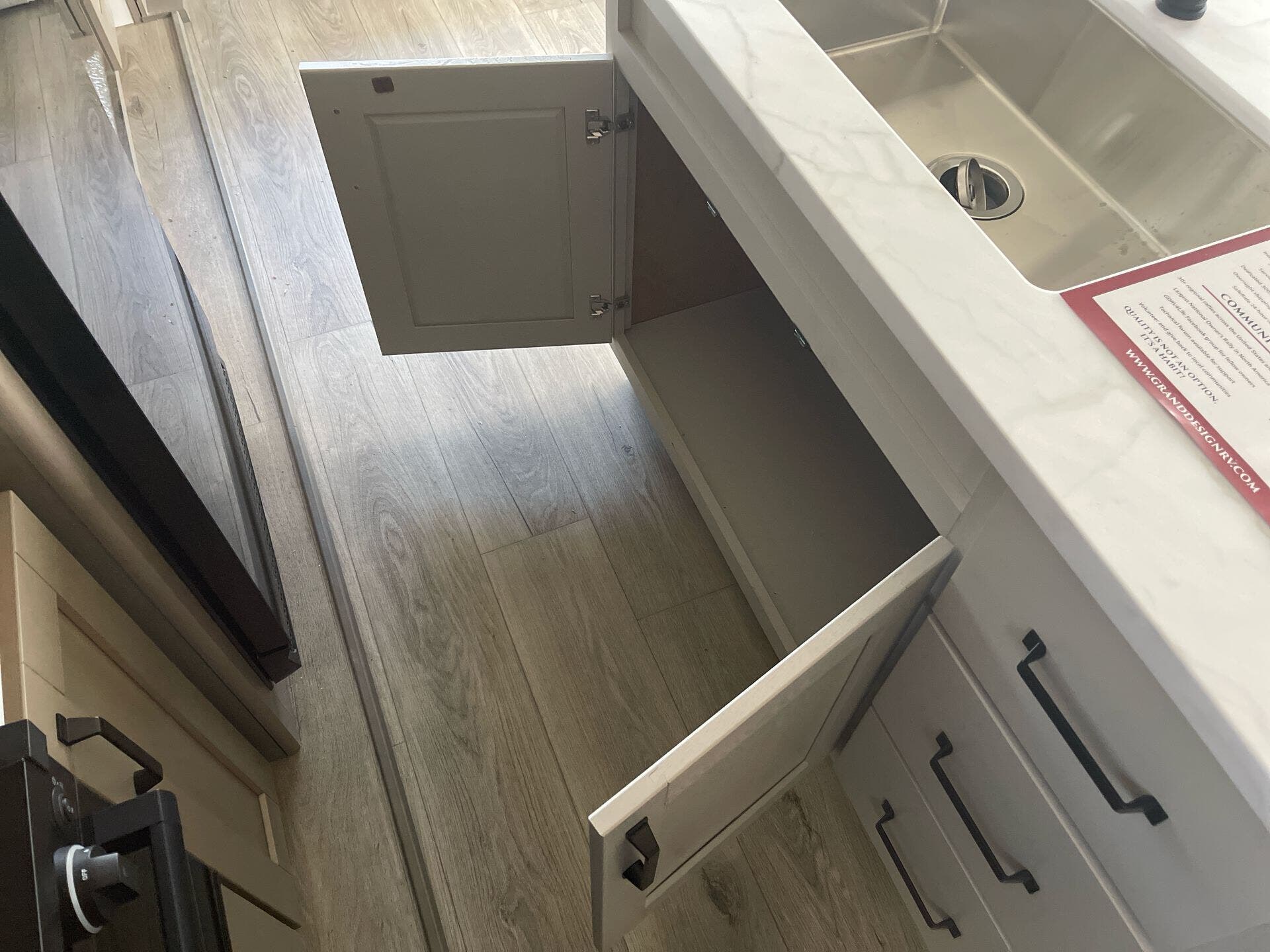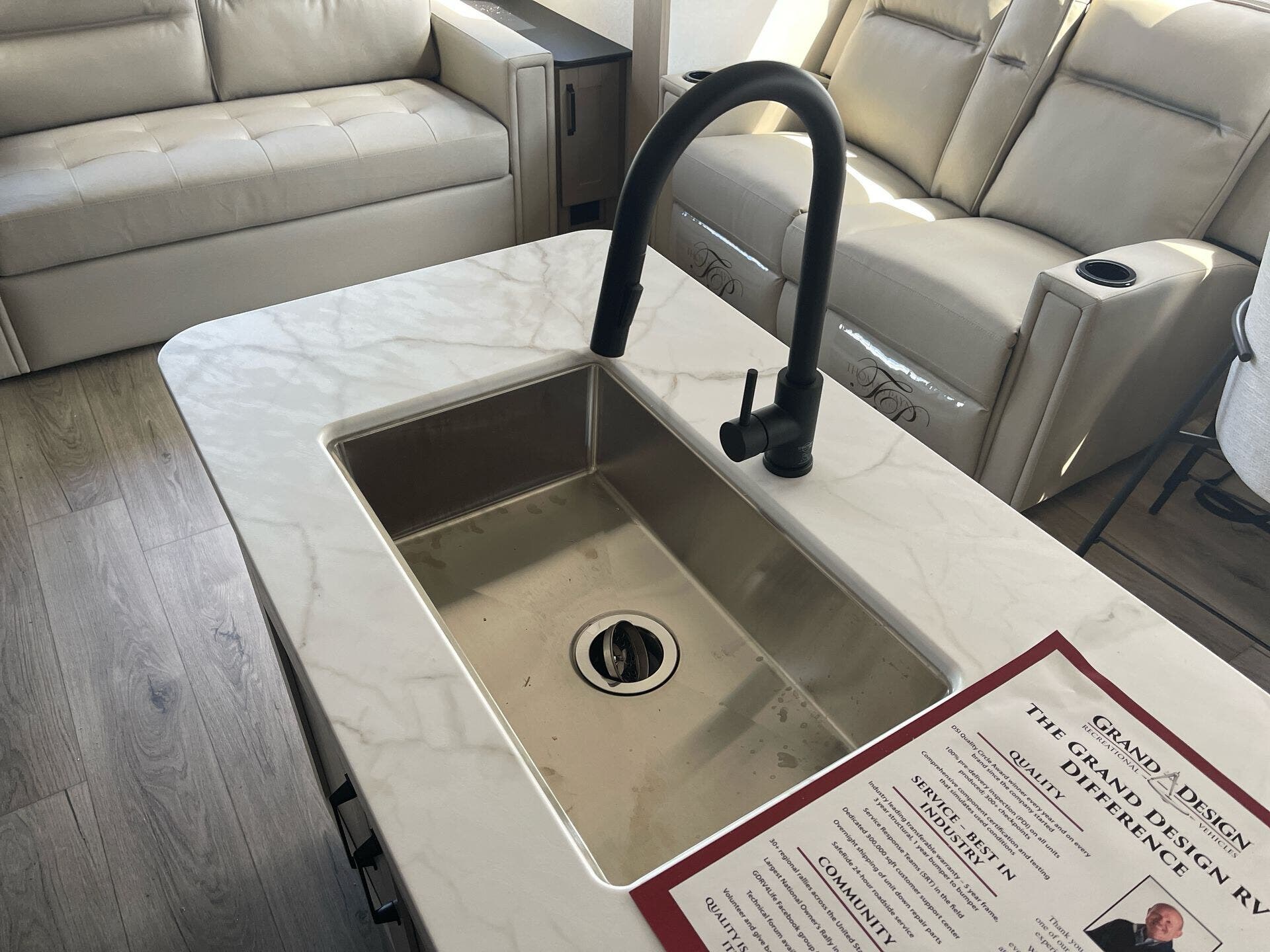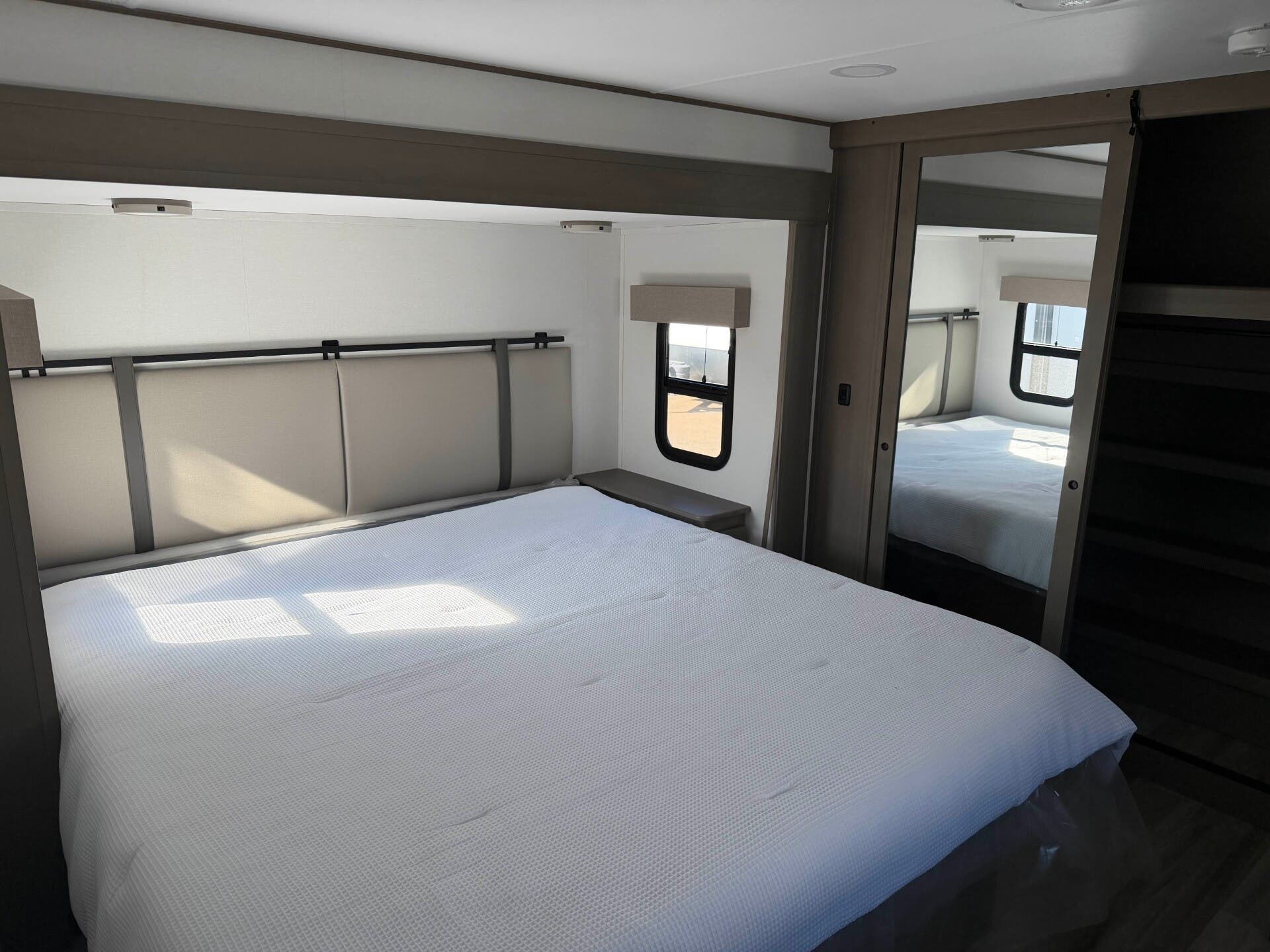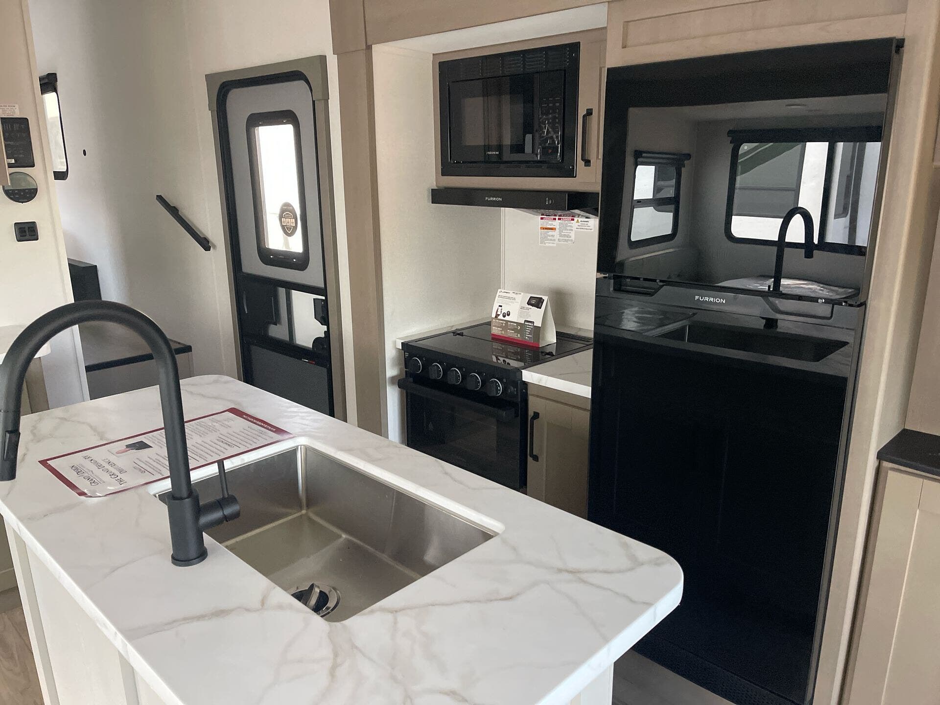 The kitchen is smart and functional, centered around an island layout with solid-surface counters, deep stainless sink, a 10 cu ft 12V refrigerator, and residential-style cabinetry. The open layout and large pass-through storage make this layout ideal for couples or small families who want portability without sacrificing liveability.