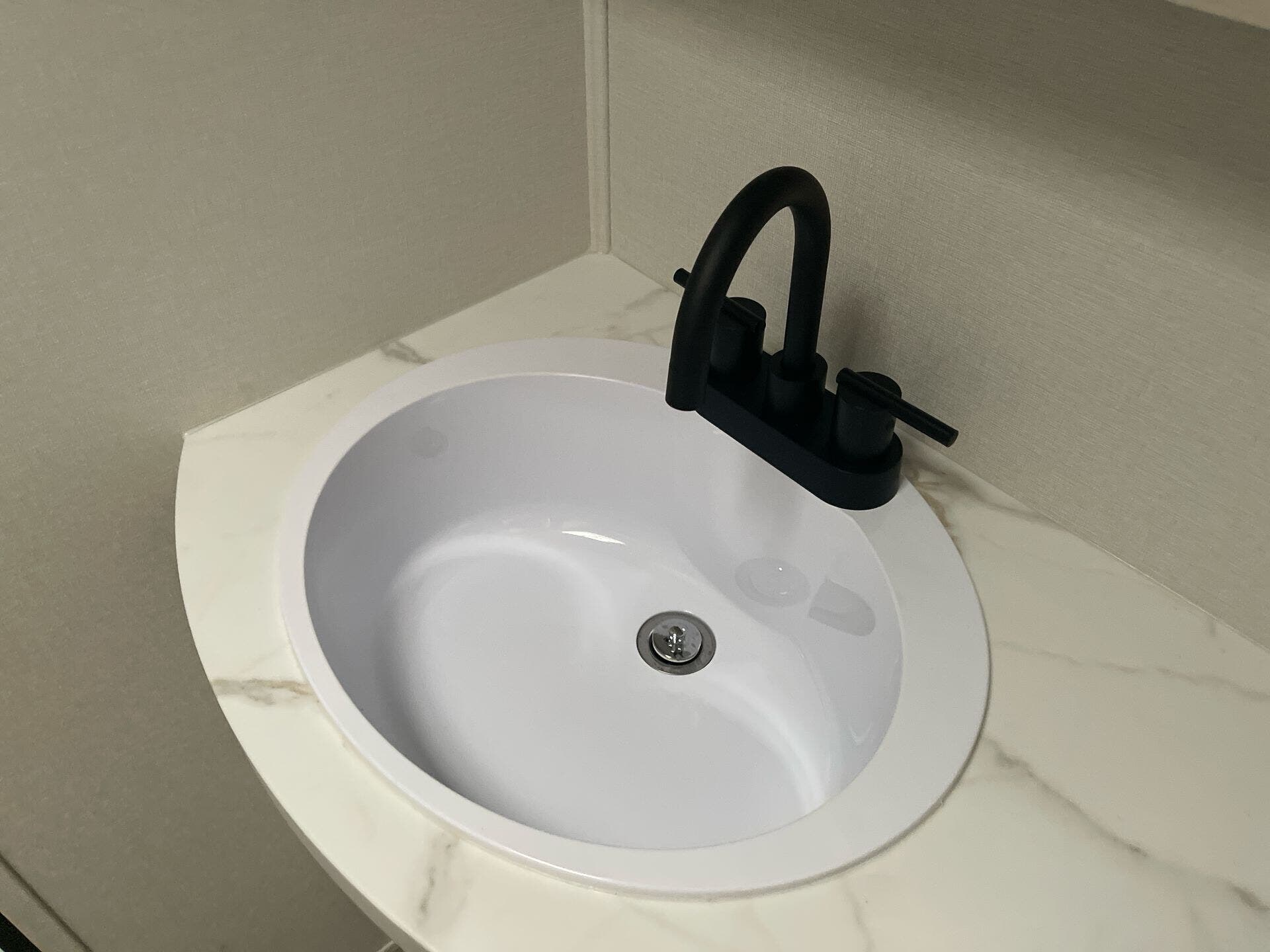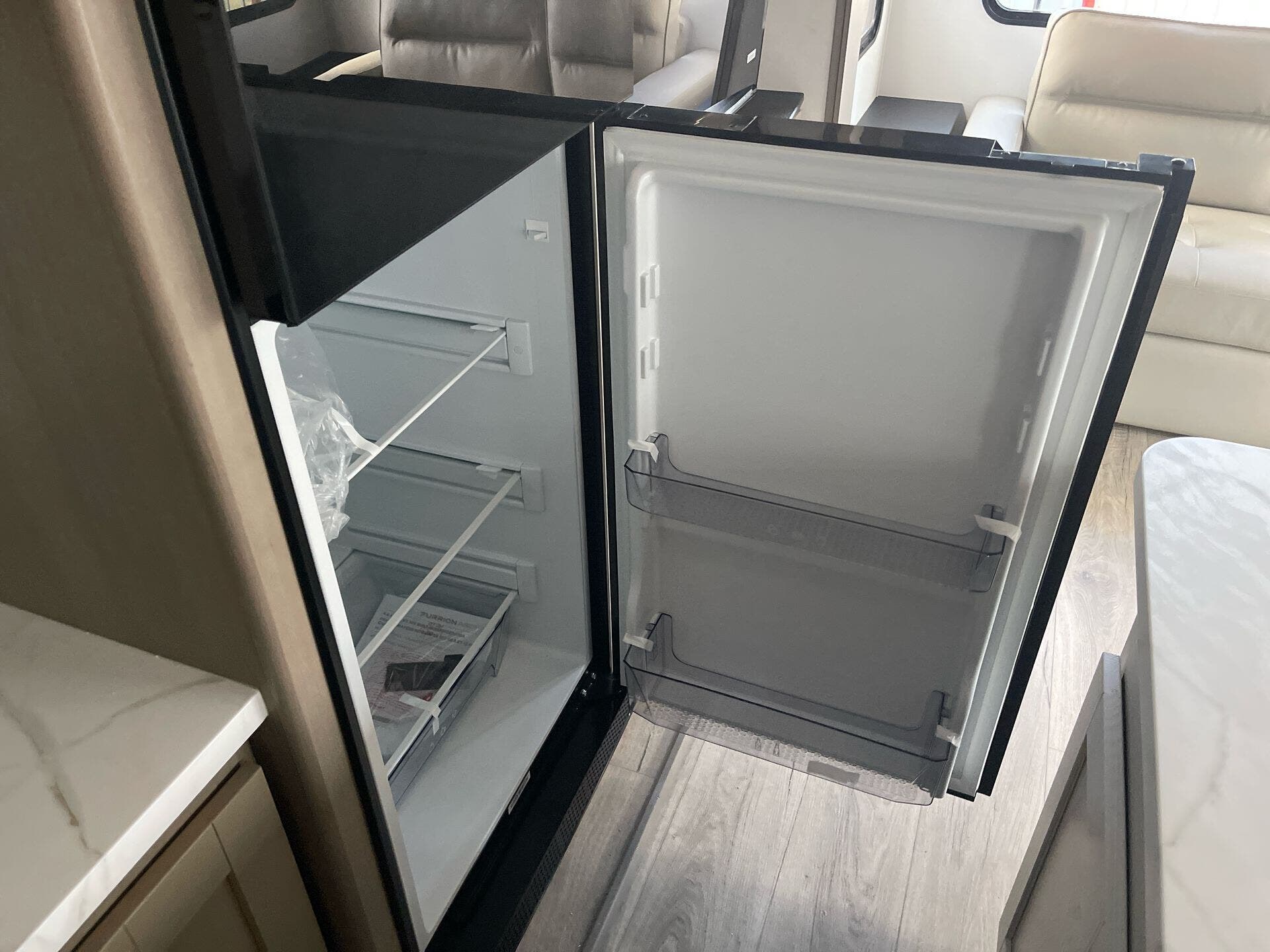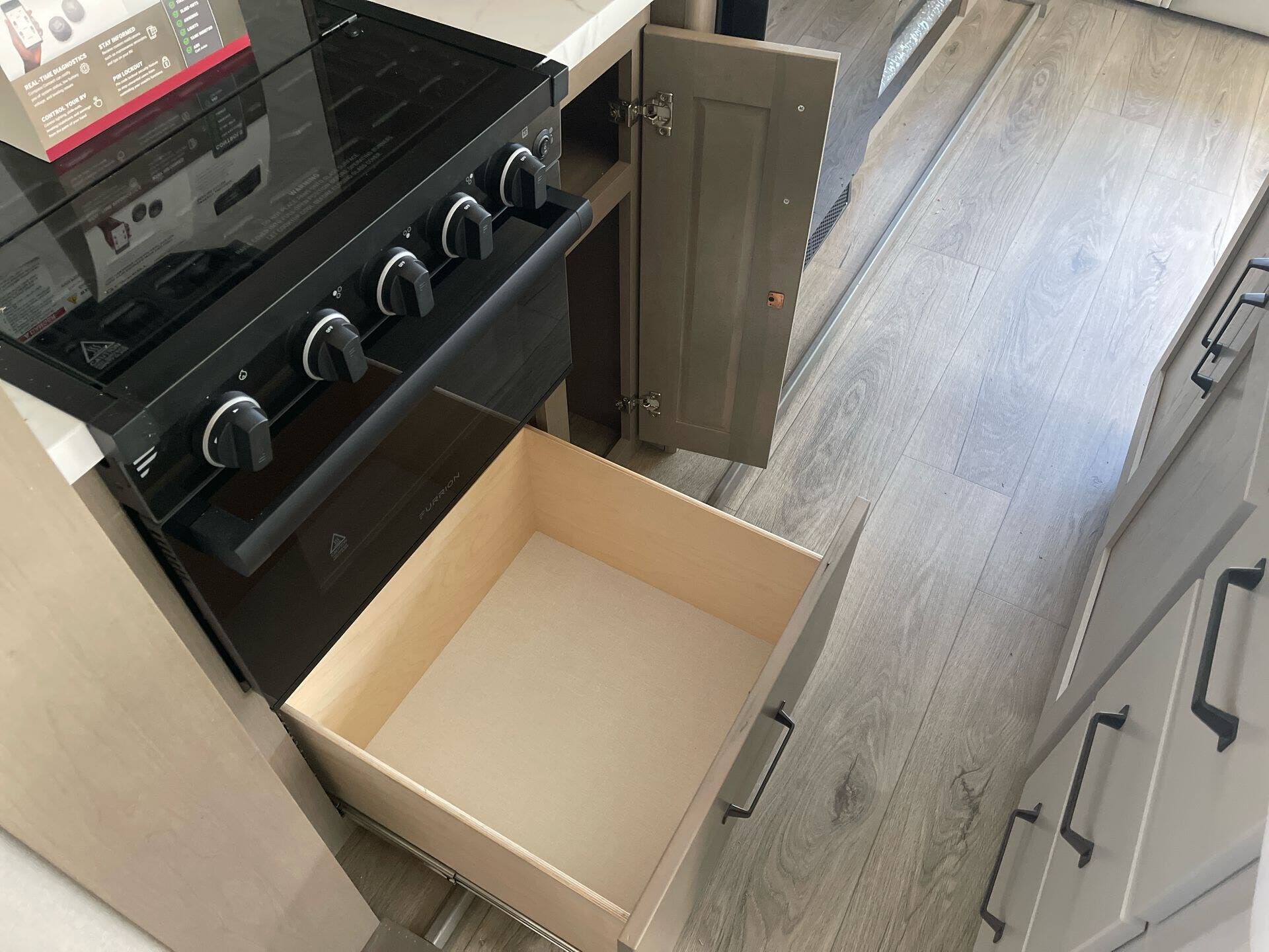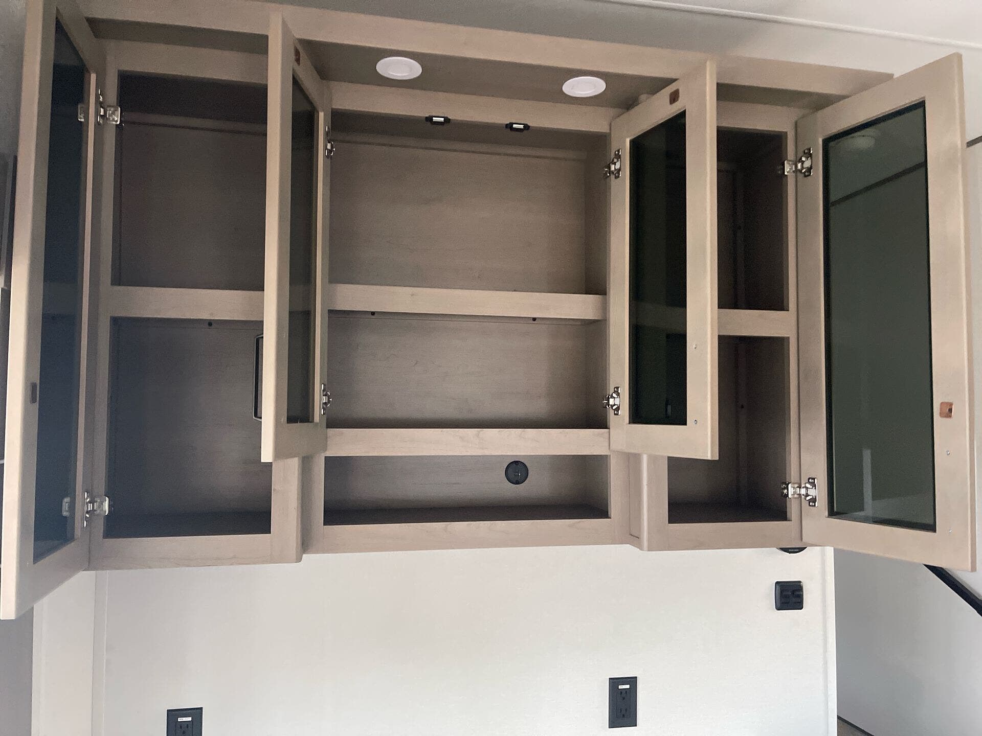 The kitchen is smart and functional, centered around an island layout with solid-surface counters, deep stainless sink, a 10 cu ft 12V refrigerator, and residential-style cabinetry. The open layout and large pass-through storage make this layout ideal for couples or small families who want portability without sacrificing liveability.