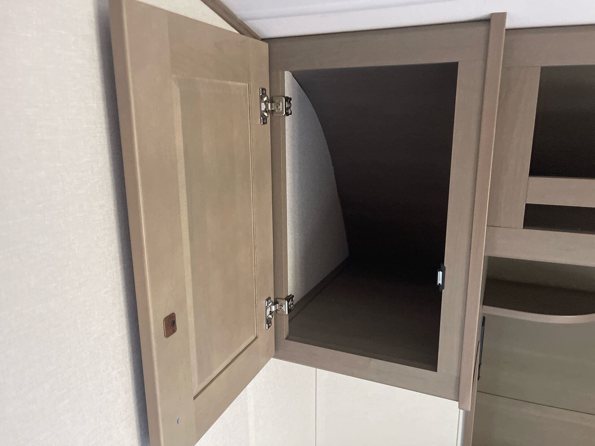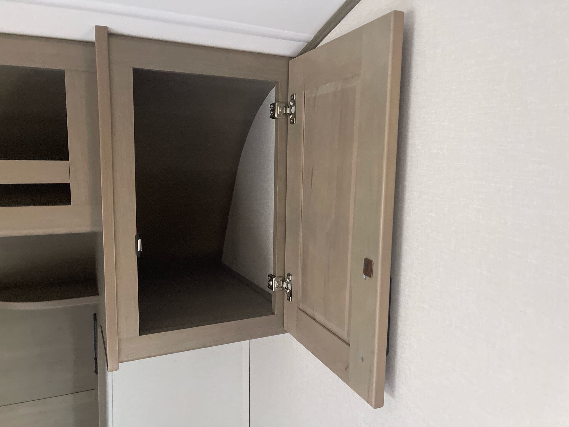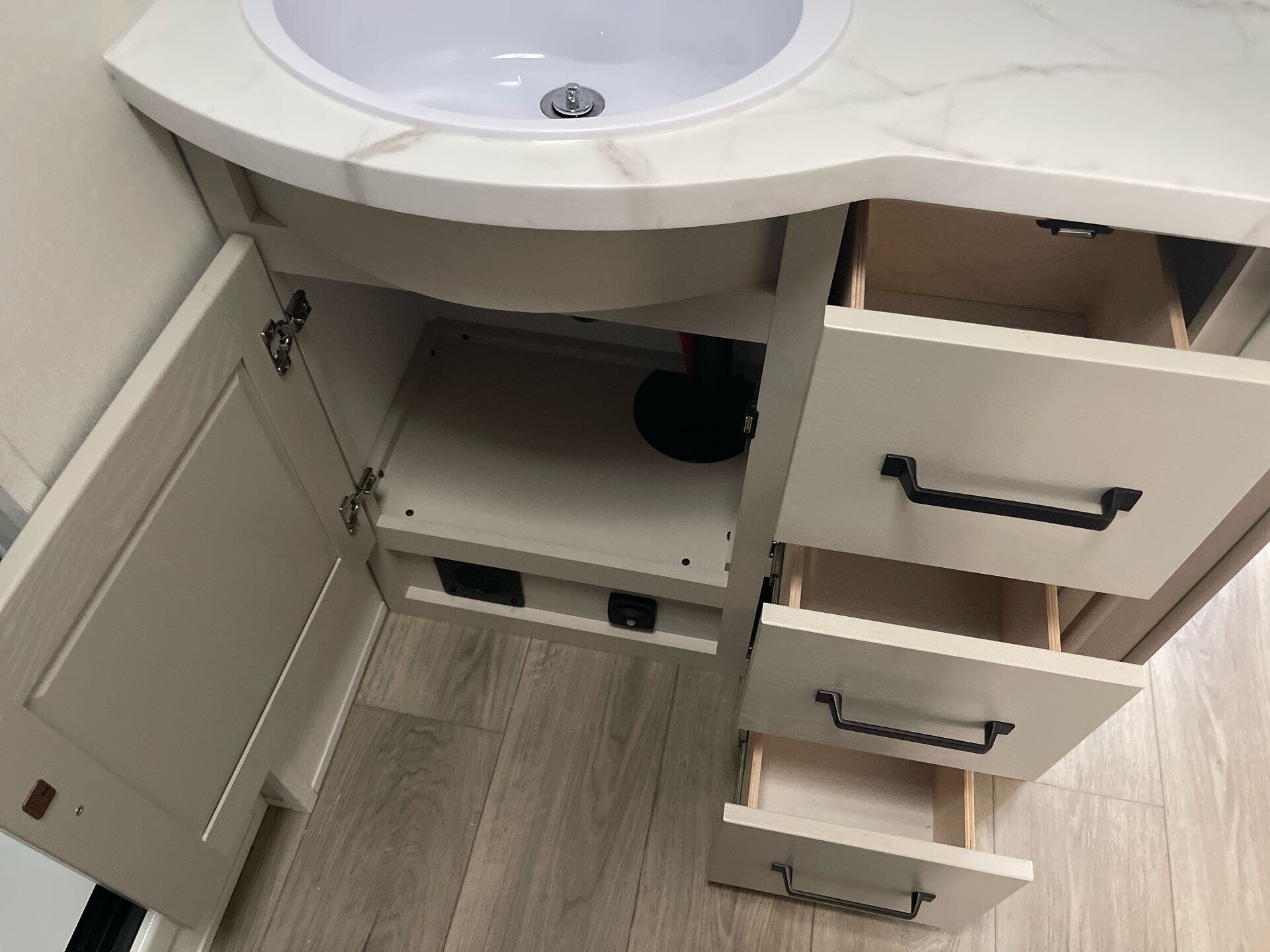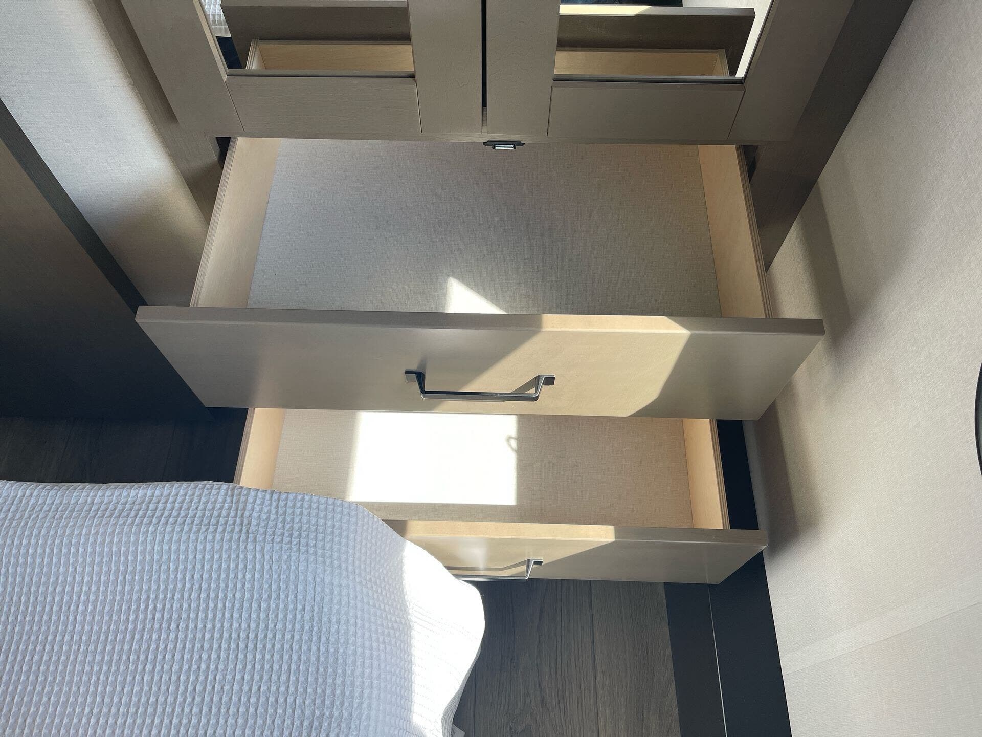 The kitchen is smart and functional, centered around an island layout with solid-surface counters, deep stainless sink, a 10 cu ft 12V refrigerator, and residential-style cabinetry. The open layout and large pass-through storage make this layout ideal for couples or small families who want portability without sacrificing liveability.