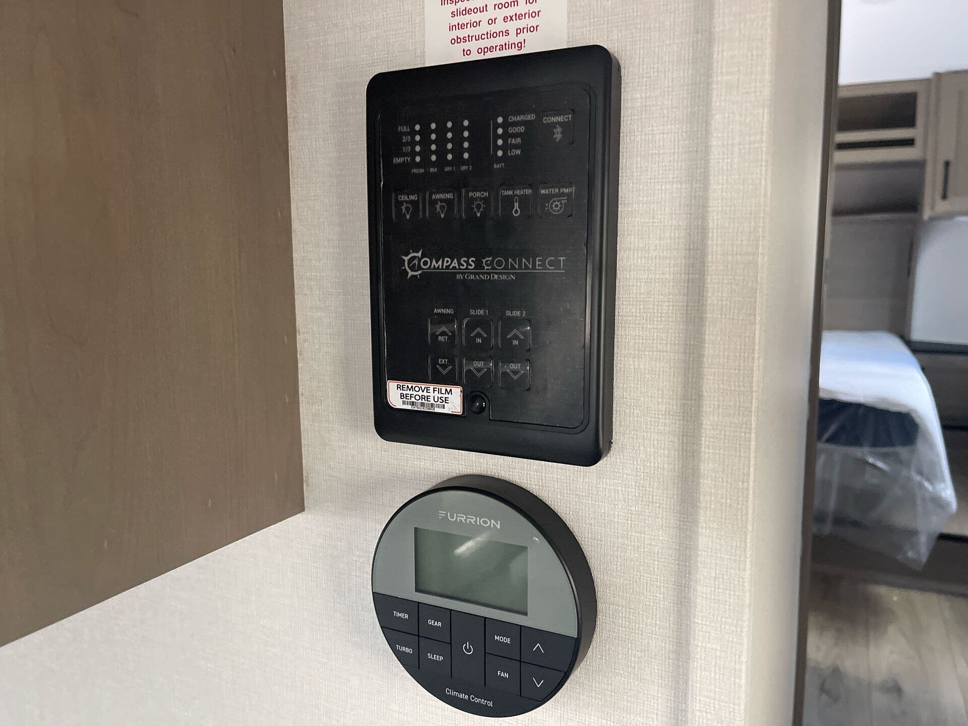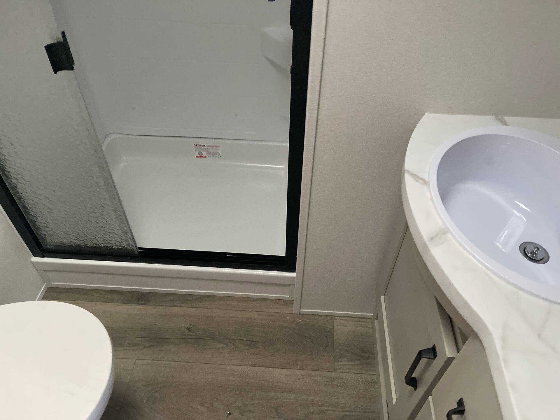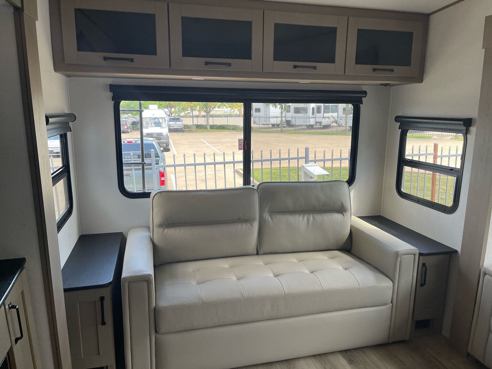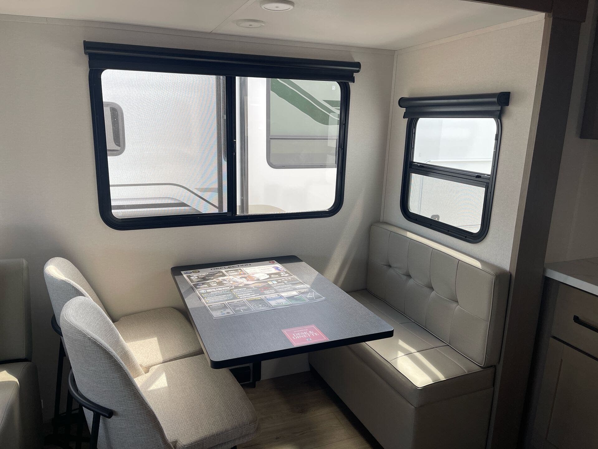 Sleeping arrangements are cozy and private thanks to a front queen bed slide, and the well-appointed full bathroom with a walk-in shower sits conveniently between the living and sleeping spaces.