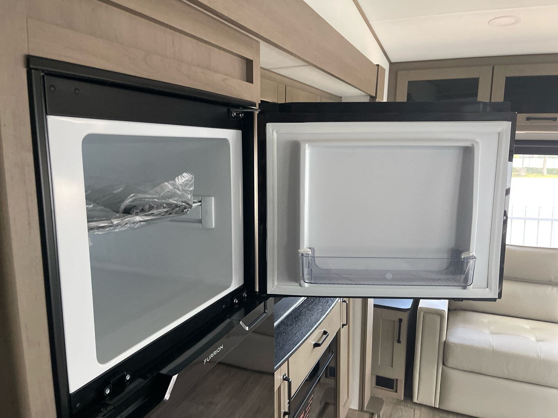 Step inside and you’re greeted by a spacious rear lounge featuring theater seating and a tri-fold sofa—perfect for unwinding after a long day, watching the 40″ high-definition TV, or gathering around a built-in fireplace.