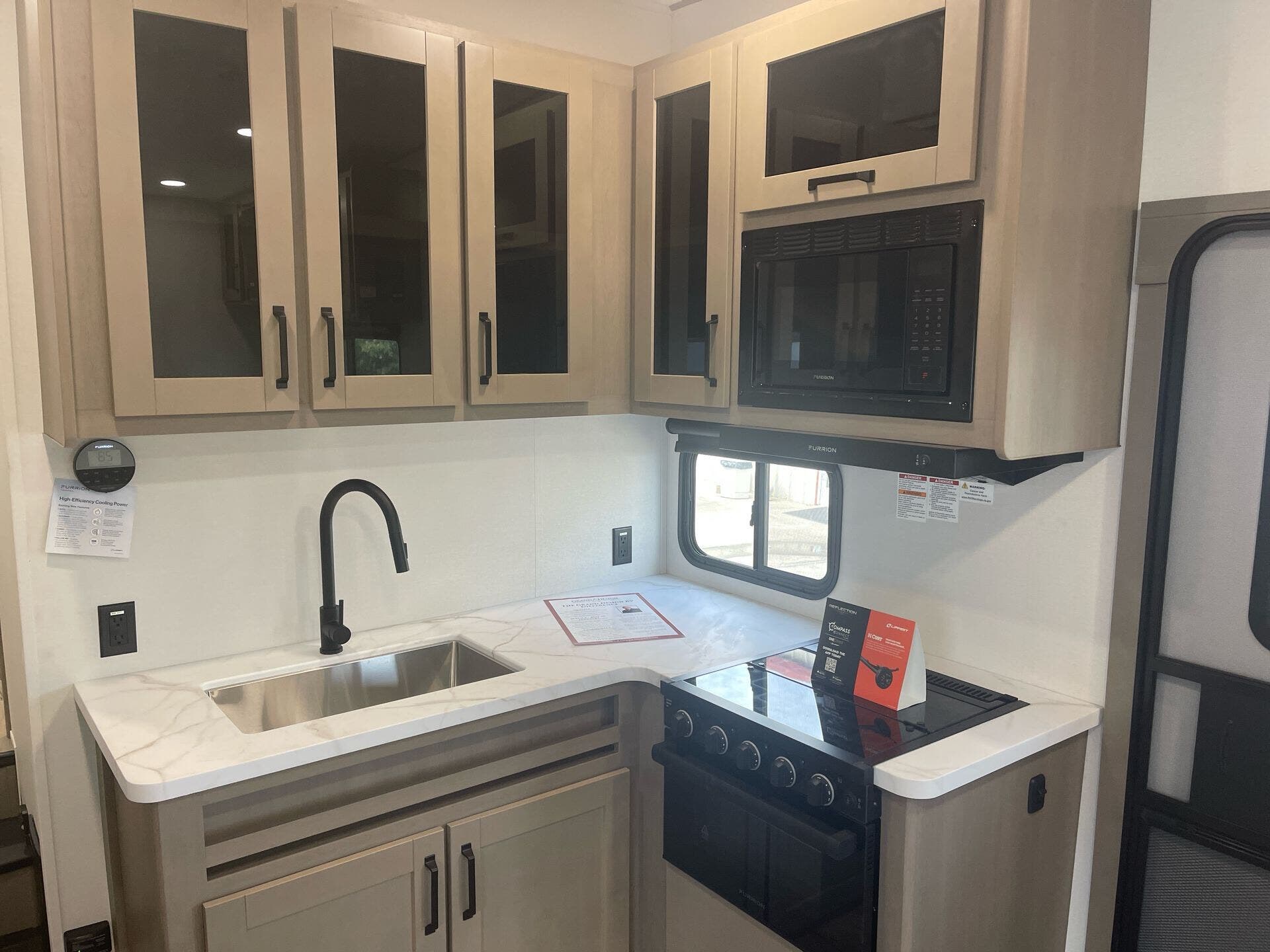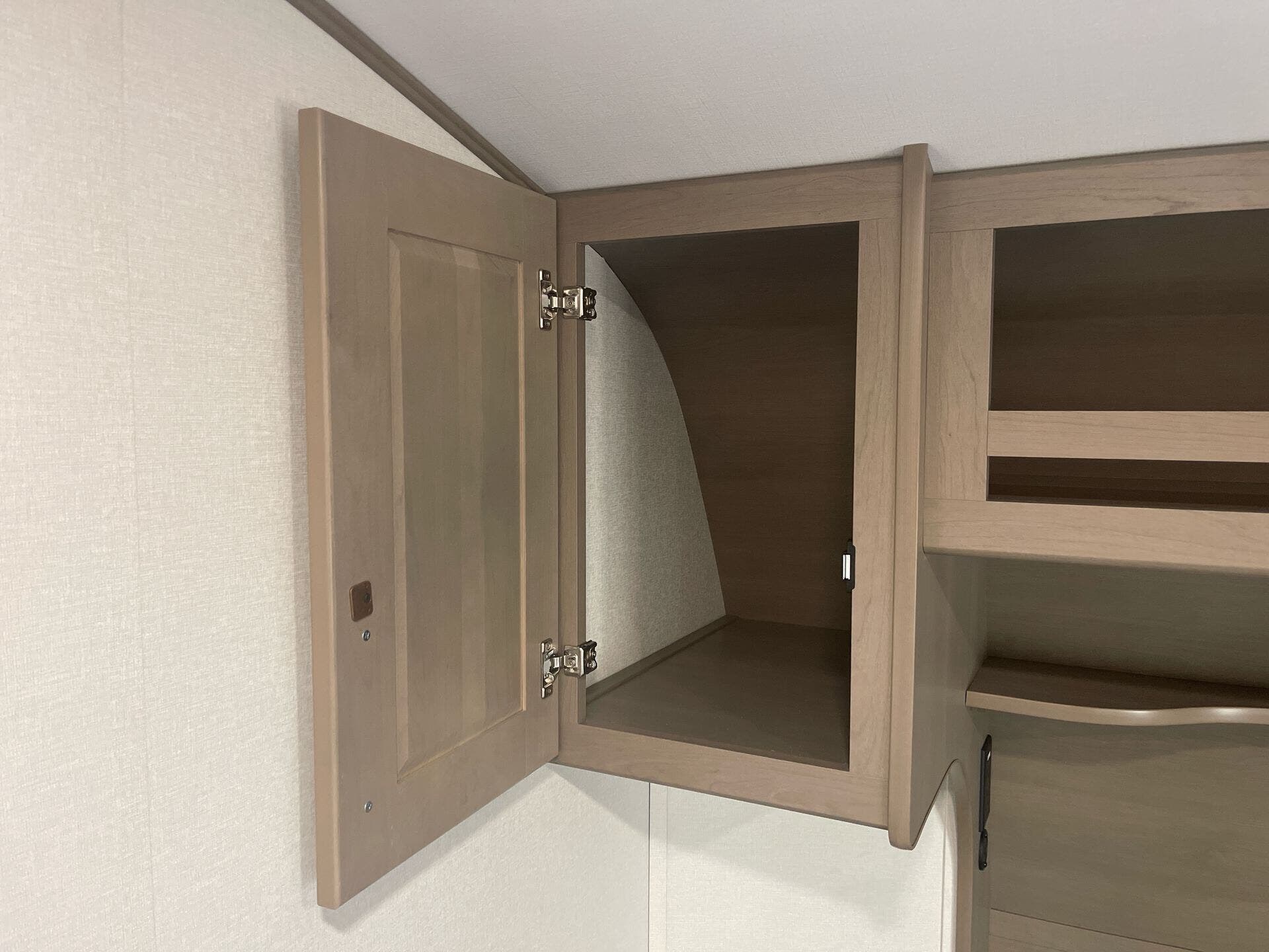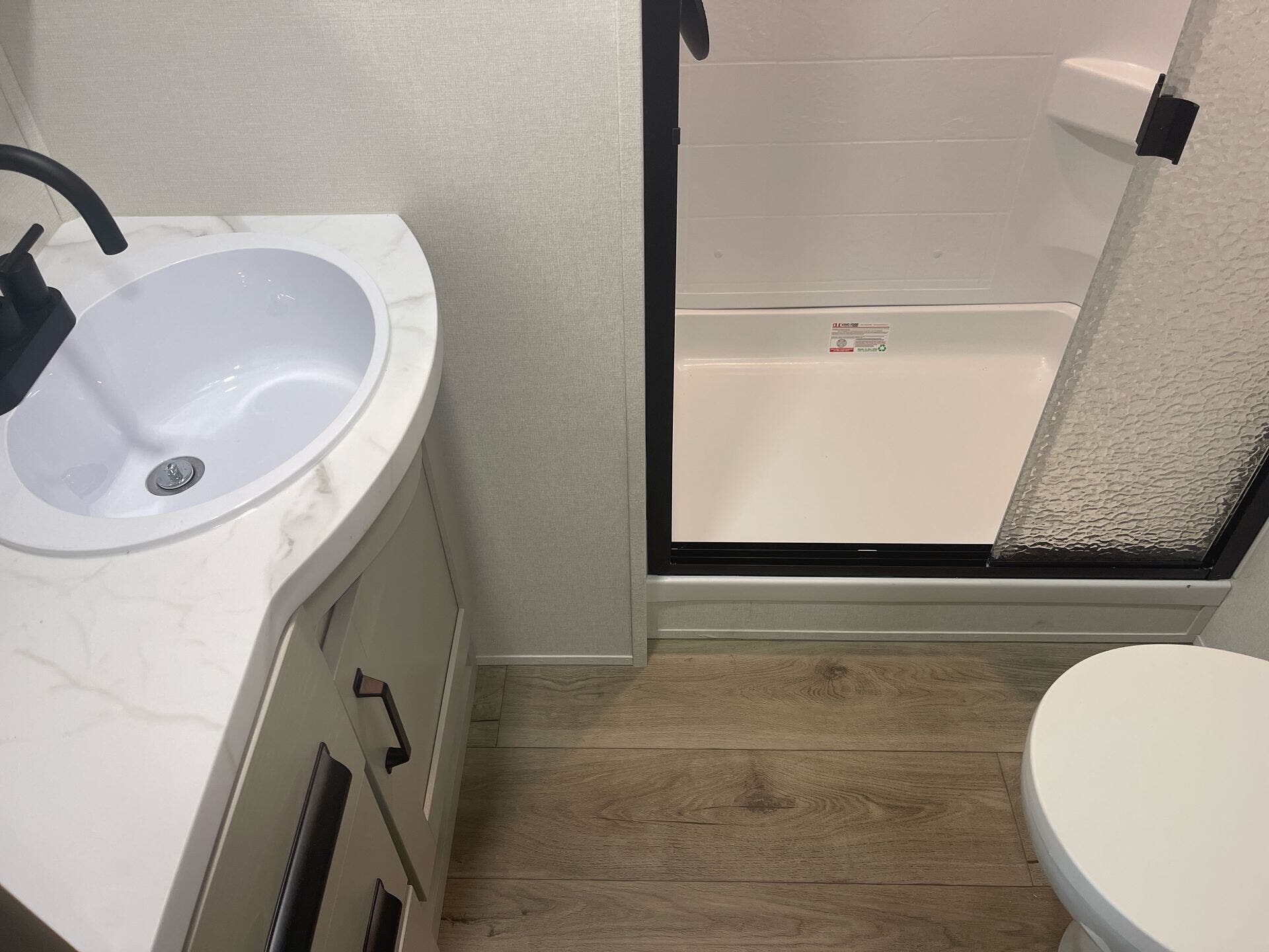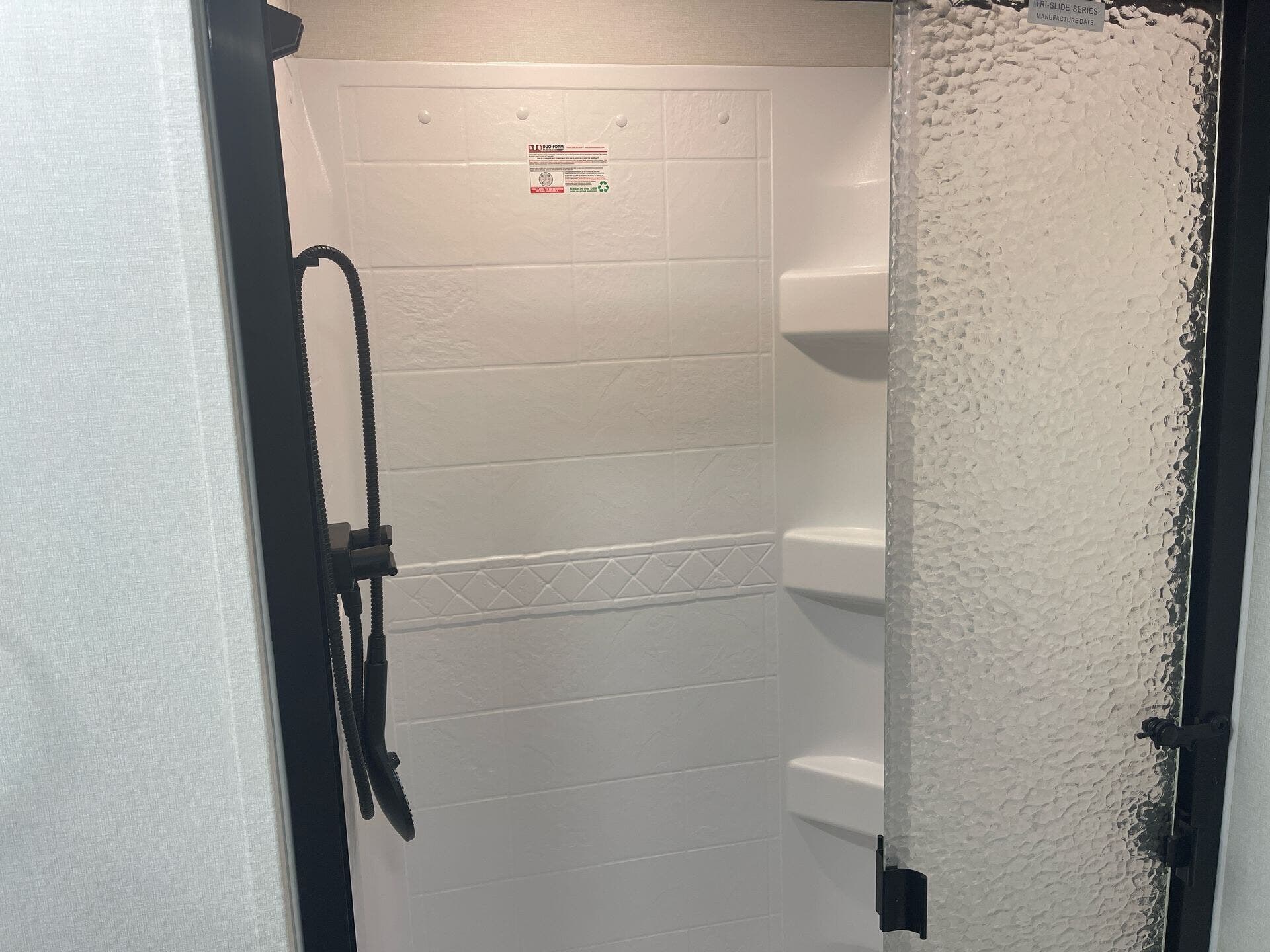 The mid-kitchen is well appointed: 10 cu ft 12V refrigerator, three-burner cooktop, decent pantry and countertop space. A walk-in shower (≈30″×36″) serves the full bath.