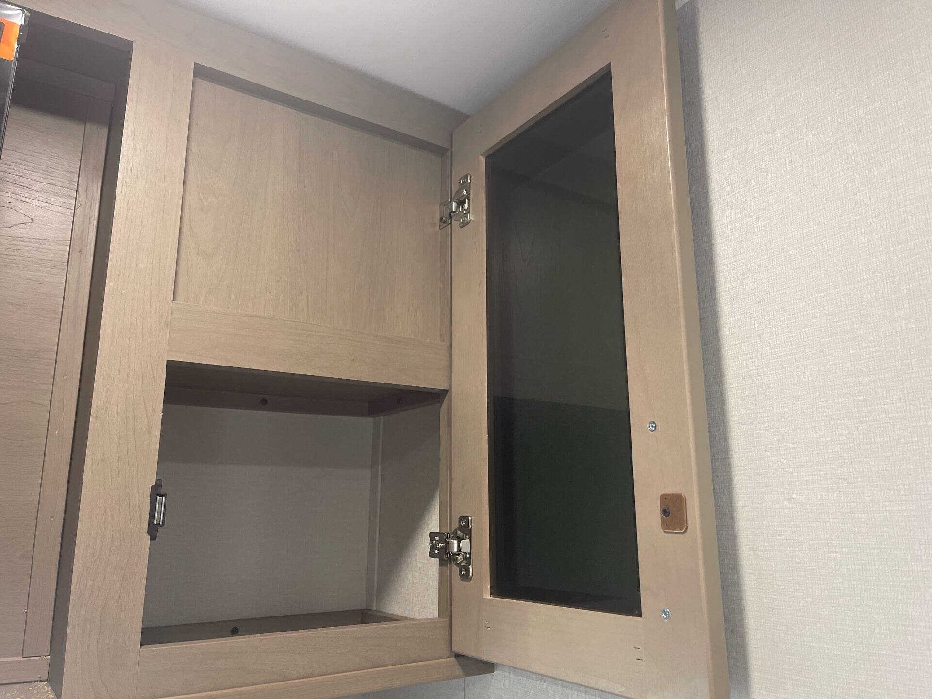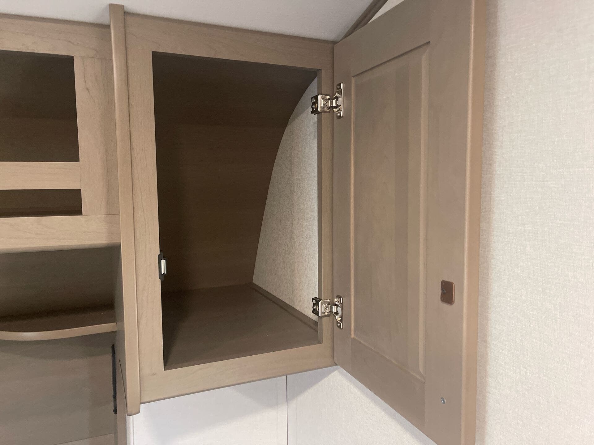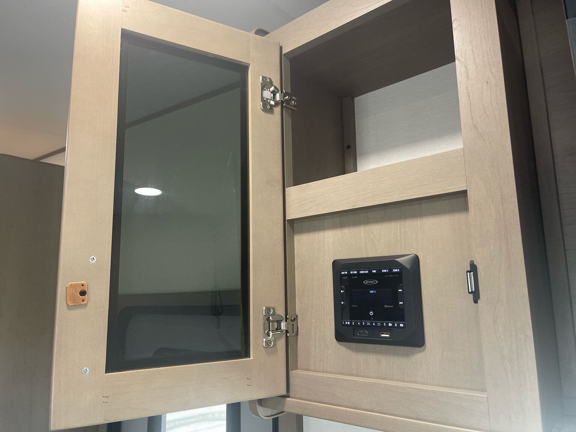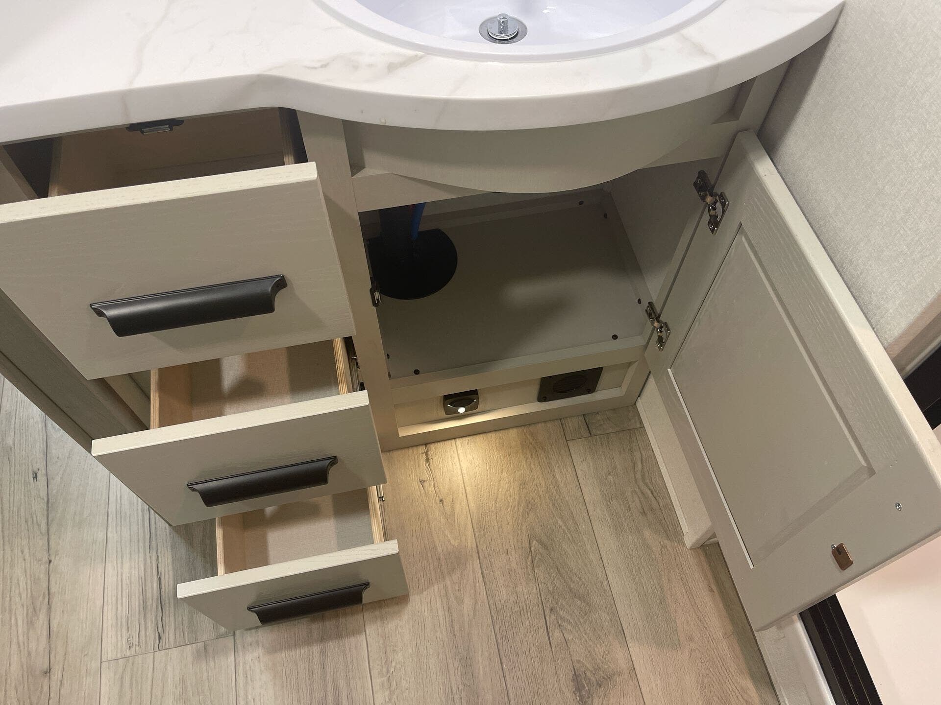 The mid-kitchen is well appointed: 10 cu ft 12V refrigerator, three-burner cooktop, decent pantry and countertop space. A walk-in shower (≈30″×36″) serves the full bath.
