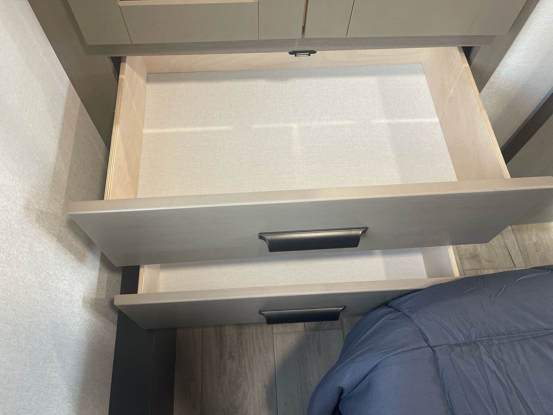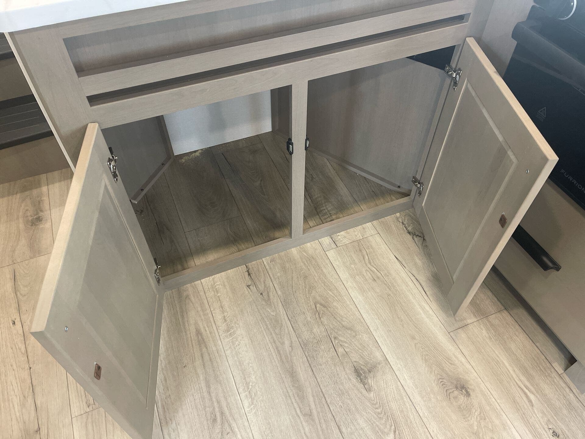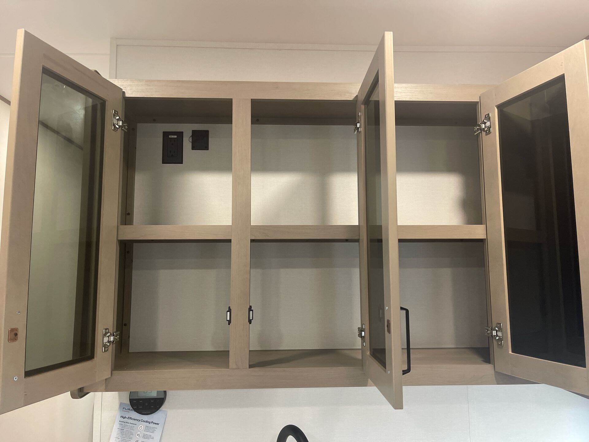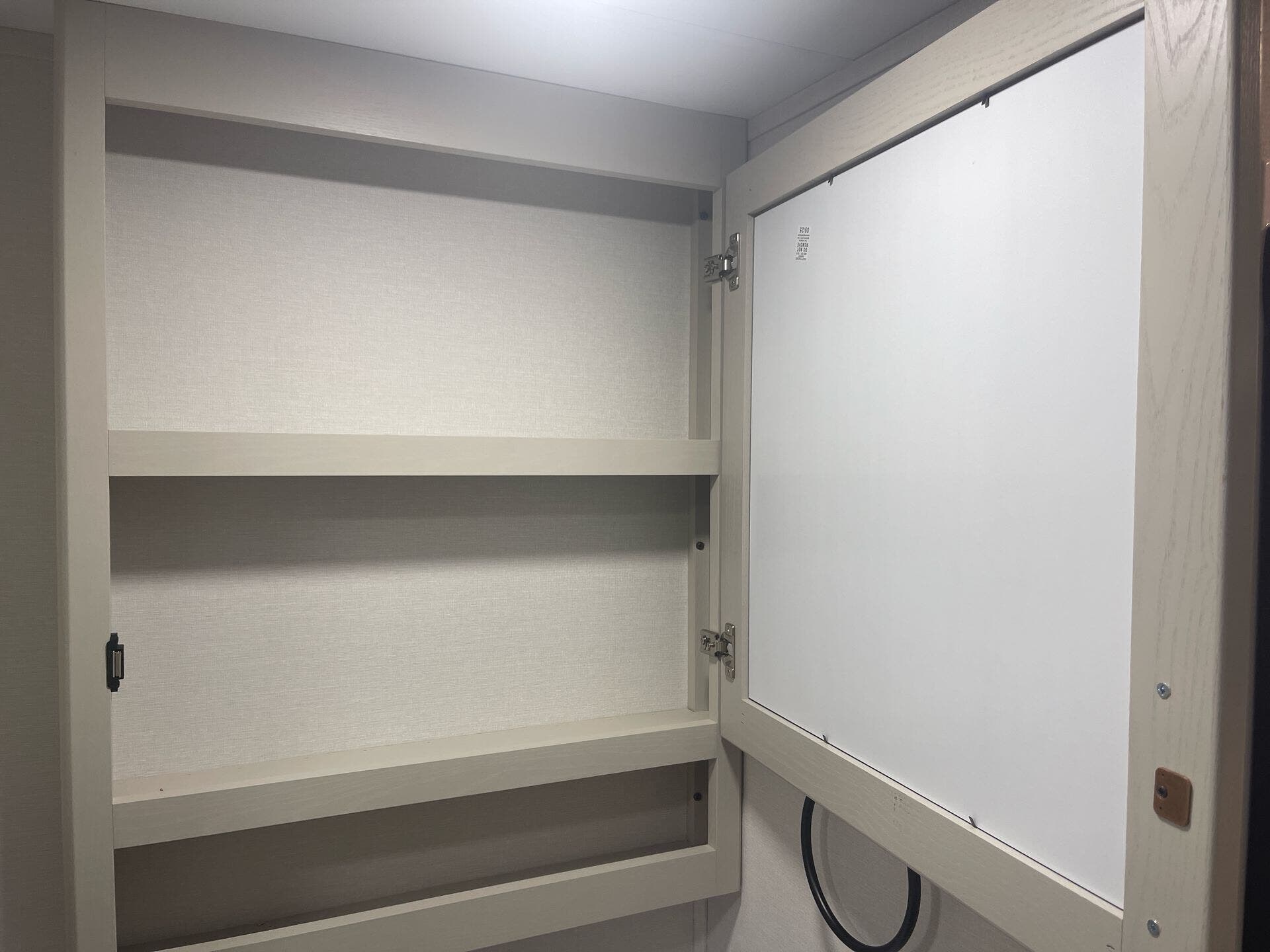 The mid-kitchen is well appointed: 10 cu ft 12V refrigerator, three-burner cooktop, decent pantry and countertop space. A walk-in shower (≈30″×36″) serves the full bath.