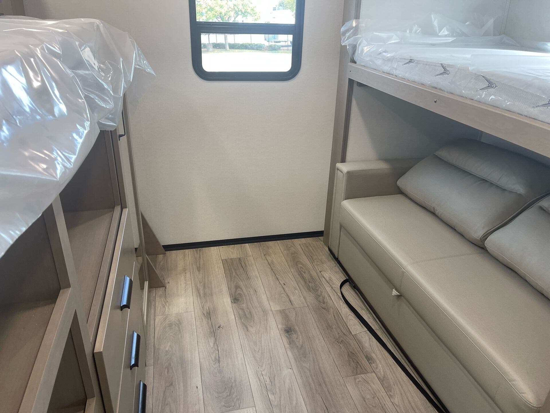 Sleeping capacity is up to 6-7, thanks to a front private queen bedroom and a rear bunkhouse (with two 44″×74″ bunks plus a sofa bed or trundle option) for kids or guests. The living area includes theatre seating and a booth dinette.