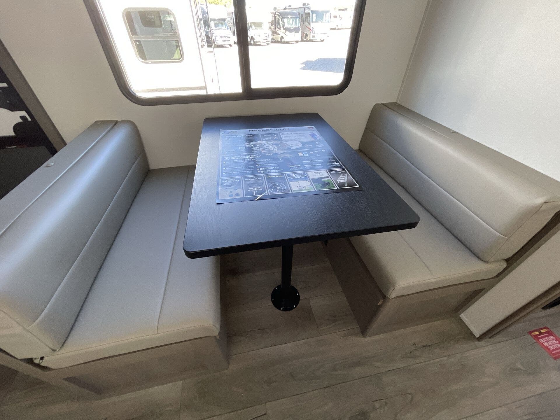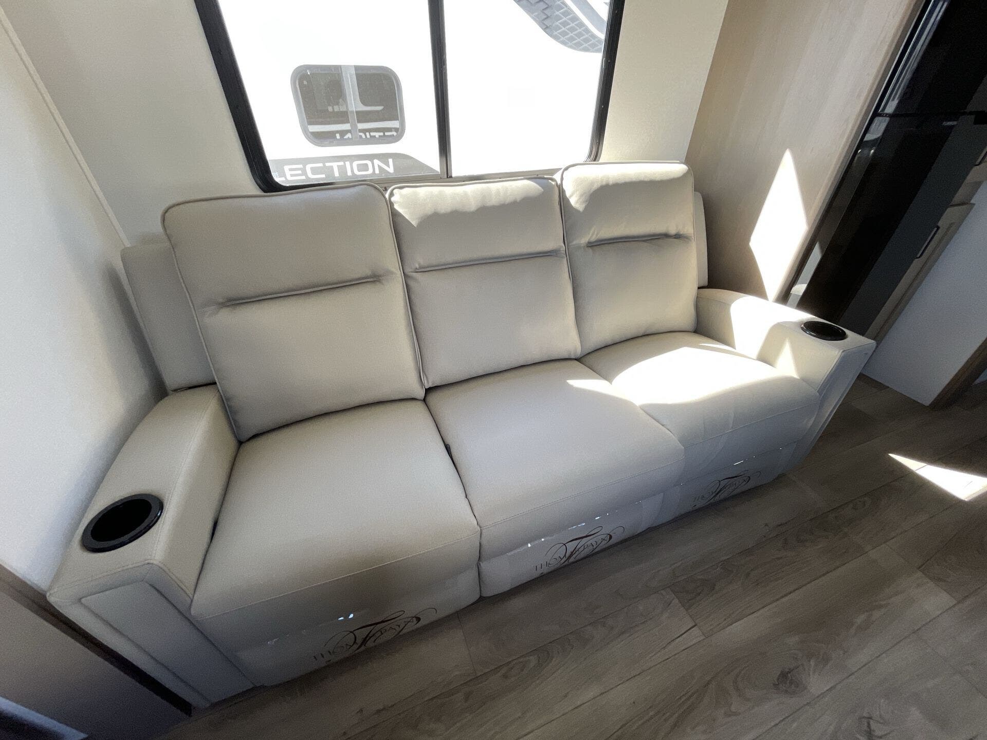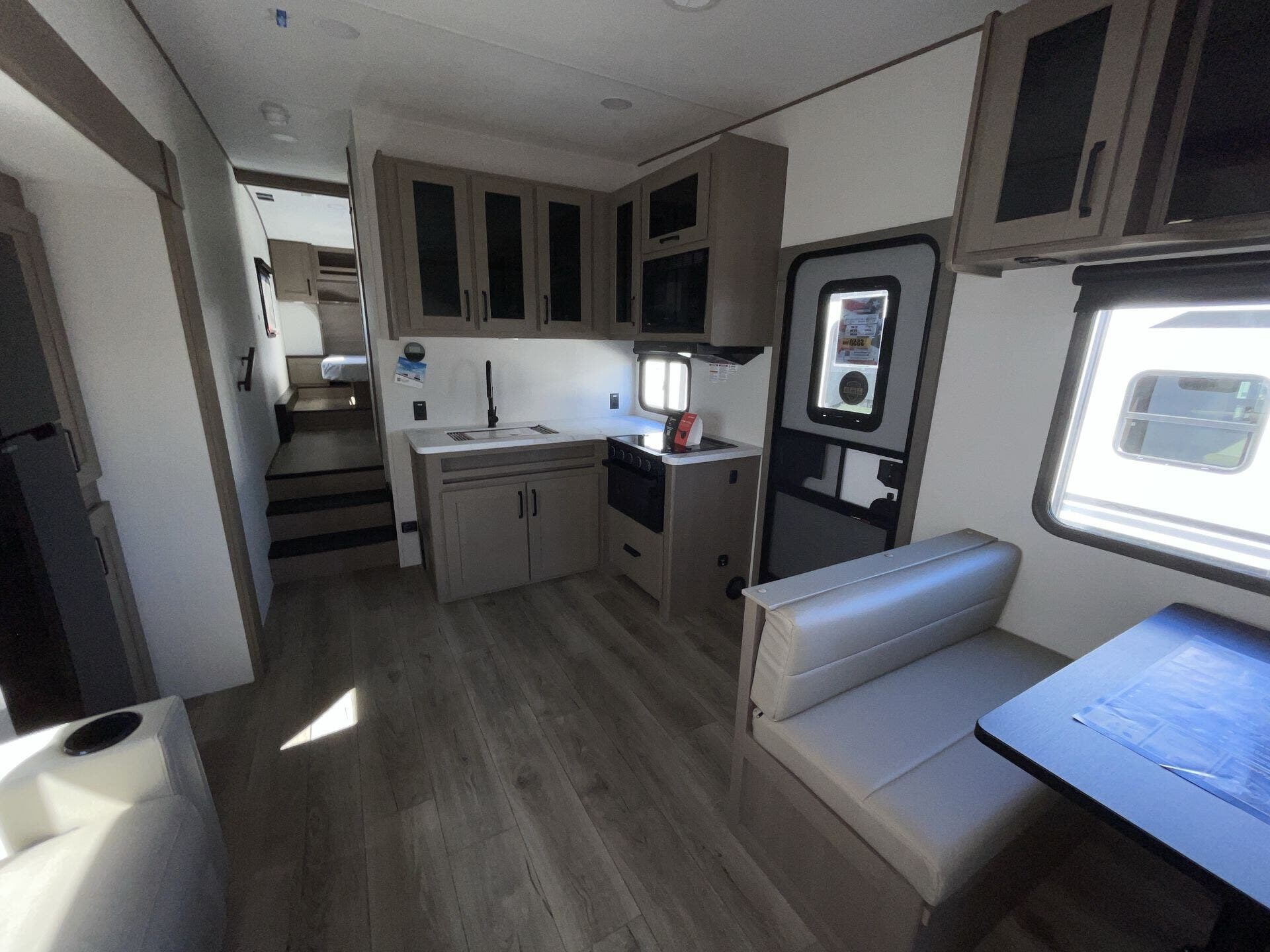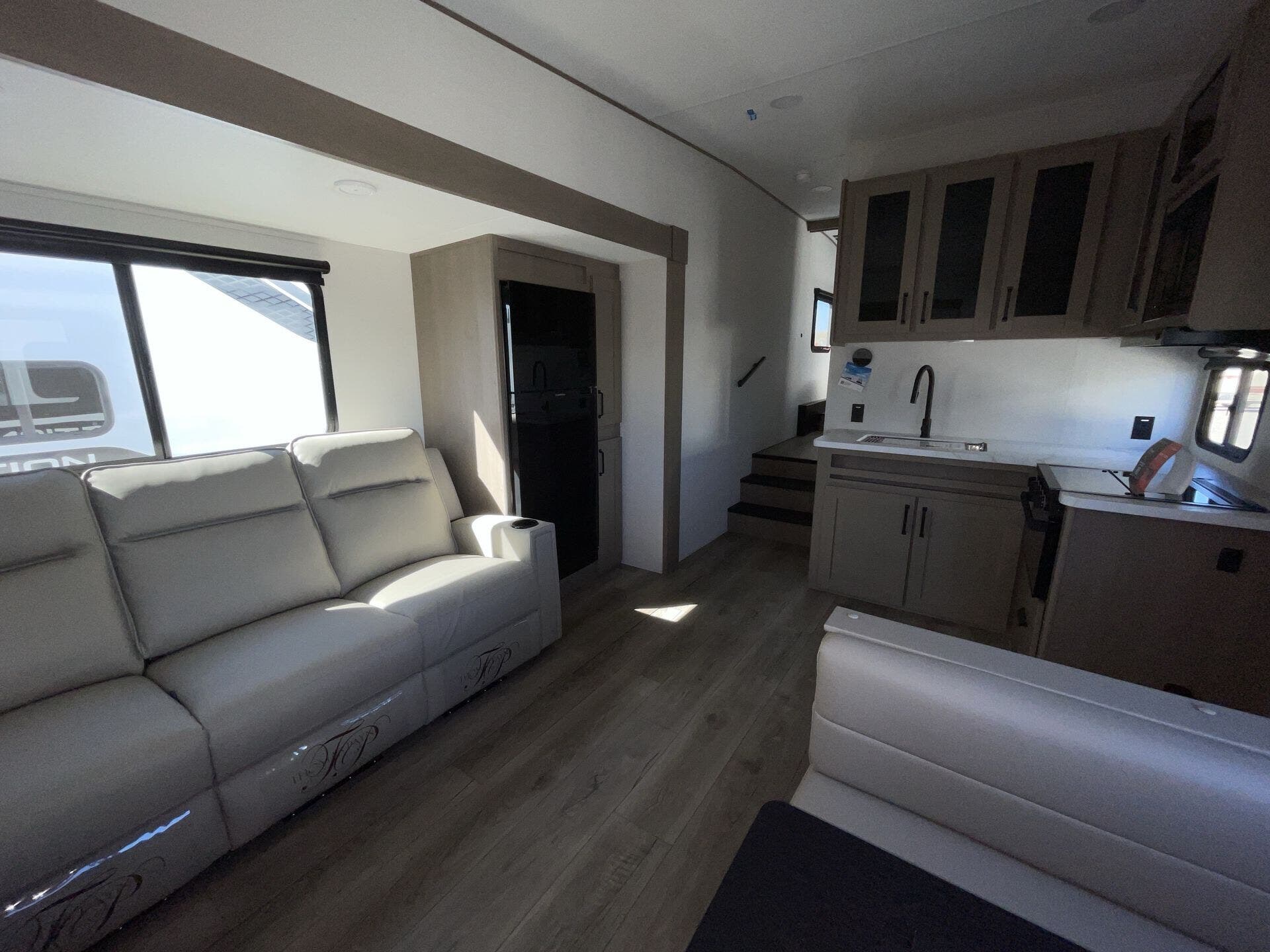 Inside, the 32BH offers an inviting layout that maximizes both living and sleeping space. The private rear bunkhouse provides multiple sleeping options for kids or guests, while the main living area includes theater seating, a tri-fold sofa, and a booth dinette for dining or relaxing. The gourmet kitchen features stainless steel appliances, solid-surface countertops, a large pantry, and plenty of storage for all your cooking essentials. Thoughtful touches like panoramic windows, LED lighting, and residential-style décor create a bright, modern atmosphere for every journey.