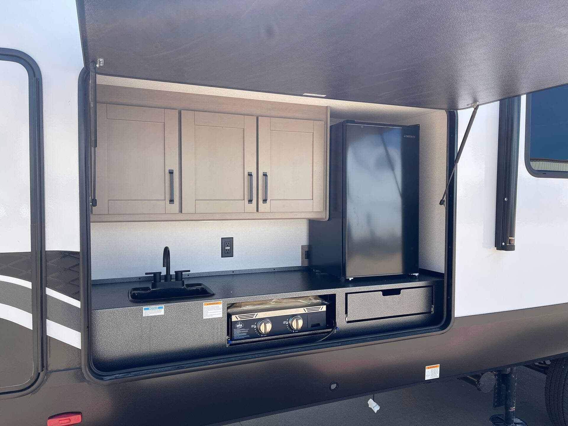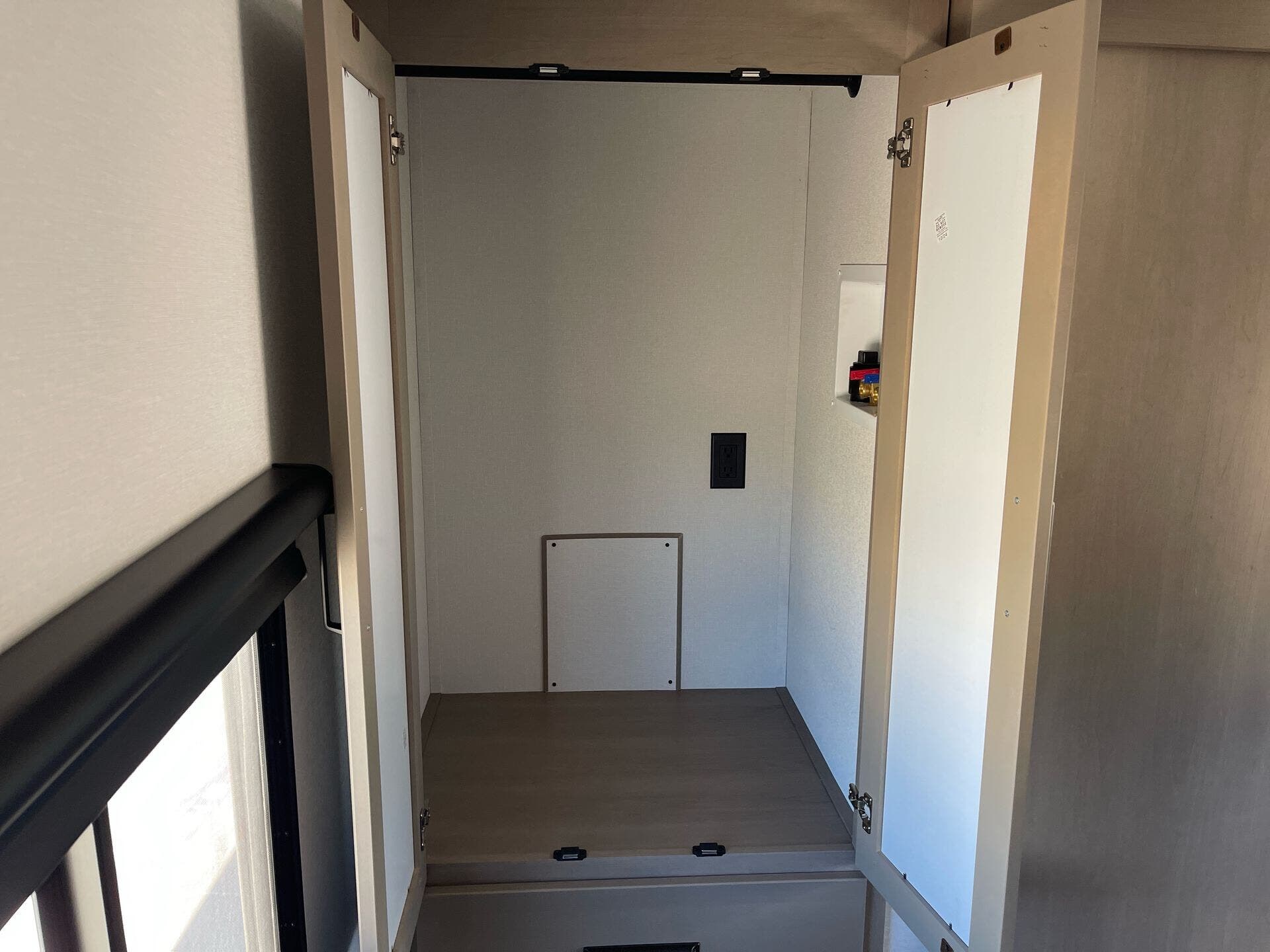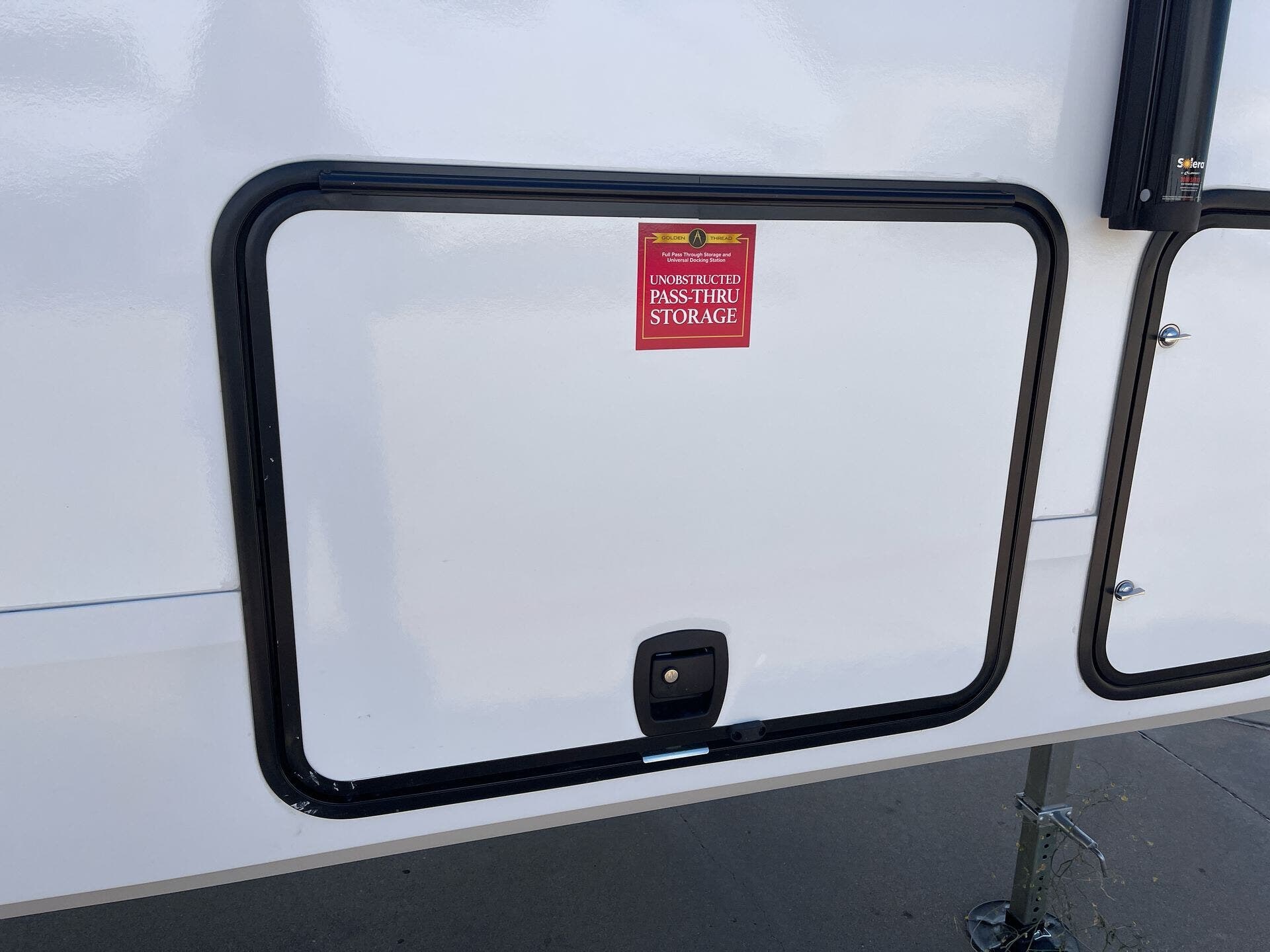 Storage and usability are handled with care. The unit includes pass-thru storage plus a convenient ladder for easy access to the roof deck. Built for convenience, it also offers durable, RV-ready features like hitch support and exterior practicality for travel days.