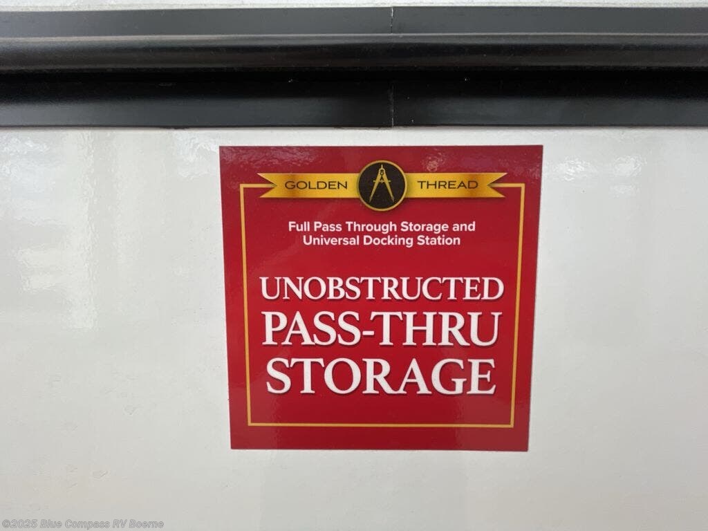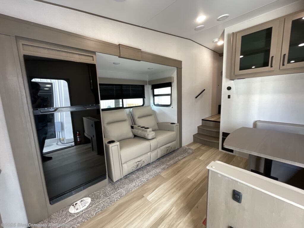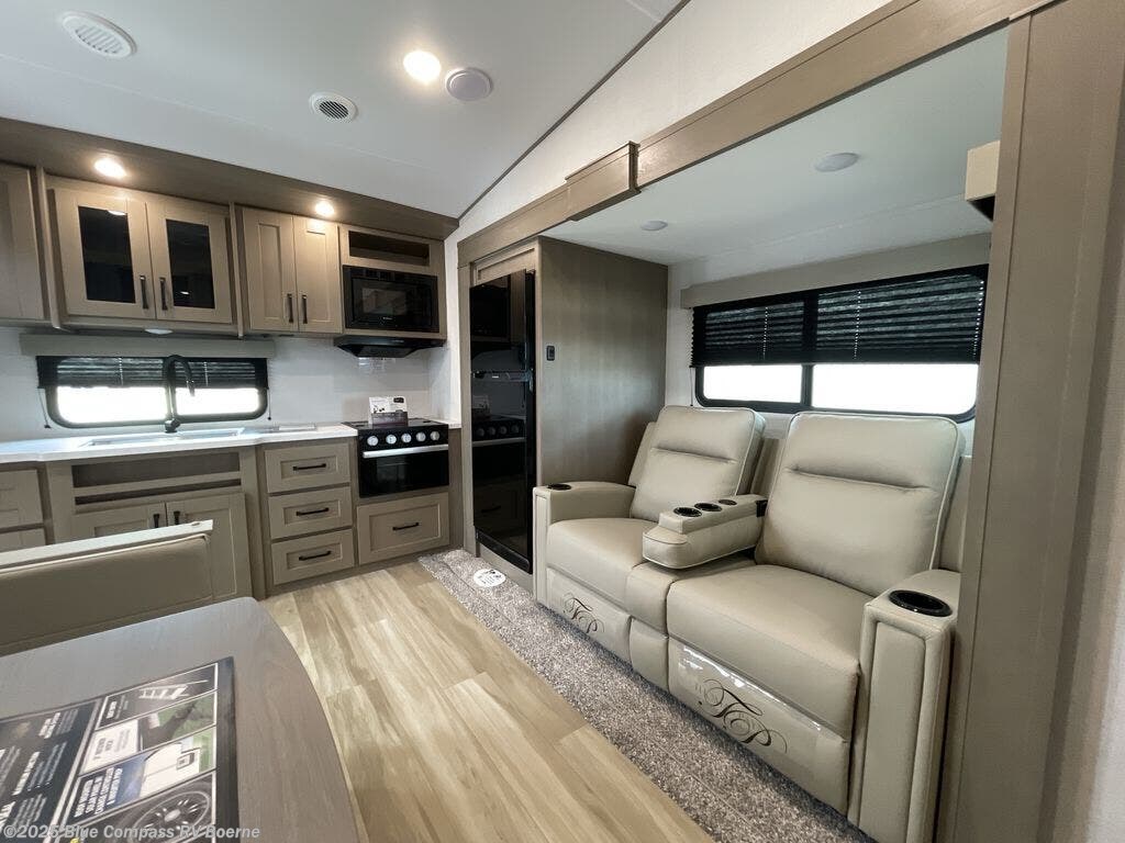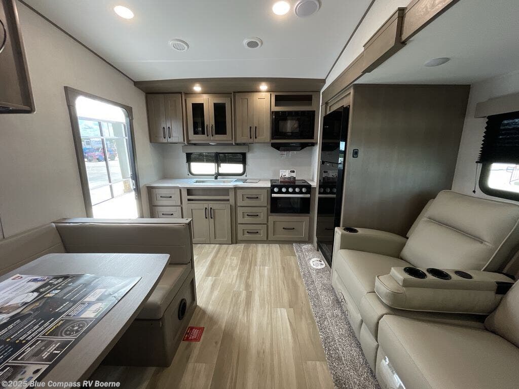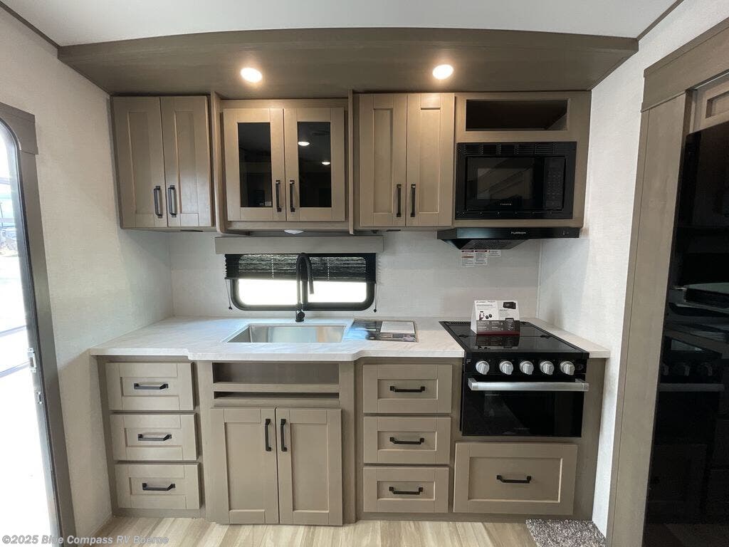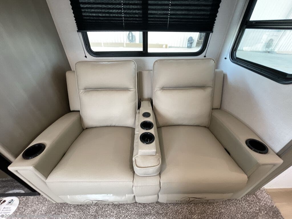 This rear kitchen fifth wheel is sure to meet all of your camping needs! Since the exterior length is only 26' 11", you can easily maneuver in and out of campgrounds. The rear kitchen includes ample counter space to prep meals, a three burner cooktop, and overhead storage for all your necessities. There is a 10 cu. ft. 12V refrigerator within the slide out that also includes the theater seating, and the U-shaped dinette provides a place to dine or play a card game. You will appreciate having convenient storage by the entry door, along with pull-out pet bowls, a functional wardrobe closet in the bedroom and an exterior pass-thru for belongings and camping gear. When you're ready to turn in for the night, the queen bed is sure to bring a great night's rest, while your guests sleep on the booth dinette or optional tri-fold sofa if you replace the theater seating!