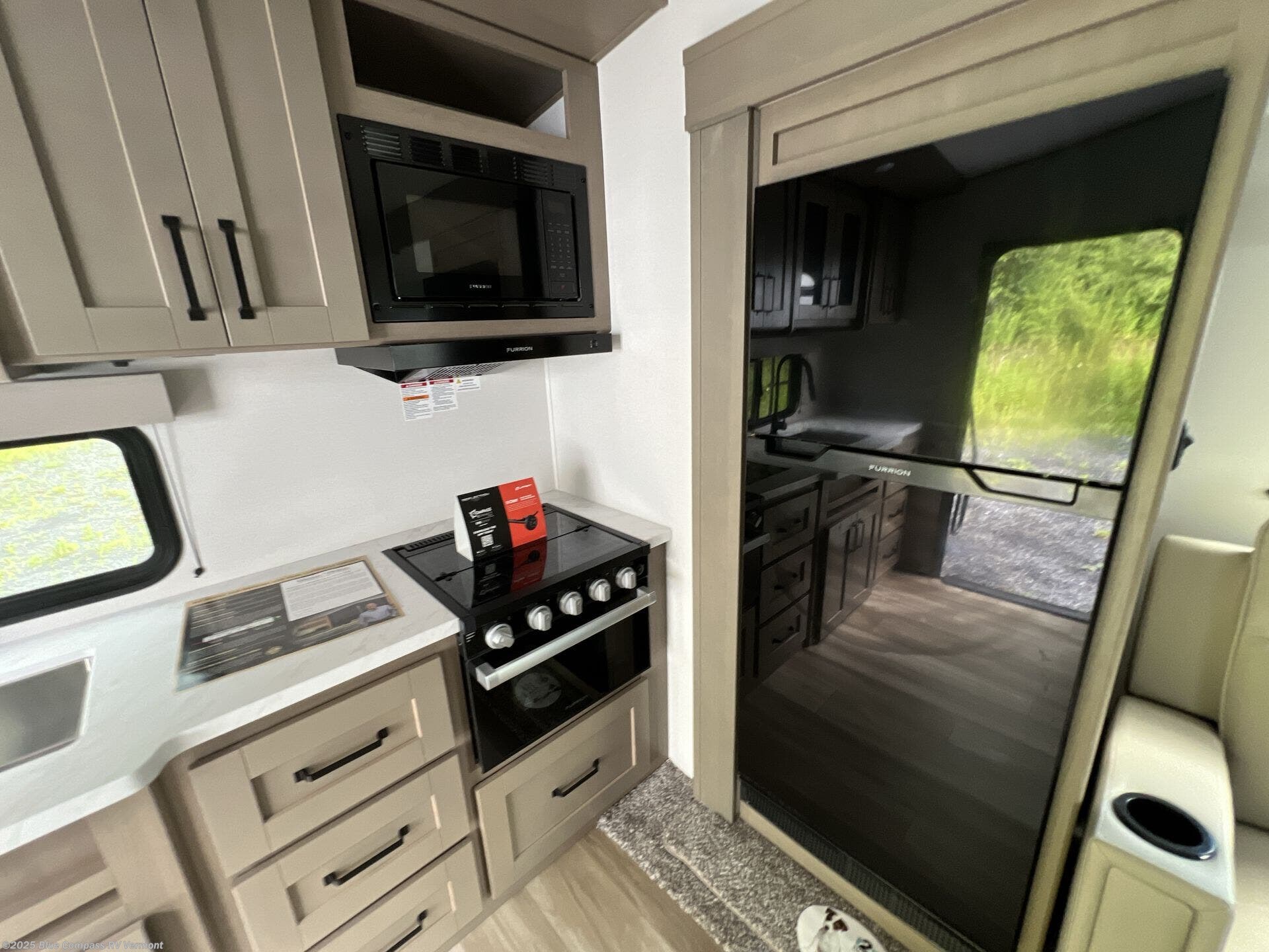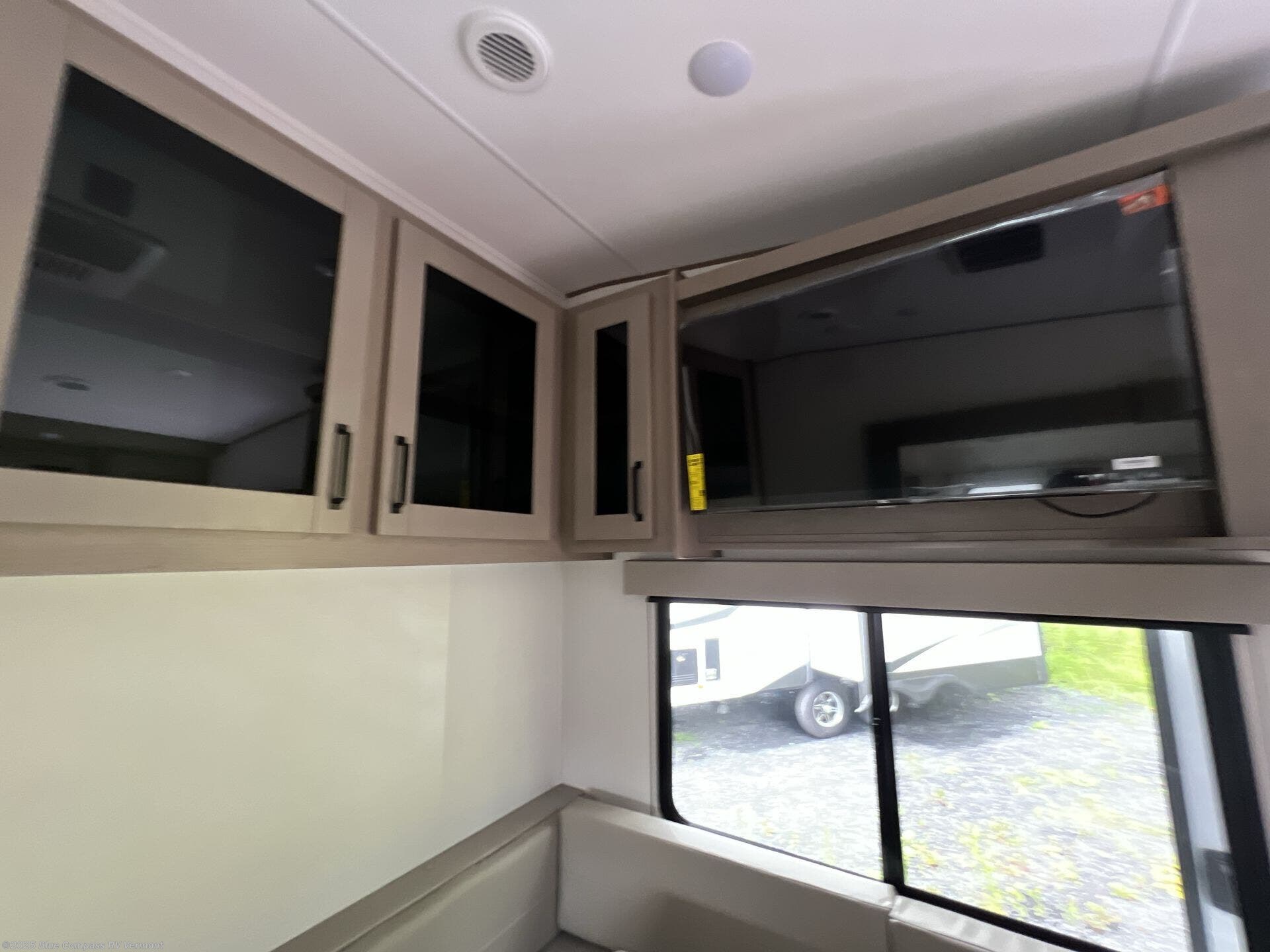 This rear kitchen fifth wheel is sure to meet all of your camping needs! Since the exterior length is only 26' 11", you can easily maneuver in and out of campgrounds. The rear kitchen includes ample counter space to prep meals, a three burner cooktop, and overhead storage for all your necessities. There is a 10 cu. ft. 12V refrigerator within the slide out that also includes the theater seating, and the U-shaped dinette provides a place to dine or play a card game. You will appreciate having convenient storage by the entry door, along with pull-out pet bowls, a functional wardrobe closet in the bedroom and an exterior pass-thru for belongings and camping gear. When you're ready to turn in for the night, the queen bed is sure to bring a great night's rest, while your guests sleep on the booth dinette or optional tri-fold sofa if you replace the theater seating!