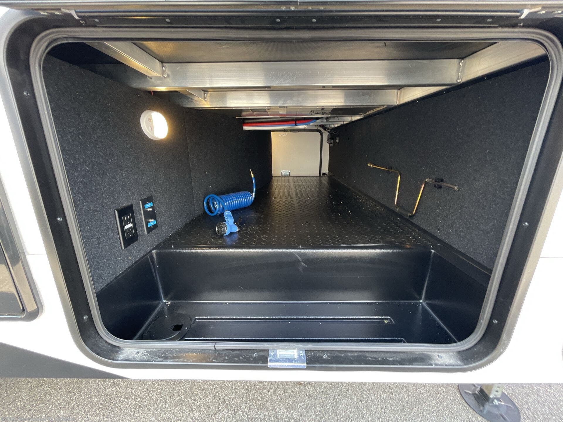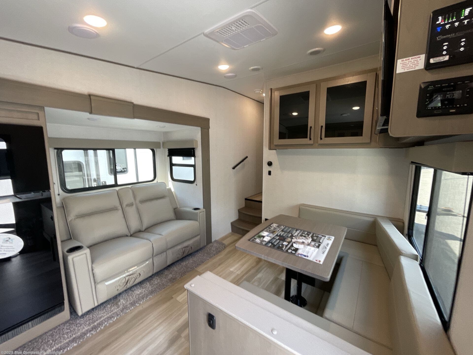 This rear kitchen fifth wheel is sure to meet all of your camping needs! Since the exterior length is only 26' 11", you can easily maneuver in and out of campgrounds. The rear kitchen includes ample counter space to prep meals, a three burner cooktop, and overhead storage for all your necessities. There is a 10 cu. ft. 12V refrigerator within the slide out that also includes the theater seating, and the U-shaped dinette provides a place to dine or play a card game. You will appreciate having convenient storage by the entry door, along with pull-out pet bowls, a functional wardrobe closet in the bedroom and an exterior pass-thru for belongings and camping gear. When you're ready to turn in for the night, the queen bed is sure to bring a great night's rest, while your guests sleep on the booth dinette or optional tri-fold sofa if you replace the theater seating!