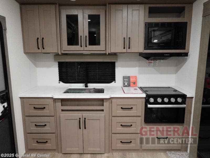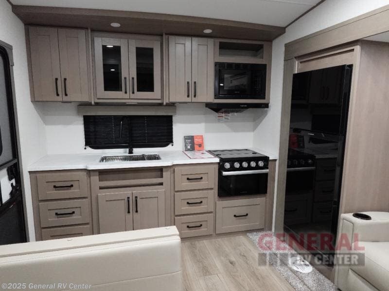 This rear kitchen fifth wheel is sure to meet all of your camping needs! Since the exterior length is only 26' 11", you can easily maneuver in and out of campgrounds. The rear kitchen includes ample counter space to prep meals, a three burner cooktop, and overhead storage for all your necessities. There is a 10 cu. ft. 12V refrigerator within the slide out that also includes the theater seating, and the U-shaped dinette provides a place to dine or play a card game. You will appreciate having convenient storage by the entry door, along with pull-out pet bowls, a functional wardrobe closet in the bedroom and an exterior pass-thru for belongings and camping gear. When you're ready to turn in for the night, the queen bed is sure to bring a great night's rest, while your guests sleep on the booth dinette!