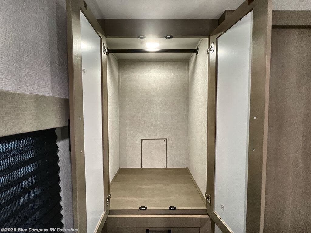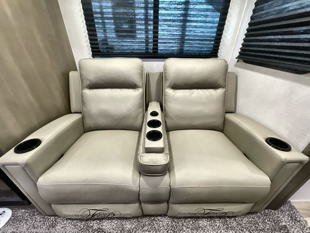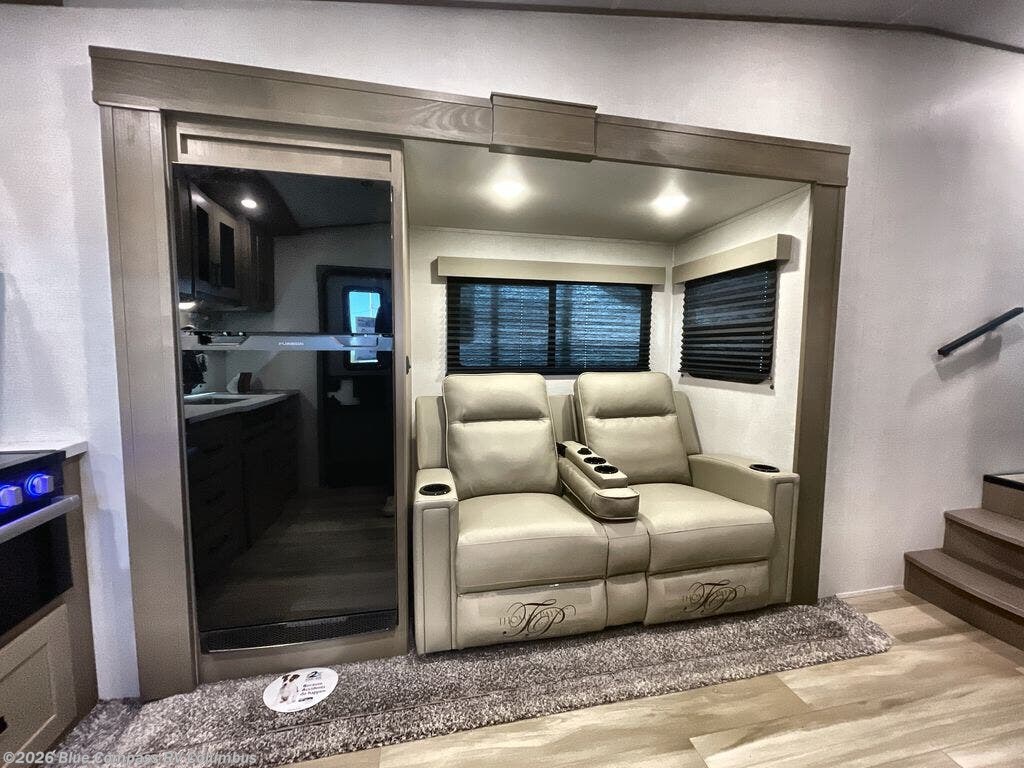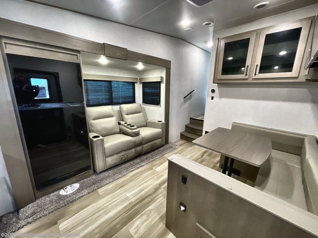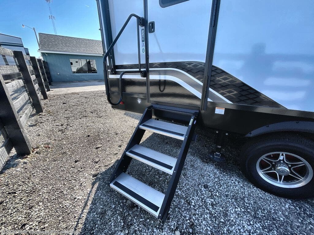 This rear kitchen fifth wheel is sure to meet all of your camping needs! Since the exterior length is only 26' 11", you can easily maneuver in and out of campgrounds. The rear kitchen includes ample counter space to prep meals, a three burner cooktop, and overhead storage for all your necessities. There is a 10 cu. ft. 12V refrigerator within the slide out that also includes the theater seating, and the U-shaped dinette provides a place to dine or play a card game. You will appreciate having convenient storage by the entry door, along with pull-out pet bowls, a functional wardrobe closet in the bedroom and an exterior pass-thru for belongings and camping gear. When you're ready to turn in for the night, the queen bed is sure to bring a great night's rest, while your guests sleep on the booth dinette or optional tri-fold sofa if you replace the theater seating!