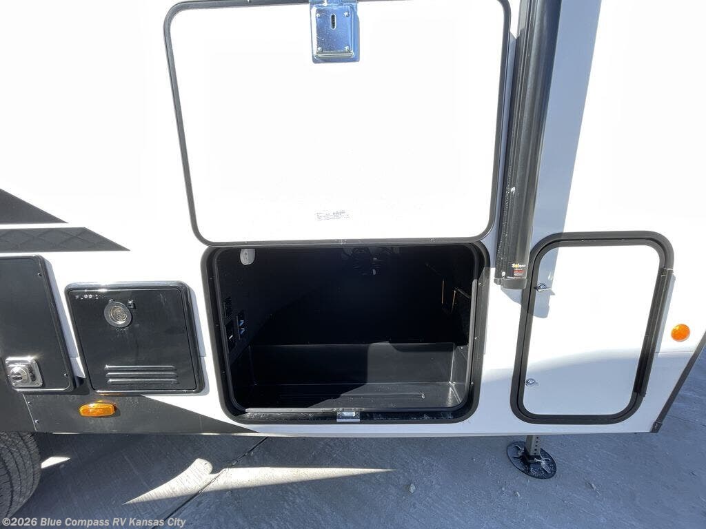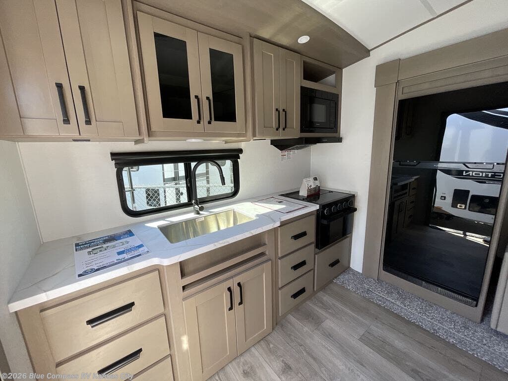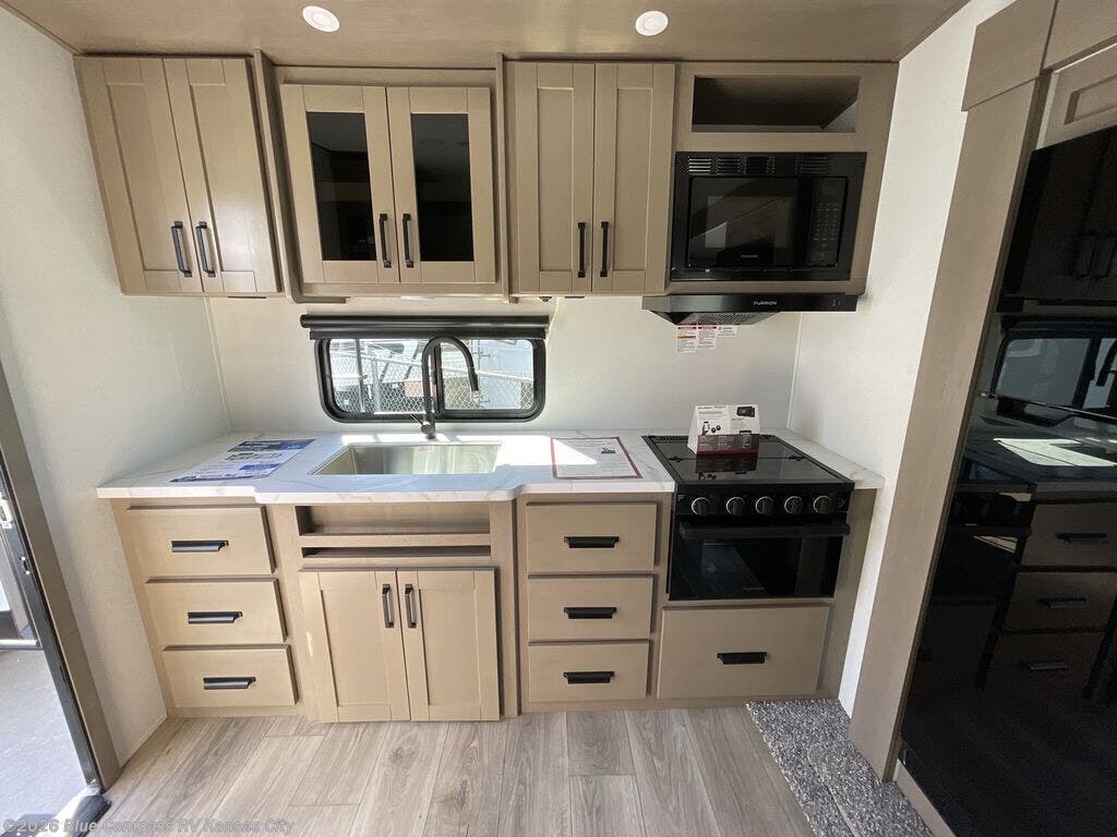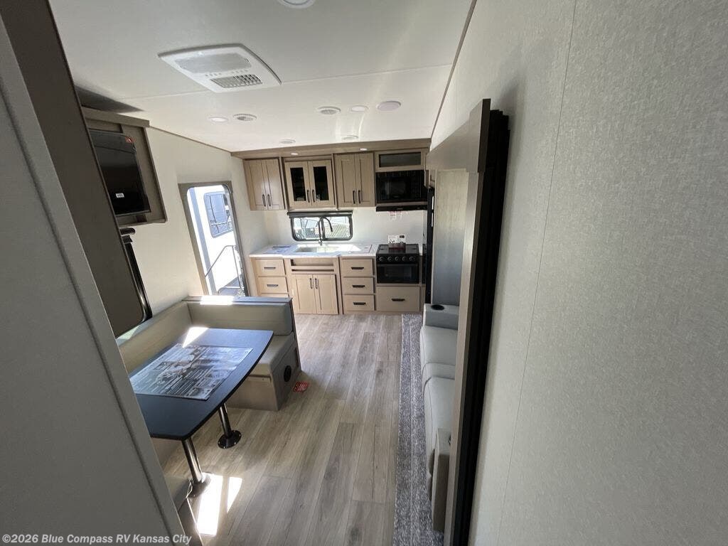This rear kitchen fifth wheel is sure to meet all of your camping needs! Since the exterior length is only 26' 11", you can easily maneuver in and out of campgrounds. The rear kitchen includes ample counter space to prep meals, a three burner cooktop, and overhead storage for all your necessities. There is a 10 cu. ft. 12V refrigerator within the slide out that also includes the theater seating, and the U-shaped dinette provides a place to dine or play a card game. You will appreciate having convenient storage by the entry door, along with pull-out pet bowls, a functional wardrobe closet in the bedroom and an exterior pass-thru for belongings and camping gear. When you're ready to turn in for the night, the queen bed is sure to bring a great night's rest, while your guests sleep on the booth dinette or optional tri-fold sofa if you replace the theater seating!