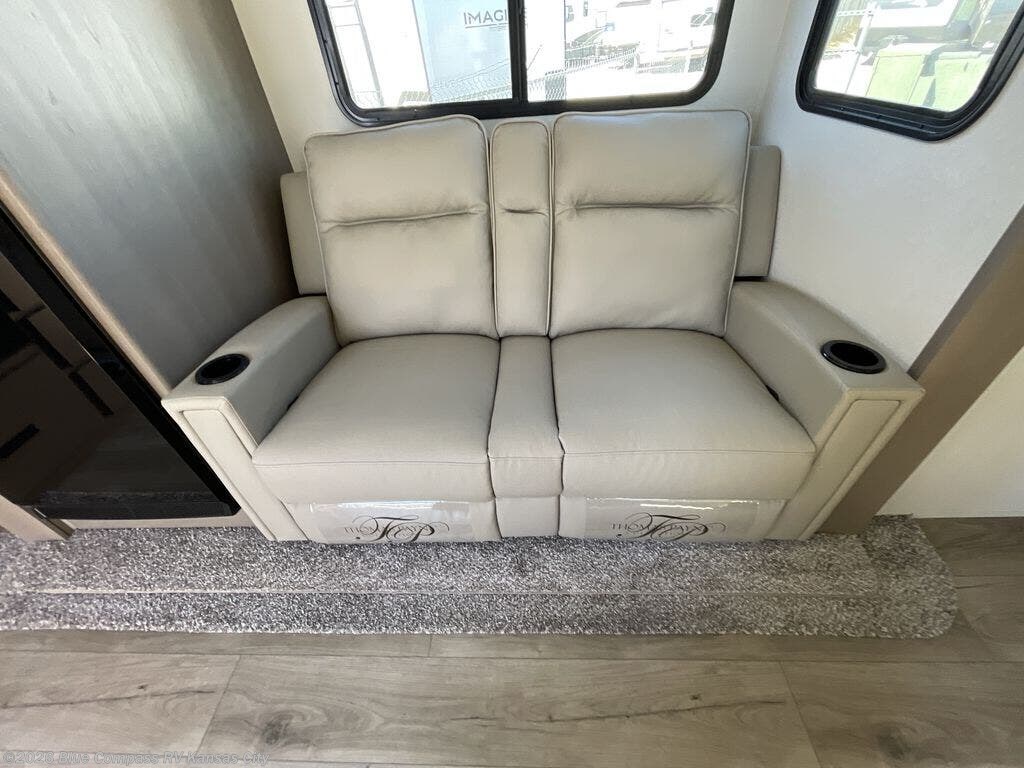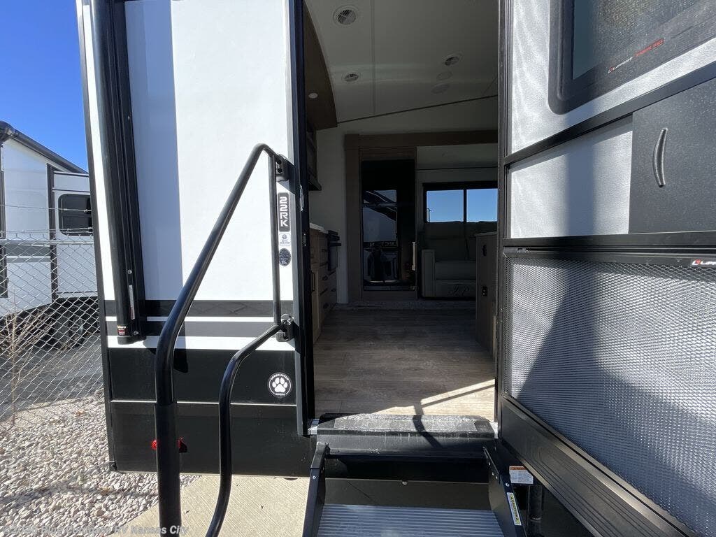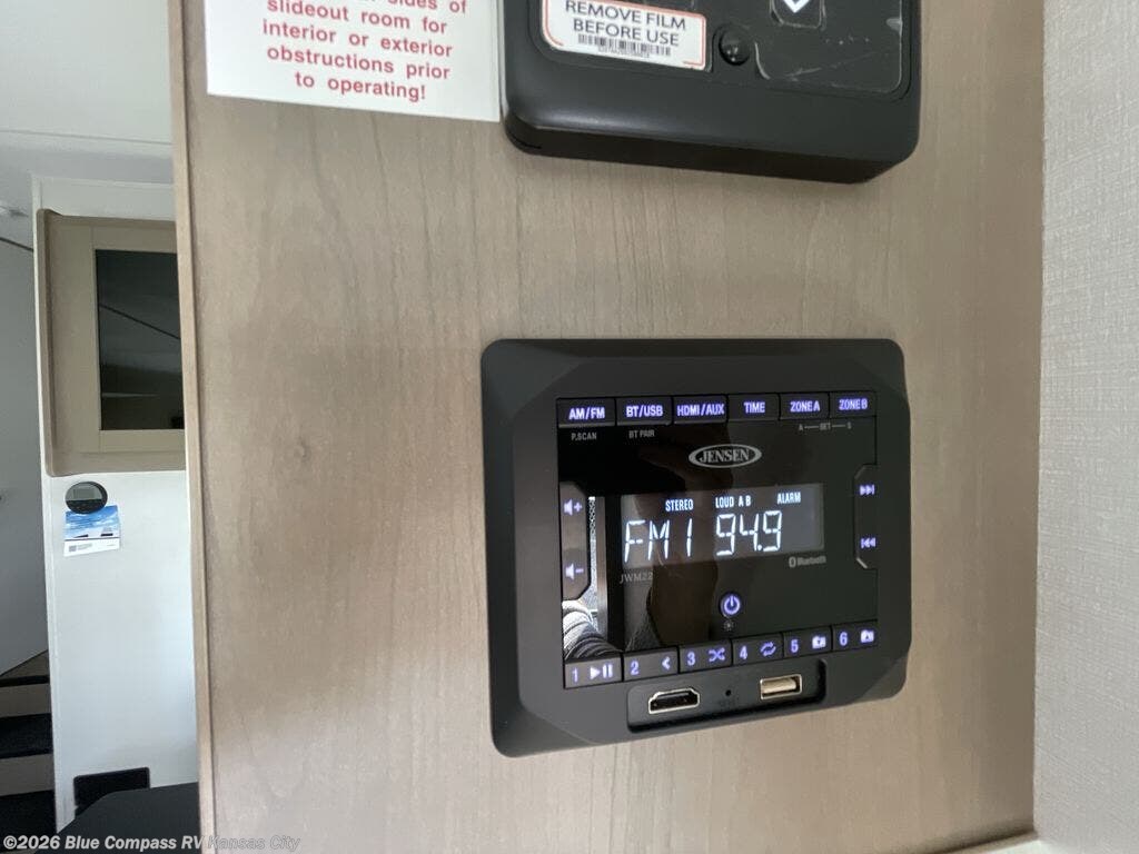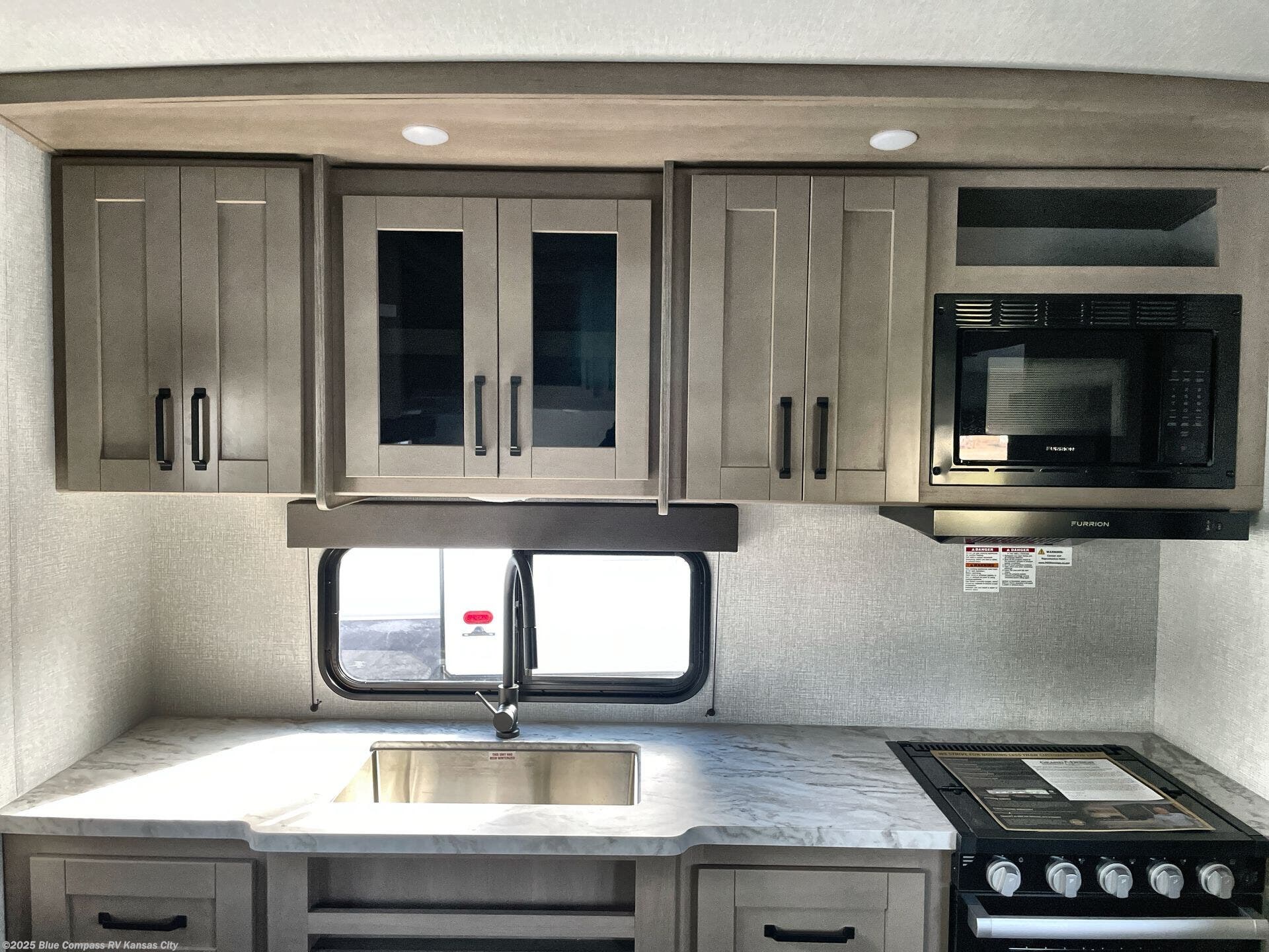 This rear kitchen fifth wheel is sure to meet all of your camping needs! Since the exterior length is only 26' 11", you can easily maneuver in and out of campgrounds. The rear kitchen includes ample counter space to prep meals, a three burner cooktop, and overhead storage for all your necessities. There is a 10 cu. ft. 12V refrigerator within the slide out that also includes the theater seating, and the U-shaped dinette provides a place to dine or play a card game. You will appreciate having convenient storage by the entry door, along with pull-out pet bowls, a functional wardrobe closet in the bedroom and an exterior pass-thru for belongings and camping gear. When you're ready to turn in for the night, the queen bed is sure to bring a great night's rest, while your guests sleep on the booth dinette or optional tri-fold sofa if you replace the theater seating!