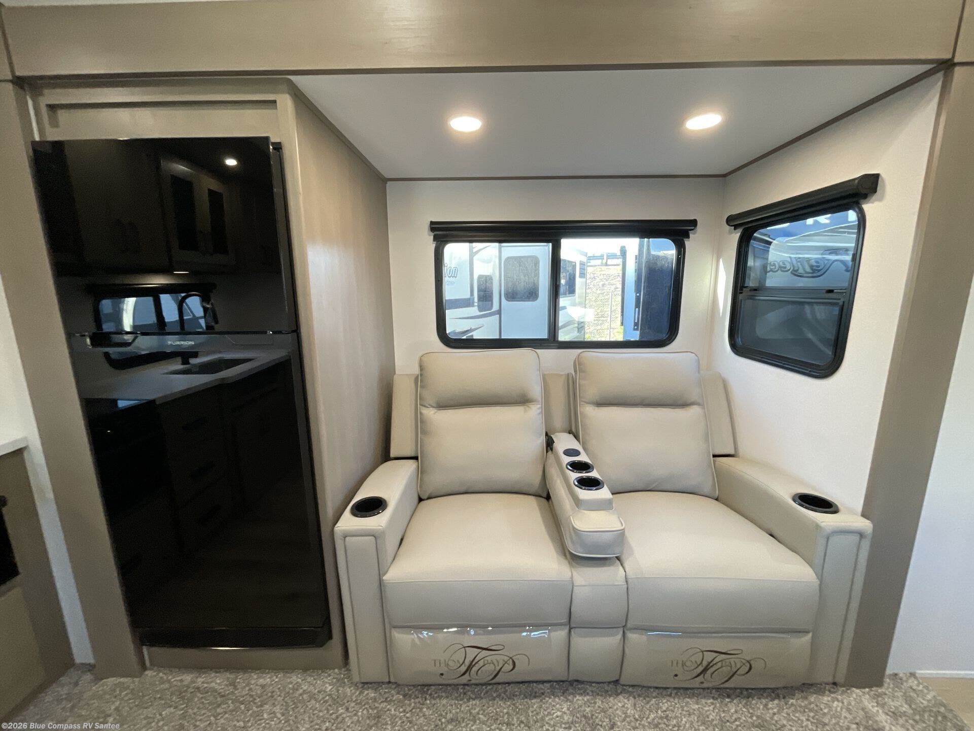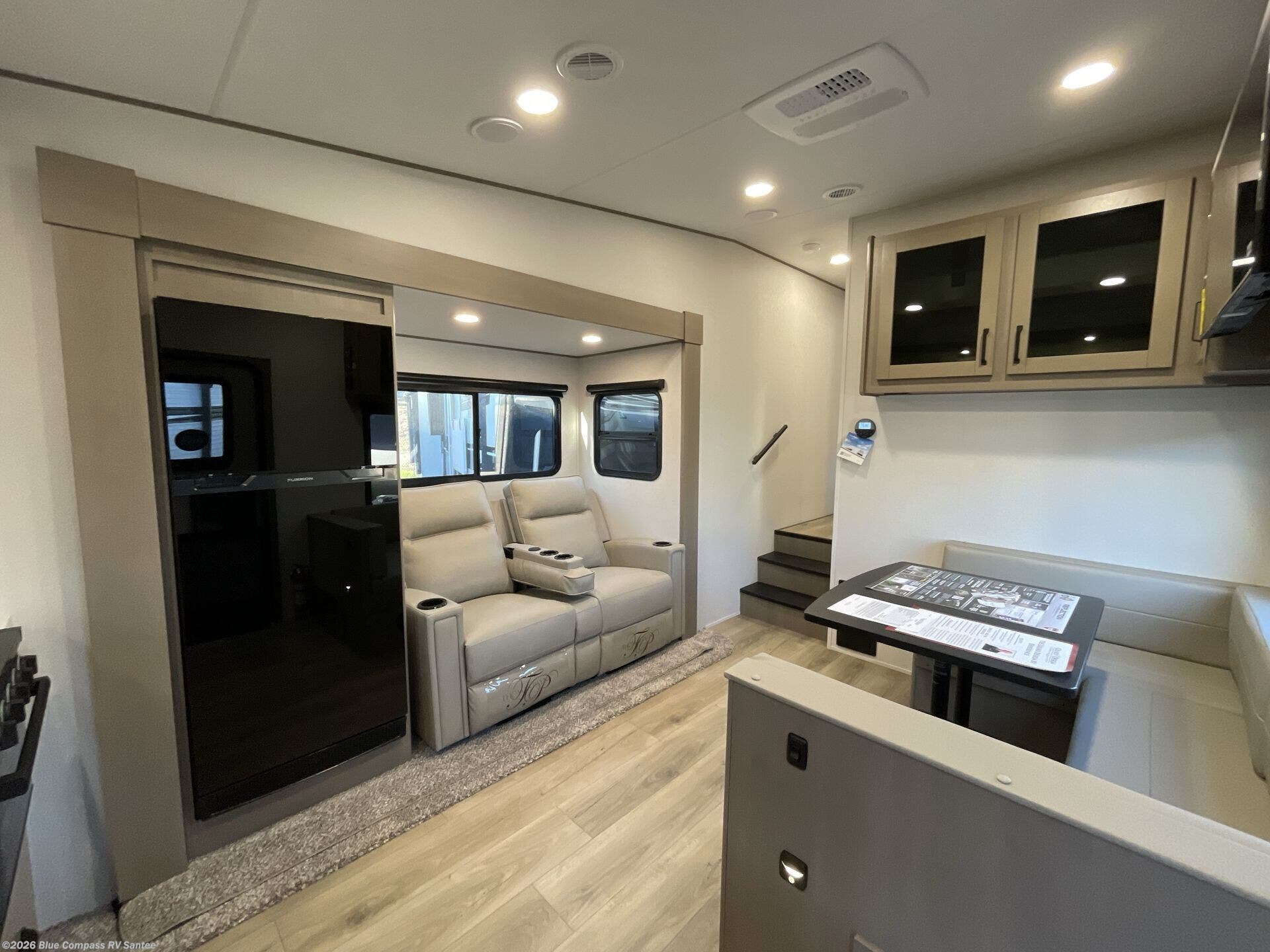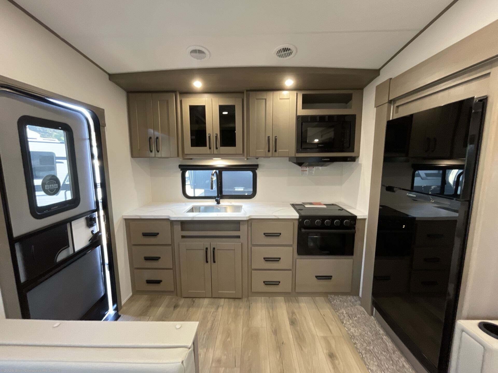 This rear kitchen fifth wheel is sure to meet all of your camping needs! Since the exterior length is only 26' 11", you can easily maneuver in and out of campgrounds. The rear kitchen includes ample counter space to prep meals, a three burner cooktop, and overhead storage for all your necessities. There is a 10 cu. ft. 12V refrigerator within the slide out that also includes the theater seating, and the U-shaped dinette provides a place to dine or play a card game. You will appreciate having convenient storage by the entry door, along with pull-out pet bowls, a functional wardrobe closet in the bedroom and an exterior pass-thru for belongings and camping gear. When you're ready to turn in for the night, the queen bed is sure to bring a great night's rest, while your guests sleep on the booth dinette or optional tri-fold sofa if you replace the theater seating!