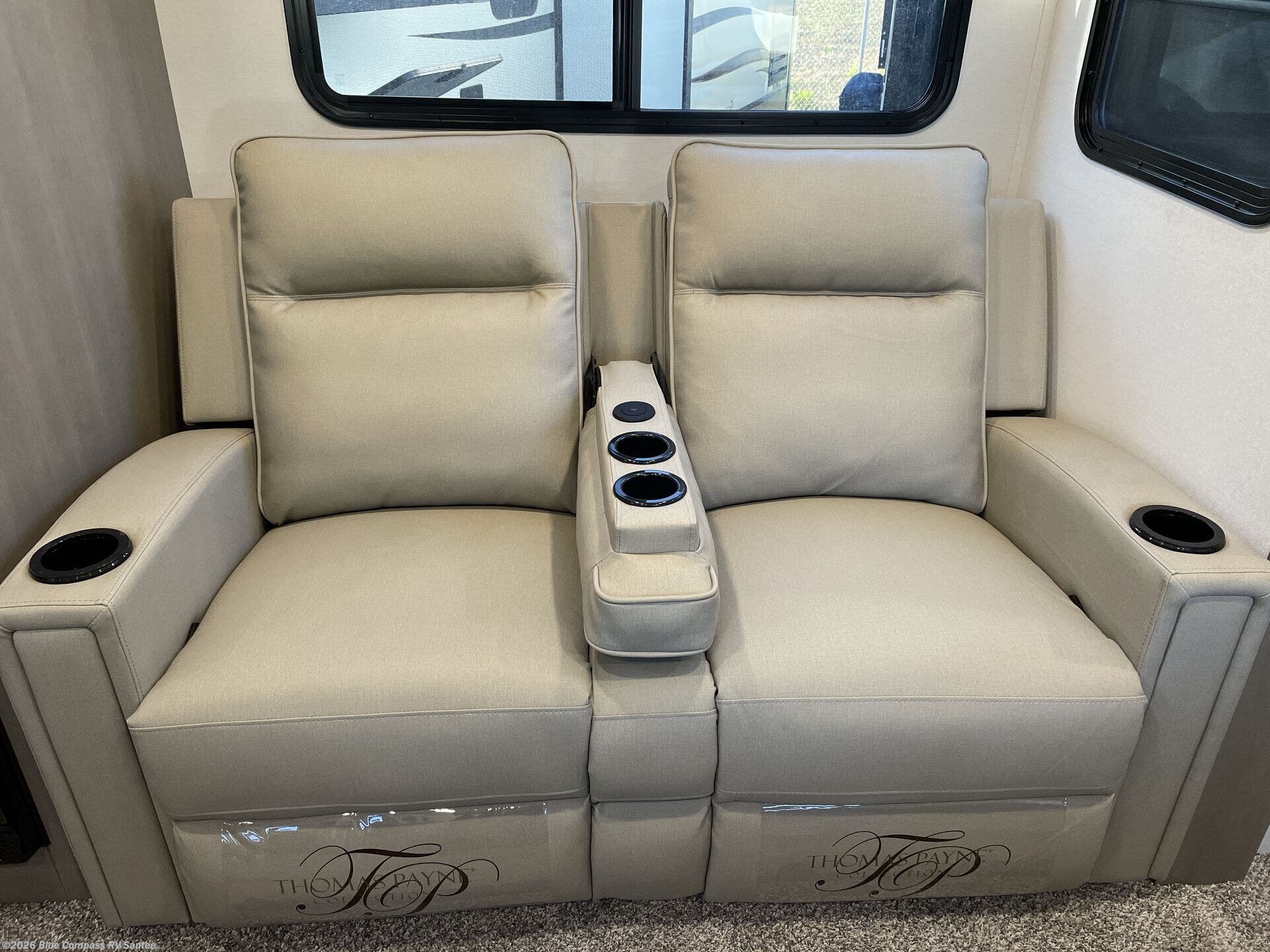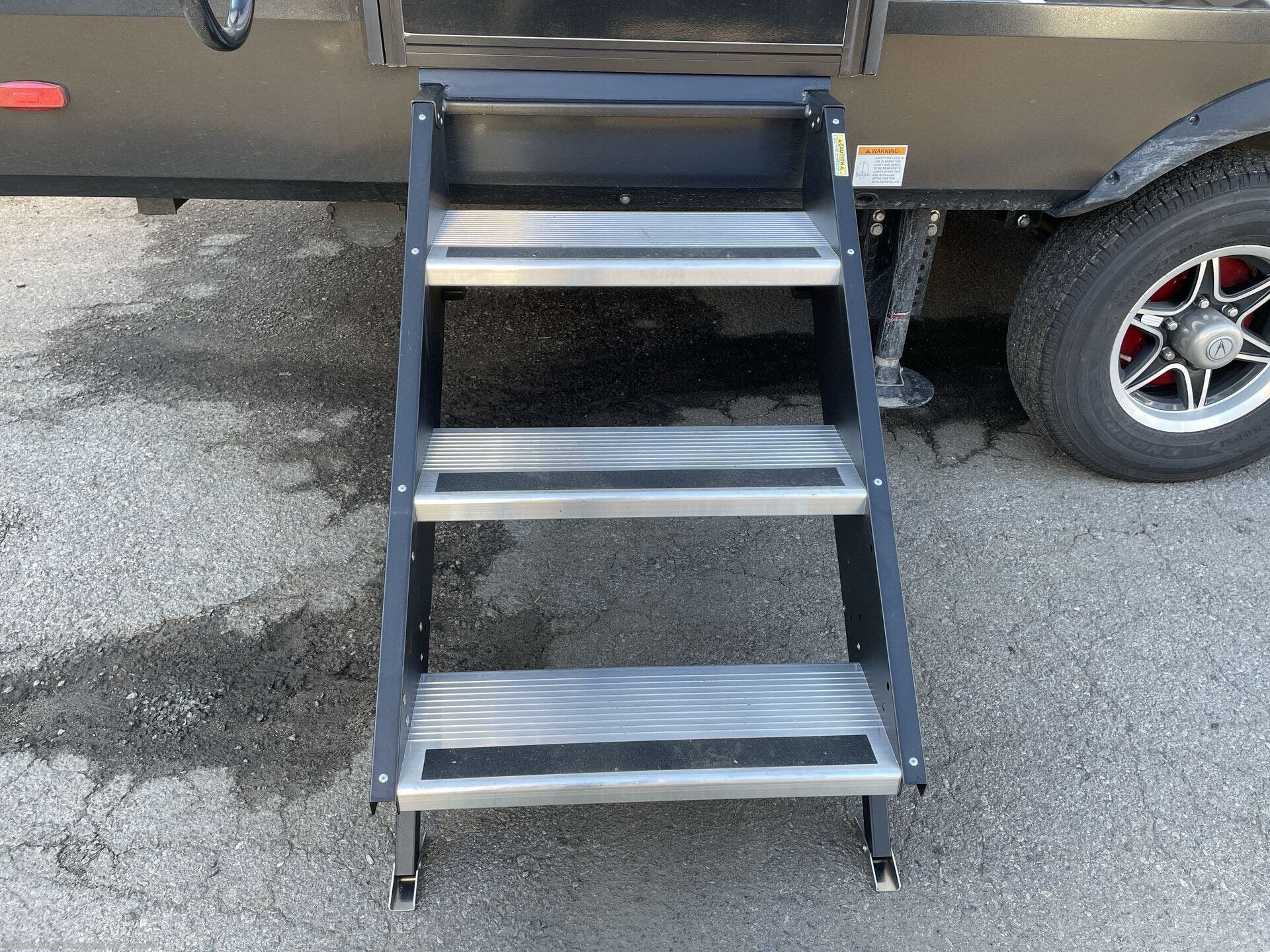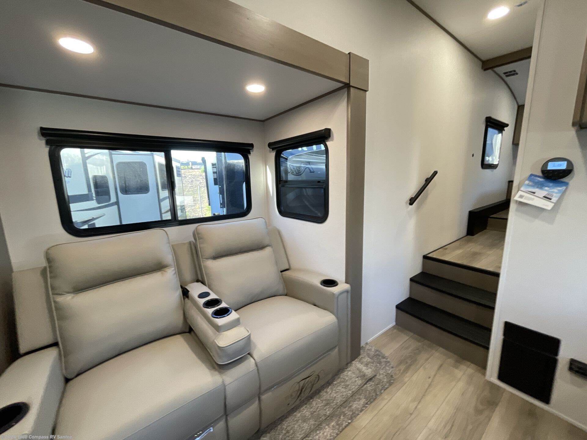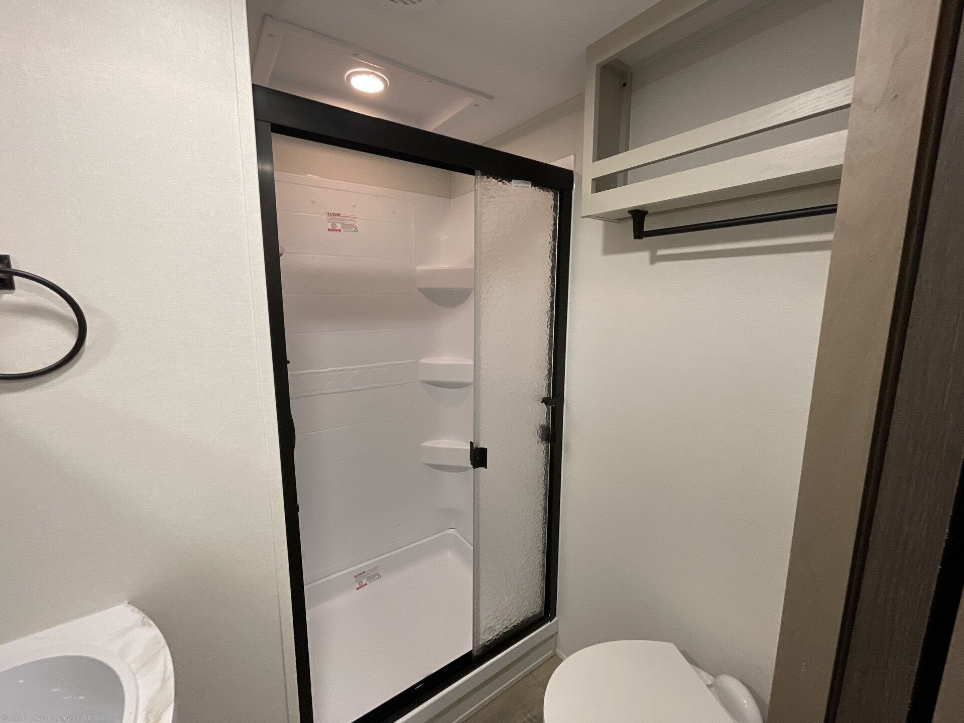 This rear kitchen fifth wheel is sure to meet all of your camping needs! Since the exterior length is only 26' 11", you can easily maneuver in and out of campgrounds. The rear kitchen includes ample counter space to prep meals, a three burner cooktop, and overhead storage for all your necessities. There is a 10 cu. ft. 12V refrigerator within the slide out that also includes the theater seating, and the U-shaped dinette provides a place to dine or play a card game. You will appreciate having convenient storage by the entry door, along with pull-out pet bowls, a functional wardrobe closet in the bedroom and an exterior pass-thru for belongings and camping gear. When you're ready to turn in for the night, the queen bed is sure to bring a great night's rest, while your guests sleep on the booth dinette or optional tri-fold sofa if you replace the theater seating!