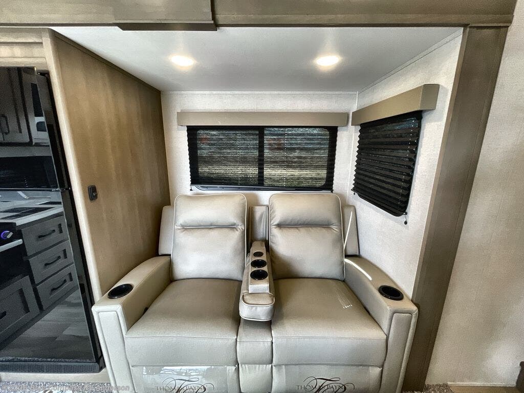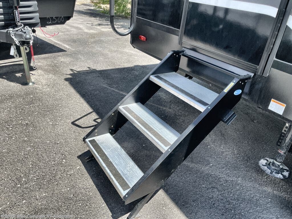 This rear kitchen fifth wheel is sure to meet all of your camping needs! Since the exterior length is only 26' 11", you can easily maneuver in and out of campgrounds. The rear kitchen includes ample counter space to prep meals, a three burner cooktop, and overhead storage for all your necessities. There is a 10 cu. ft. 12V refrigerator within the slide out that also includes the theater seating, and the U-shaped dinette provides a place to dine or play a card game. You will appreciate having convenient storage by the entry door, along with pull-out pet bowls, a functional wardrobe closet in the bedroom and an exterior pass-thru for belongings and camping gear. When you're ready to turn in for the night, the queen bed is sure to bring a great night's rest, while your guests sleep on the booth dinette or optional tri-fold sofa if you replace the theater seating!