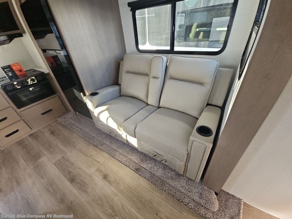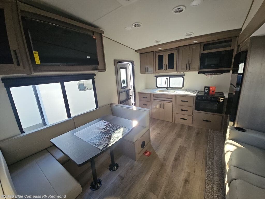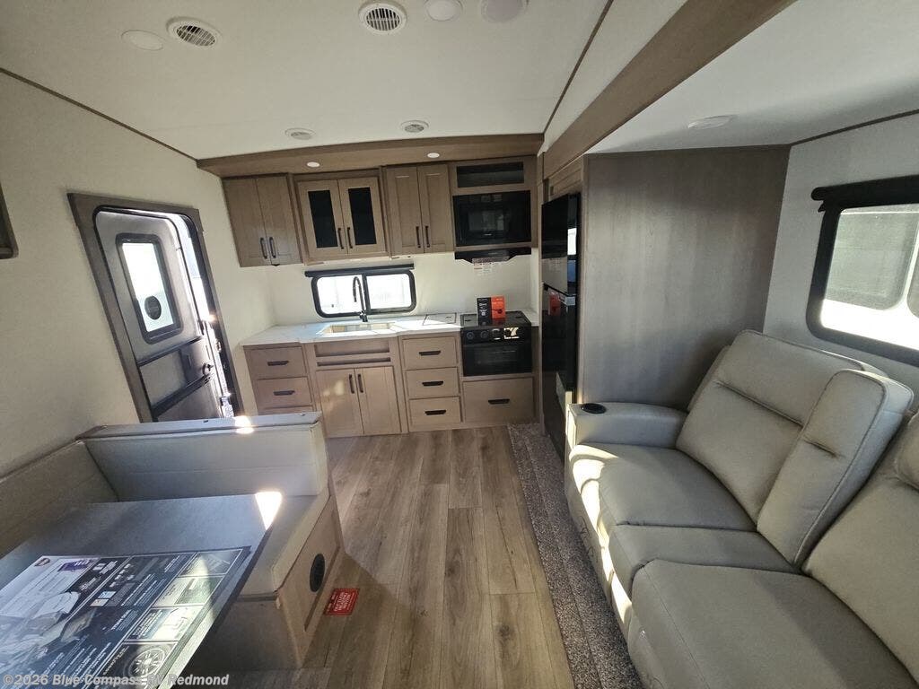 This rear kitchen fifth wheel is sure to meet all of your camping needs! Since the exterior length is only 26' 11", you can easily maneuver in and out of campgrounds. The rear kitchen includes ample counter space to prep meals, a three burner cooktop, and overhead storage for all your necessities. There is a 10 cu. ft. 12V refrigerator within the slide out that also includes the theater seating, and the U-shaped dinette provides a place to dine or play a card game. You will appreciate having convenient storage by the entry door, along with pull-out pet bowls, a functional wardrobe closet in the bedroom and an exterior pass-thru for belongings and camping gear. When you're ready to turn in for the night, the queen bed is sure to bring a great night's rest, while your guests sleep on the booth dinette or optional tri-fold sofa if you replace the theater seating!