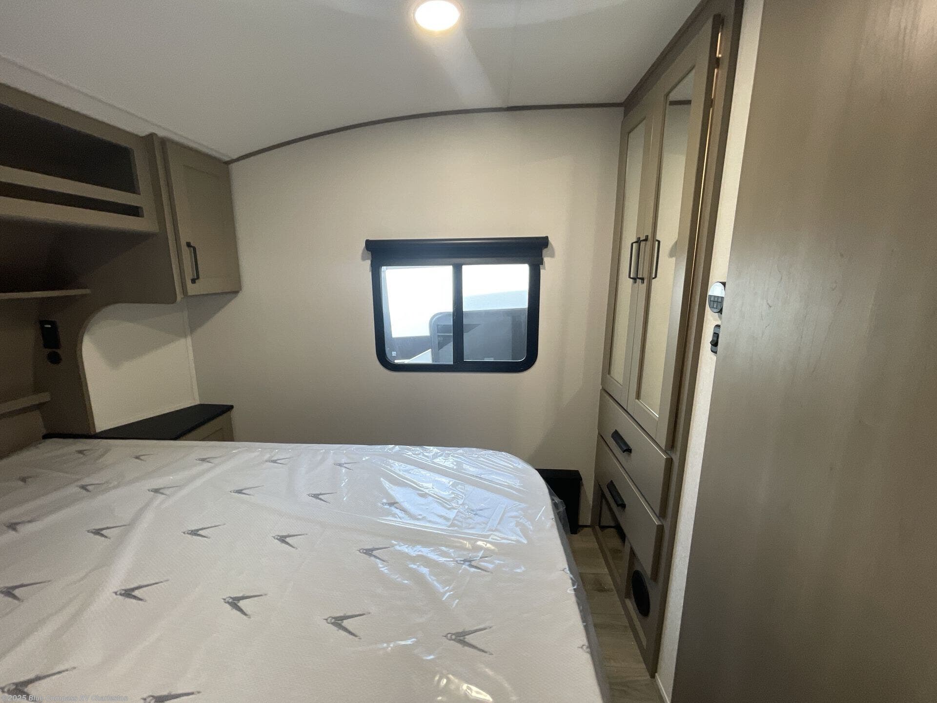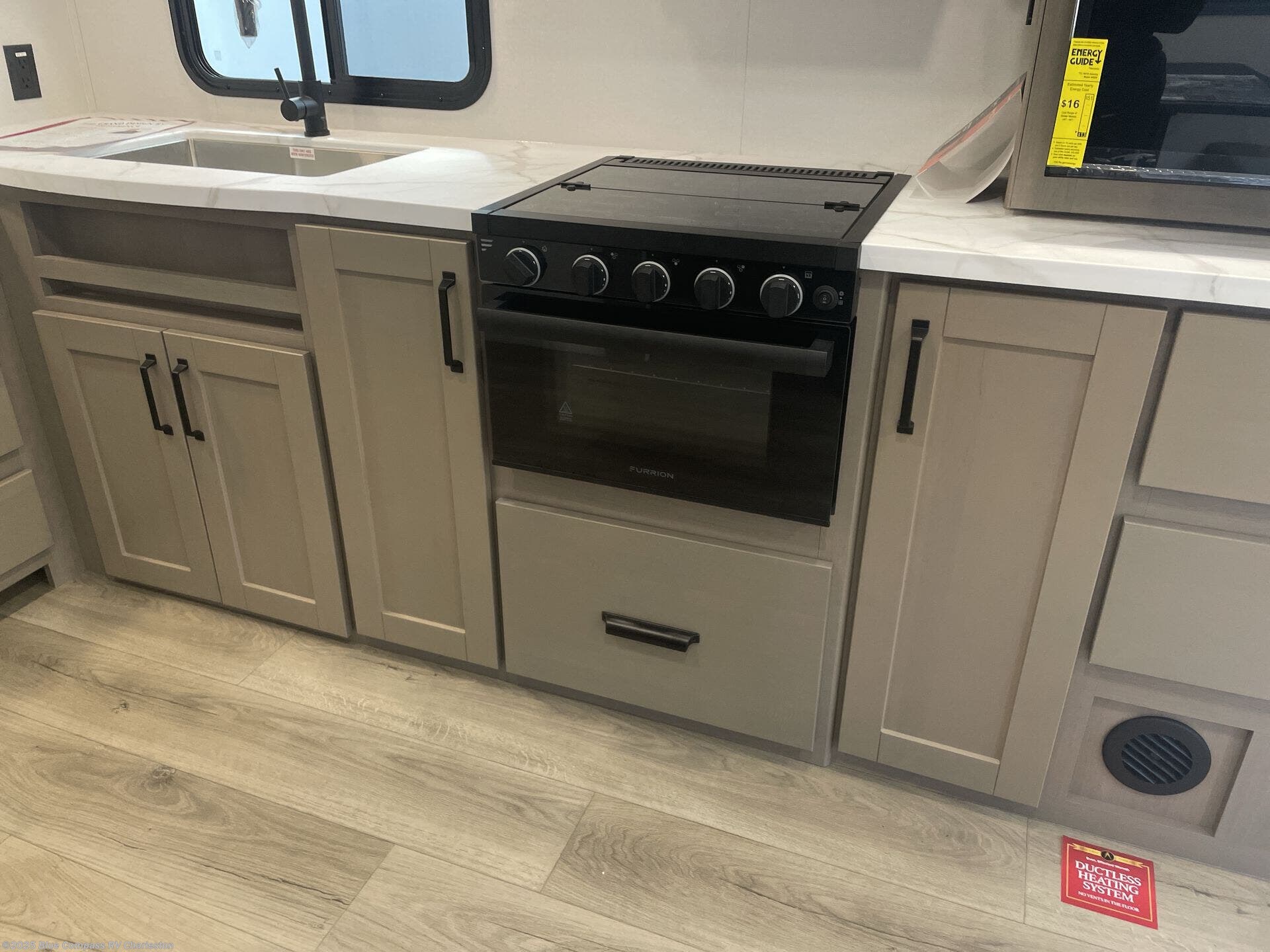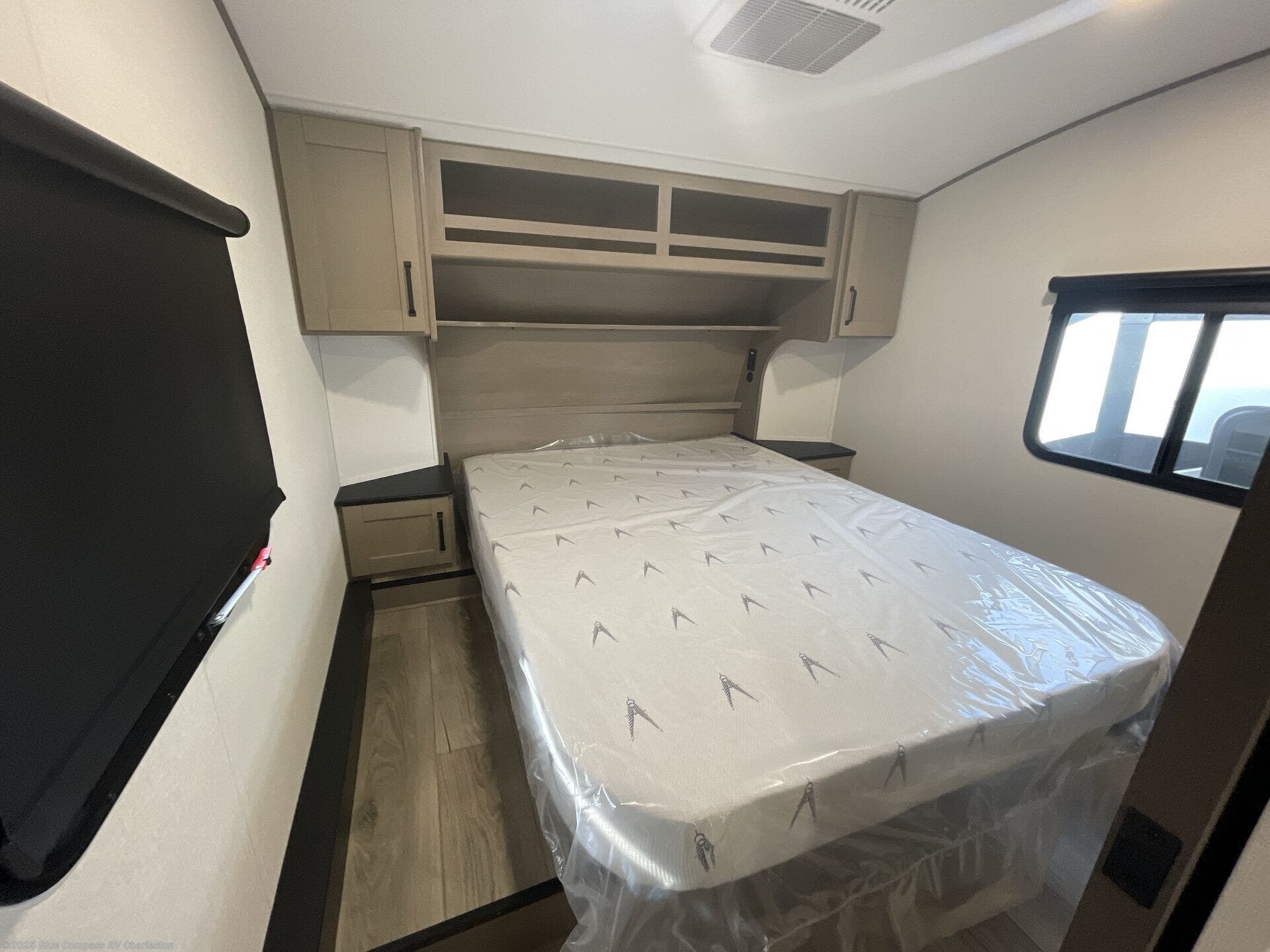 This is the perfect couple's trailer with a space for an overnight guest or two little ones on the booth dinette. You can switch out this dinette for an optional swivel dinette as well, and the standard theater seating can be replaced by an optional trundle bed if you need more sleeping space. A 40" HDTV will keep you entertained when the weather isn't cooperating, and you can whip up your best meals in the full kitchen. And a 19' power awning will provide shade if you choose to take your plate outdoors! The spacious full bath will let you clean up each day, and you'll feel right at home in the front private bedroom with a queen bed!