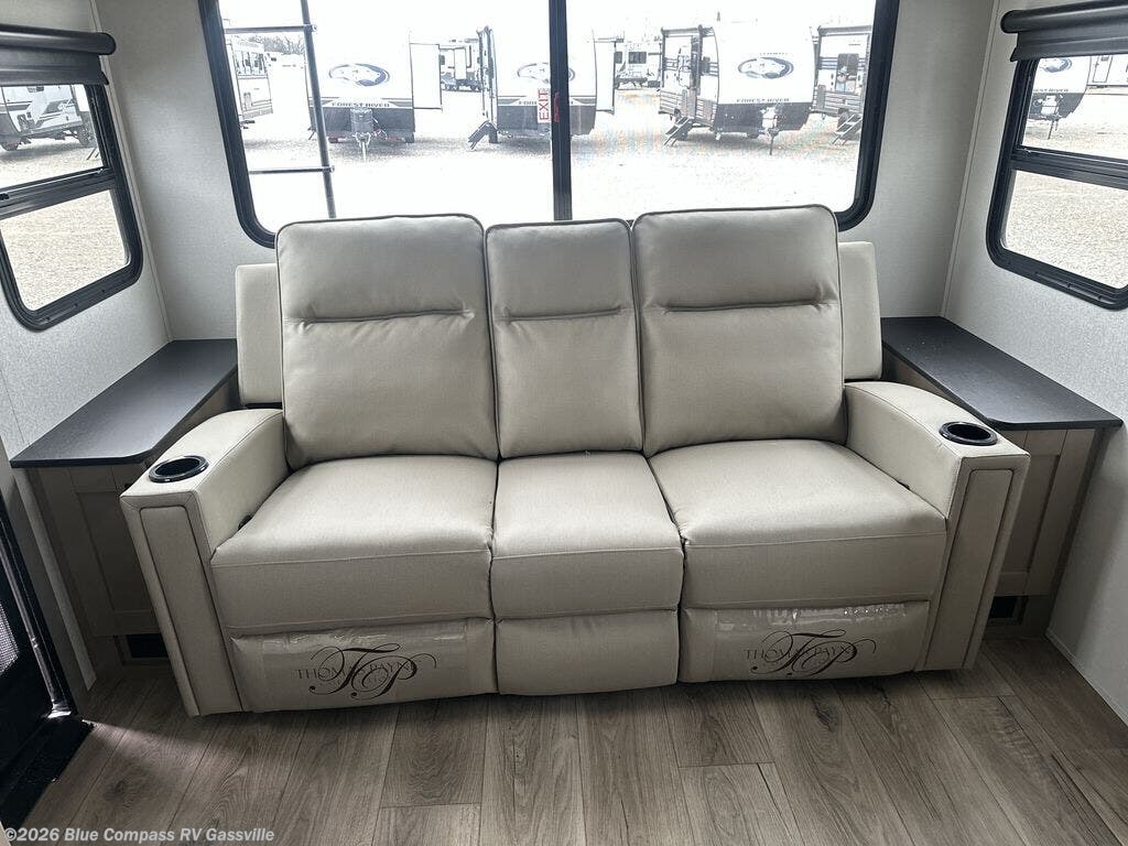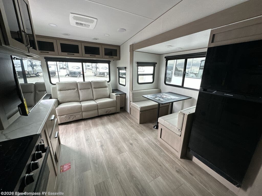 This is the perfect couple's trailer with a space for an overnight guest or two little ones on the booth dinette. You can switch out this dinette for an optional swivel dinette as well, and the standard theater seating can be replaced by an optional trundle bed if you need more sleeping space. A 40" HDTV will keep you entertained when the weather isn't cooperating, and you can whip up your best meals in the full kitchen. And a 19' power awning will provide shade if you choose to take your plate outdoors! The spacious full bath will let you clean up each day, and you'll feel right at home in the front private bedroom with a queen bed!